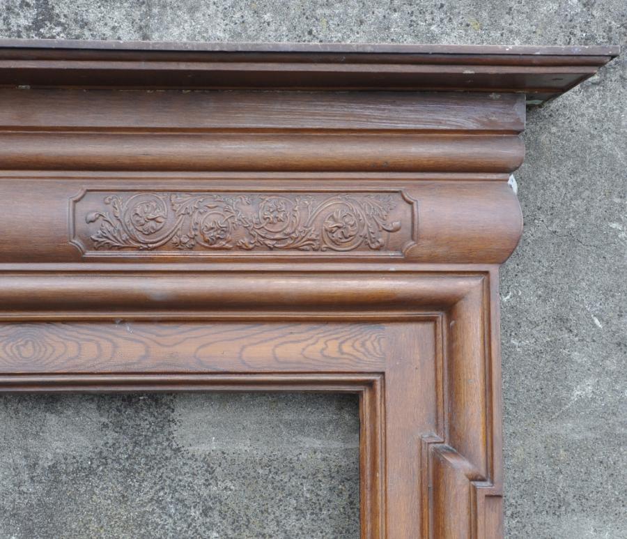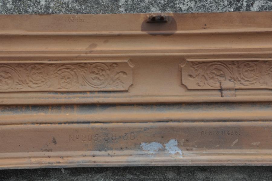 A handsome art nouveau cast iron surround with inset floral panels to the moulded frieze and original wood grained finish.Good, heavy quality, intact. There are two other surrounds from the same Blackburn pub propert and a pair of inserts which fit this surround. ( see other ads) Dimensions in inches/cms; Shelf is 61/155 by 10.75/27 deep, body is 53/135 wide, height is 55.75/141.5. Opening is 37.5" wide by 37.75" high ie 38x38" insert.