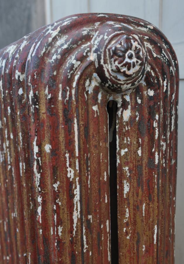 A rare and attractive reeded princess antique cast iron radiator with decorative scrolled feet. Many layers of paint have been hand stripped and scraped to get to the earler red and gold layers and then waxed. Dimensions in inches/cms; 33/84 wide at the top including the decorative stops. 31.5/80 high 8.5/21.5 deep SOLD