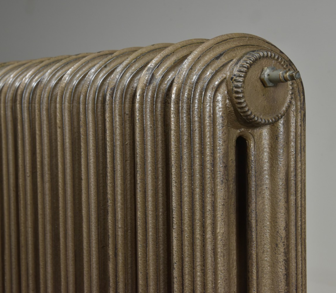 A very rare antique cast iron radiator with fluted round topped double columns and legs. I have only owned or seen one of this type. Burnished to remove any rust but keeping the original paint, waxed and polished. Sold as is ( pressure tested and ready to plumb to a modern heating system). This is unusually heavy for its size (even for a cast iron radiator) Dimensions in inches/cm 32"/81.5cm tall. 38.5"/98cm wide (not including bleeder valve) 7.25"/18.5cm deep. For more / higher res images please see my blog which can be accessed through the news section of this (haes) website