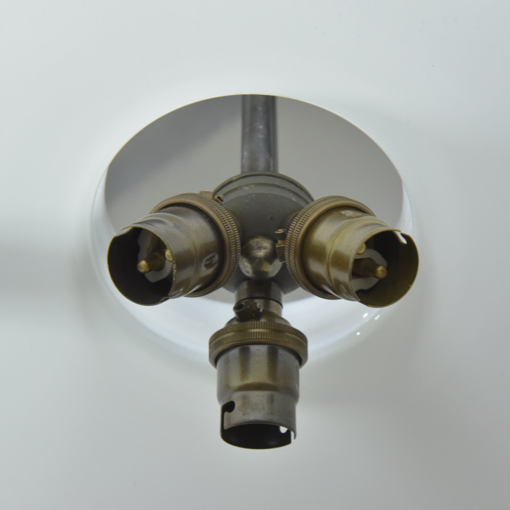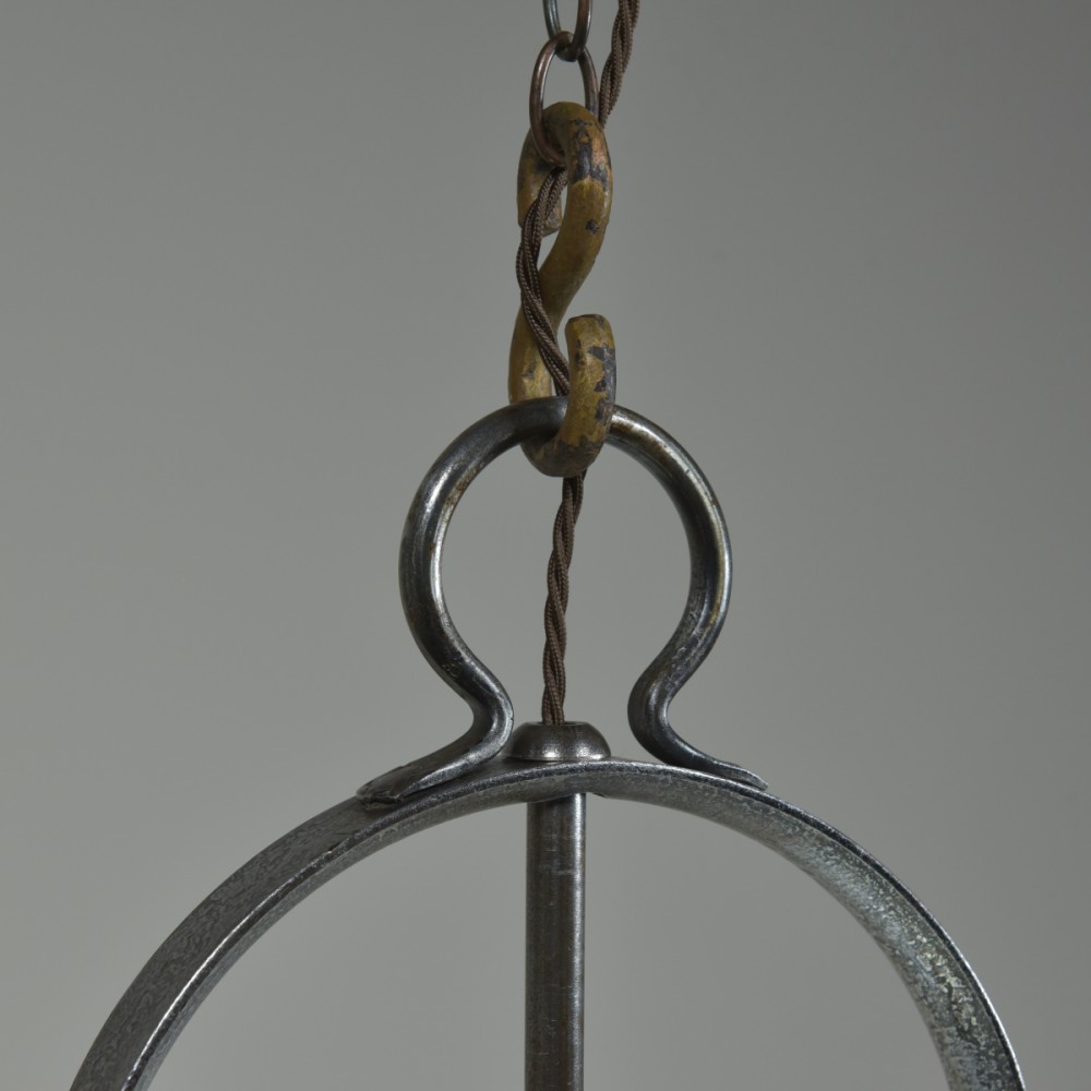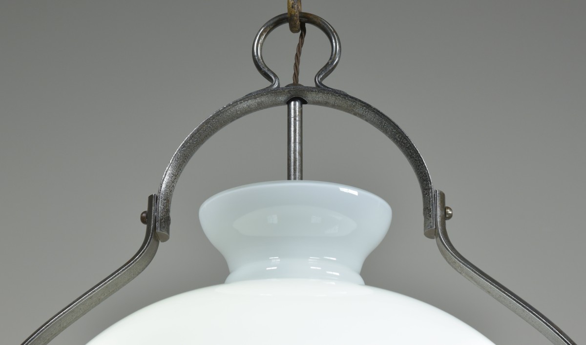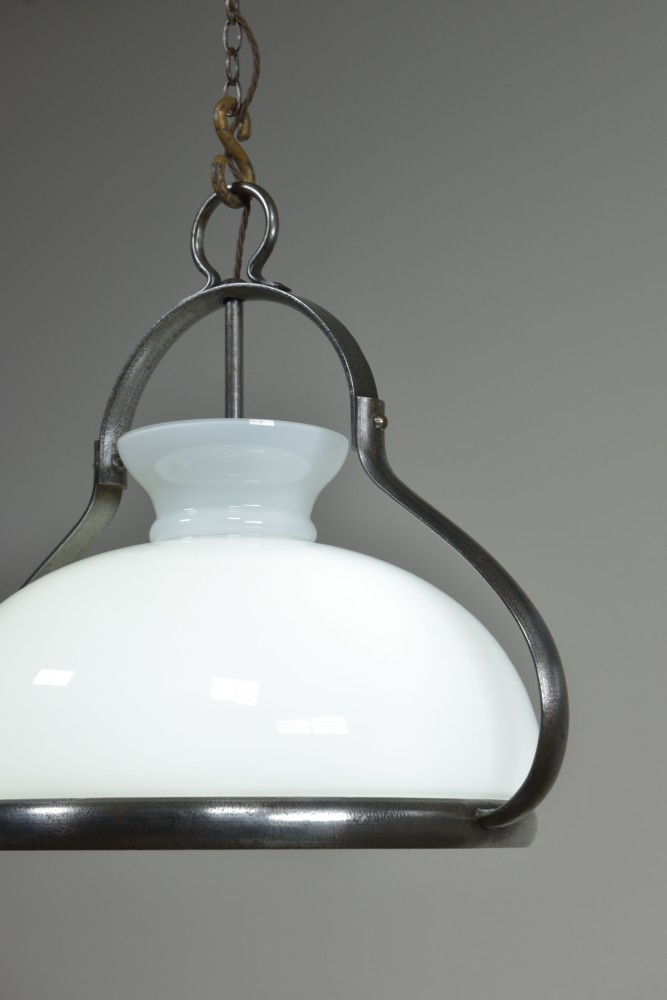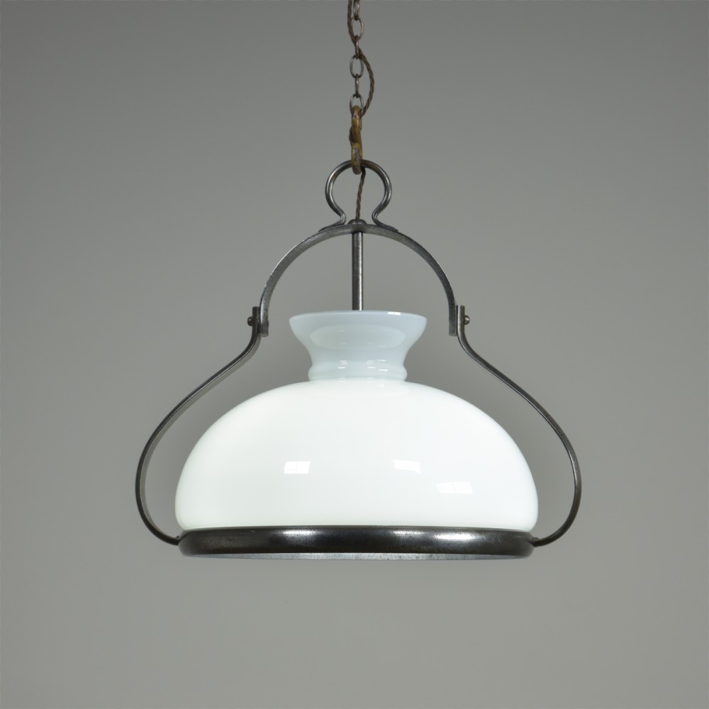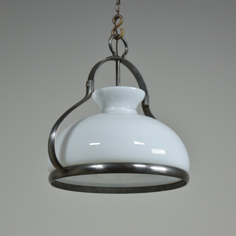 An antique iron mounted opal shade hanging light of large proportions. Excellent quality, heavy duty, beautifully made. French c1950 or a bit earlier with a c1900 hand blown opal glass shade. The large opal "oil lamp" shade supported by a substantial rivetted construction iron frame with the central stem terminating in a 3 x BC lampholder manifold. All thoroughly cleaned, rubbed up and clear waxed (x3). Rewired with 2m dark brown fabric flex and 3 new patinated brass lampholders. Dimensions in inches/cms; 19"/48cm tall x 21"/53cm max width. Opal shade is 17"/43 cm in diameter x 10.5"/27cm tall. Iron ring is 16.75"/ 42.5cm diameter. 7.85kg (shade only is 3.1kg). For more / higher res images please see my blog which can be accessed through the news section of this (haes) website.