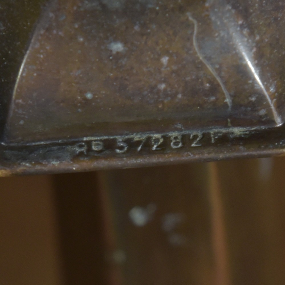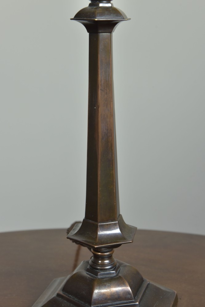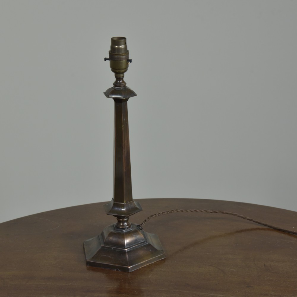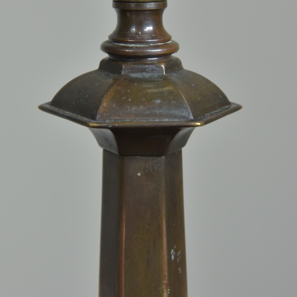 A good hexagonal brass lamp with exceptional original colour / patination. English, 1910. Stamped with it's registered design number 572821 dating it to 1910. A trip to Kew Gardens would be needed to ascertain the maker etc. Excellent quality and condition, lightly cleaned, rewired with 2.25m fabric flex,patinated safety-switched lampholder, 3amp traditional phenolic plug. New fabric base. Pat tested. Dimensions in inches/cms; 14.5"/37cm tall. 6"/15cm base diameter. 2.8kg weight. Please note i have a a similar pair of lamps by GEC and a further similar pair with reeded shafts. For more / higher res images please see my blog which can be accessed through the news section of this (haes) website.