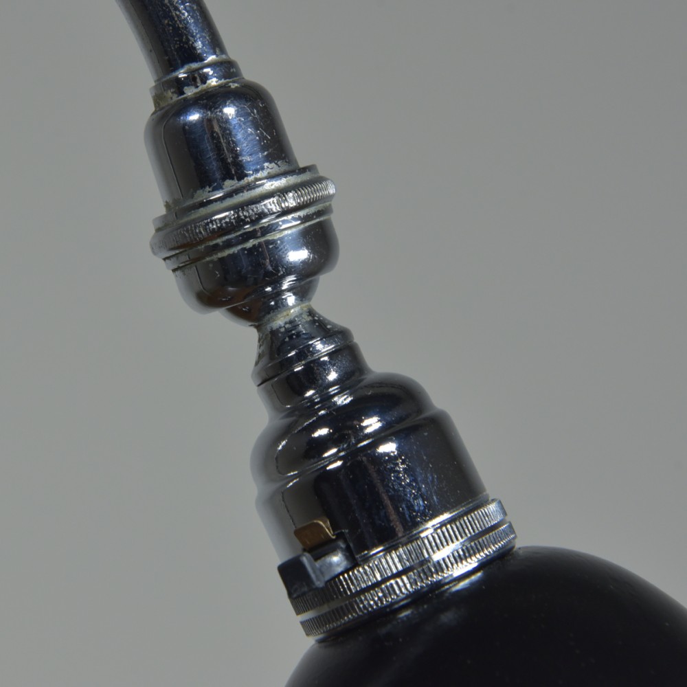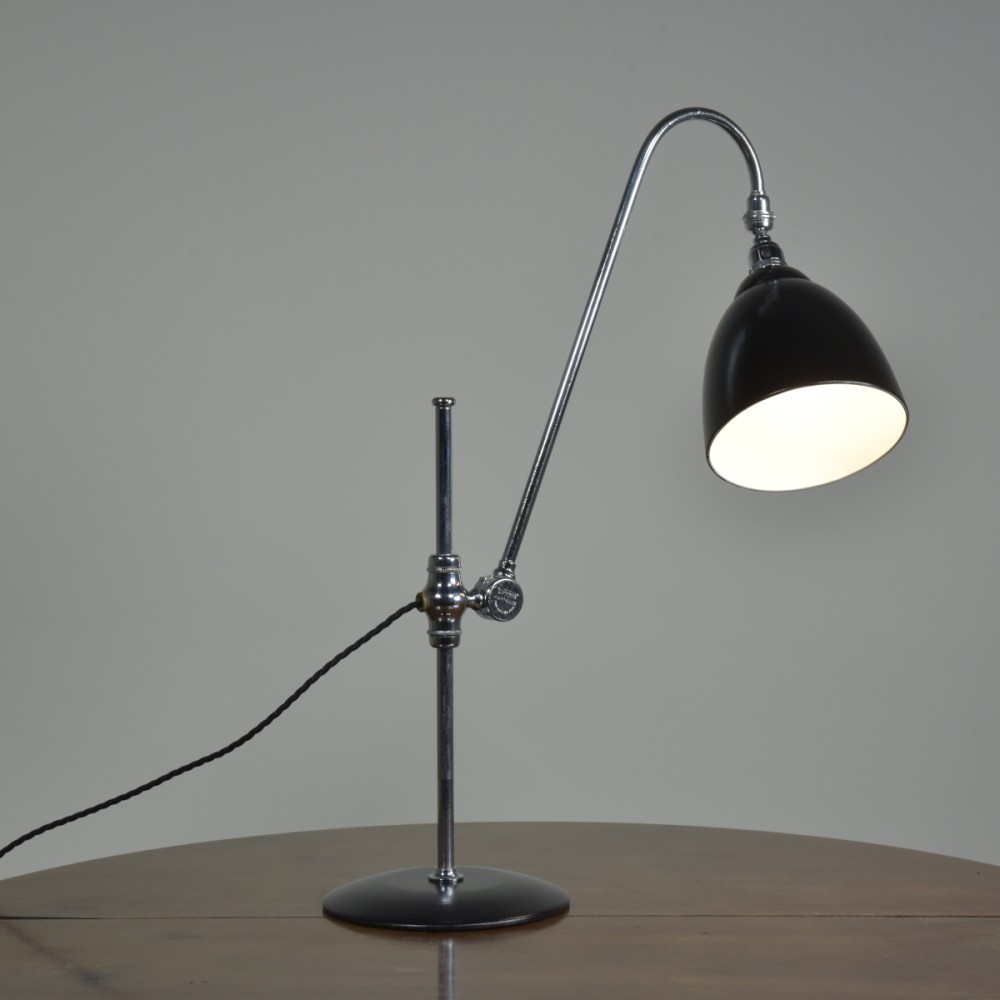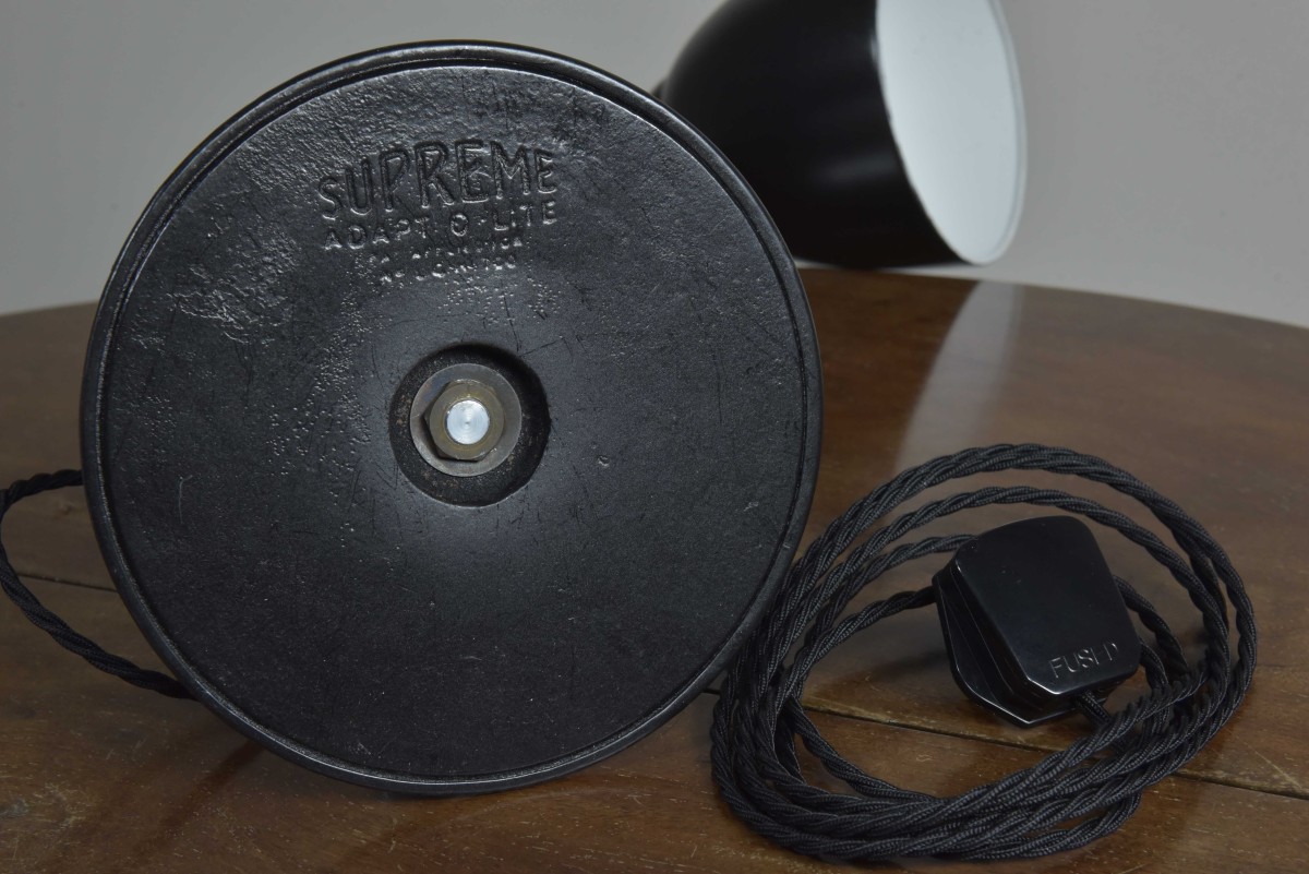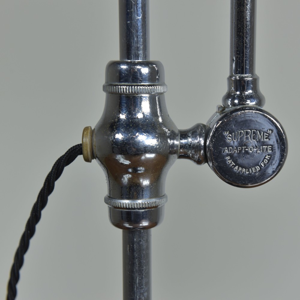 An antique desk / office / work lamp marked "Supreme" ADAPT-O-LITE to the central riser mechanism and the base. English 1920s-30s. Reminiscent of the somewhat famous Churchill associated Robert Dudley Best "Bestlite" table lamp. I don't know if this was designed / produced earlier or later or whether one influenced the other but i would guess this is a slightly earlier lamp. It hasn't achieved the (lampworld) iconic status of the Bestlite lamp but is certainly a standout design of early 20th century British lighting. A great task light. An excellent, table or work lamp and hard to find. Fully adjustable, works perfectly, everything stays exactly in place and steady even in it's most extended position. Made from chromed brass with a spun aluminium shade and a cast iron weighted base.The height adjusts by a clever spring loaded / friction mechanism that moves up and down the central stem.The angle of the arm adjusts and the shade is also adjustable,being attached to the arm with a ball and socket joint. The lamp has been completely dis-assembled, cleaned, re-sprayed, polished,rebuilt and rewired with 3.5 meters black fabric flex, chromed brass safety-switched lampholder and a 3amp plug. Pat tested. Dimensions in inches/cms; 30.5"/77cms maximum height to apex of arm bend (vertical). 17"/43cms height (of central stem) Base is 8"/20cms diameter Max width is 24"/61cms Weight is 3.2kg. For more / higher res images please see my blog which can be accessed through the news section of this (haes) website.
