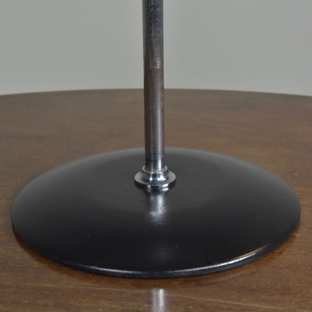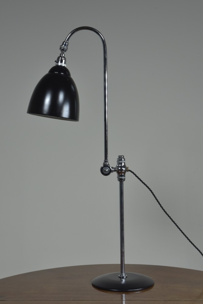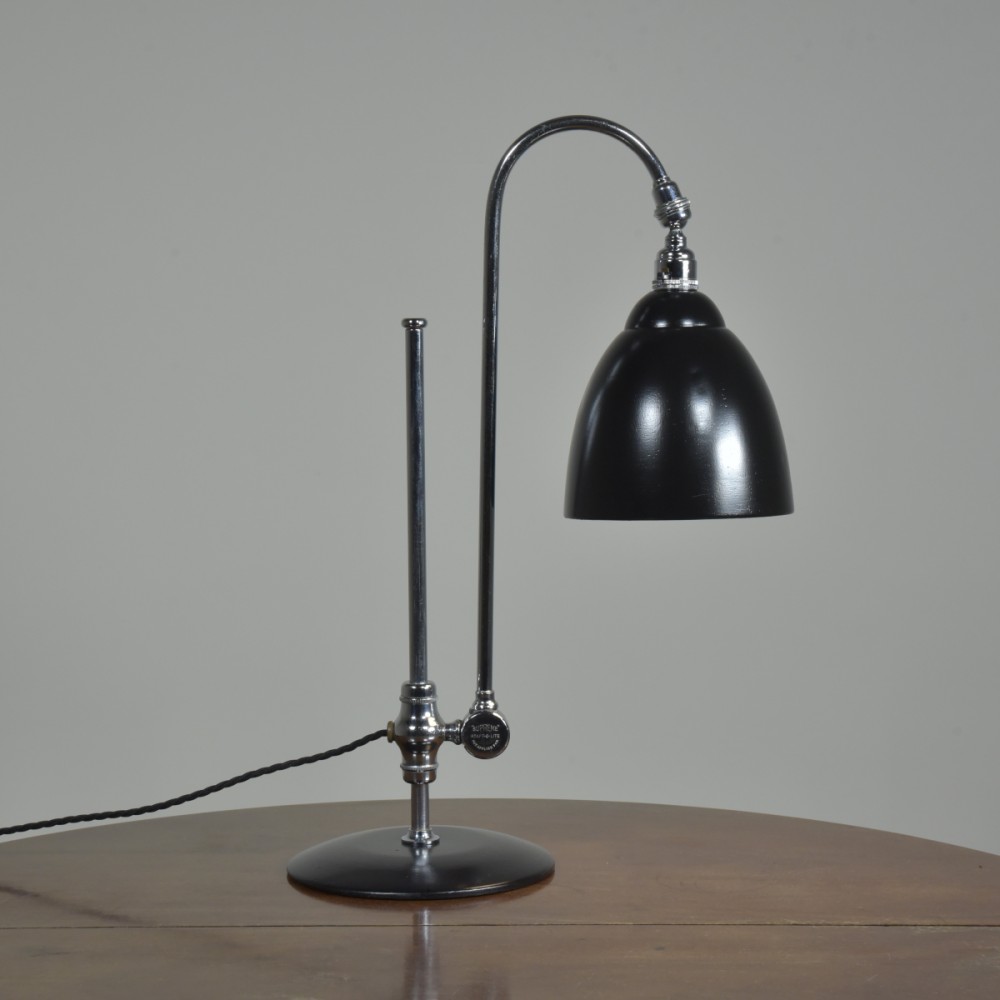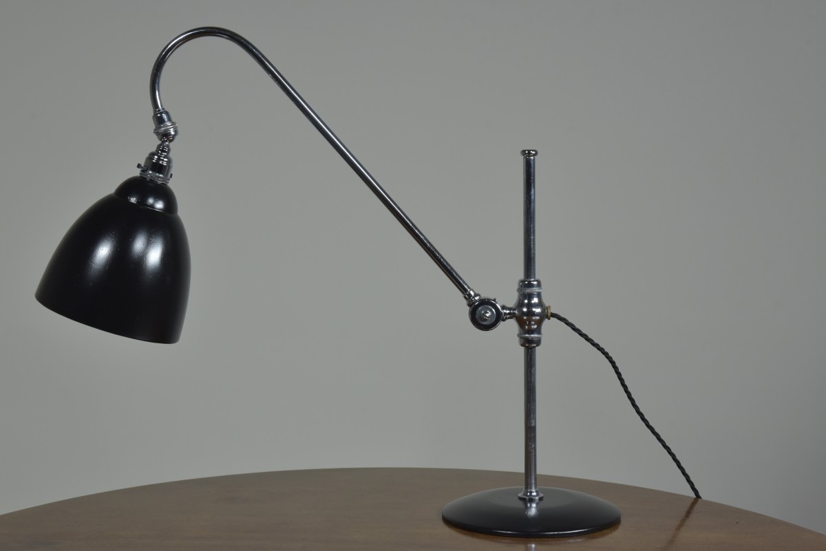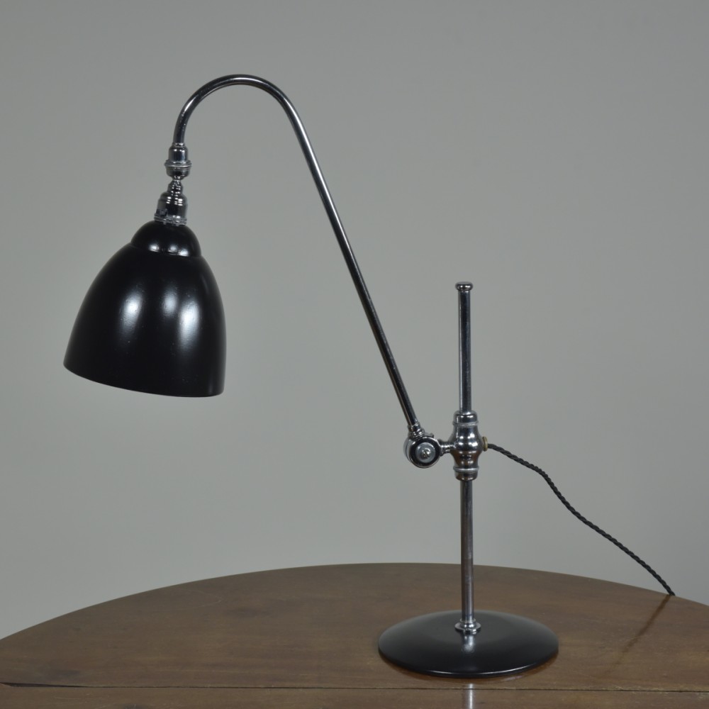 An antique desk / office / work lamp marked "Supreme" ADAPT-O-LITE to the central riser mechanism and the base. English 1920s-30s. Reminiscent of the somewhat famous Churchill associated Robert Dudley Best "Bestlite" table lamp. I don't know if this was designed / produced earlier or later or whether one influenced the other but i would guess this is a slightly earlier lamp. It hasn't achieved the (lampworld) iconic status of the Bestlite lamp but is certainly a standout design of early 20th century British lighting. A great task light. An excellent, table or work lamp and hard to find. Fully adjustable, works perfectly, everything stays exactly in place and steady even in it's most extended position. Made from chromed brass with a spun aluminium shade and a cast iron weighted base.The height adjusts by a clever spring loaded / friction mechanism that moves up and down the central stem.The angle of the arm adjusts and the shade is also adjustable,being attached to the arm with a ball and socket joint. The lamp has been completely dis-assembled, cleaned, re-sprayed, polished,rebuilt and rewired with 3.5 meters black fabric flex, chromed brass safety-switched lampholder and a 3amp plug. Pat tested. Dimensions in inches/cms; 30.5"/77cms maximum height to apex of arm bend (vertical). 17"/43cms height (of central stem) Base is 8"/20cms diameter Max width is 24"/61cms Weight is 3.2kg. For more / higher res images please see my blog which can be accessed through the news section of this (haes) website.