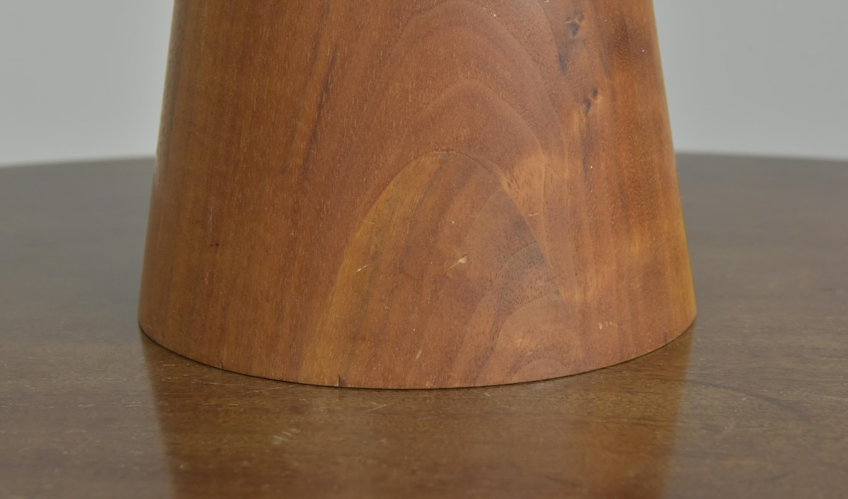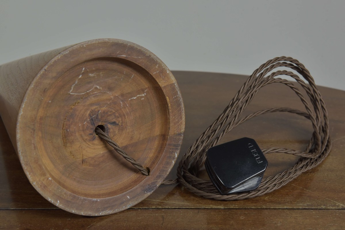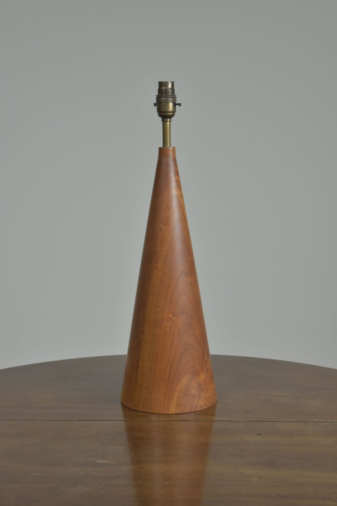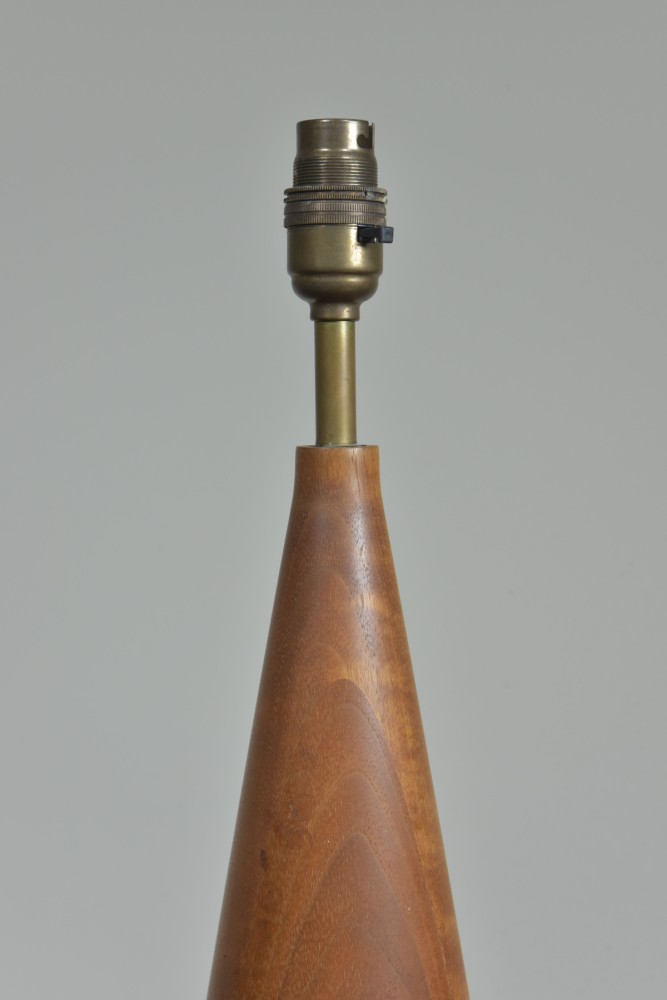 A tall turned conical hardwood / teak? table lamp. Canada, mid century. Excellent condition. Rewired with 3m fabric flex, patinated safety-switched lampholder, 3amp traditional phenolic plug. Pat tested. Dimensions in inches/cms; 19.5"/49.5cm cm tall inc. lampholder. approx 6"/15.5cm base diameter. 2.2kg weight. For more / higher res images please see my blog which can be accessed through the news section of this (haes) website.