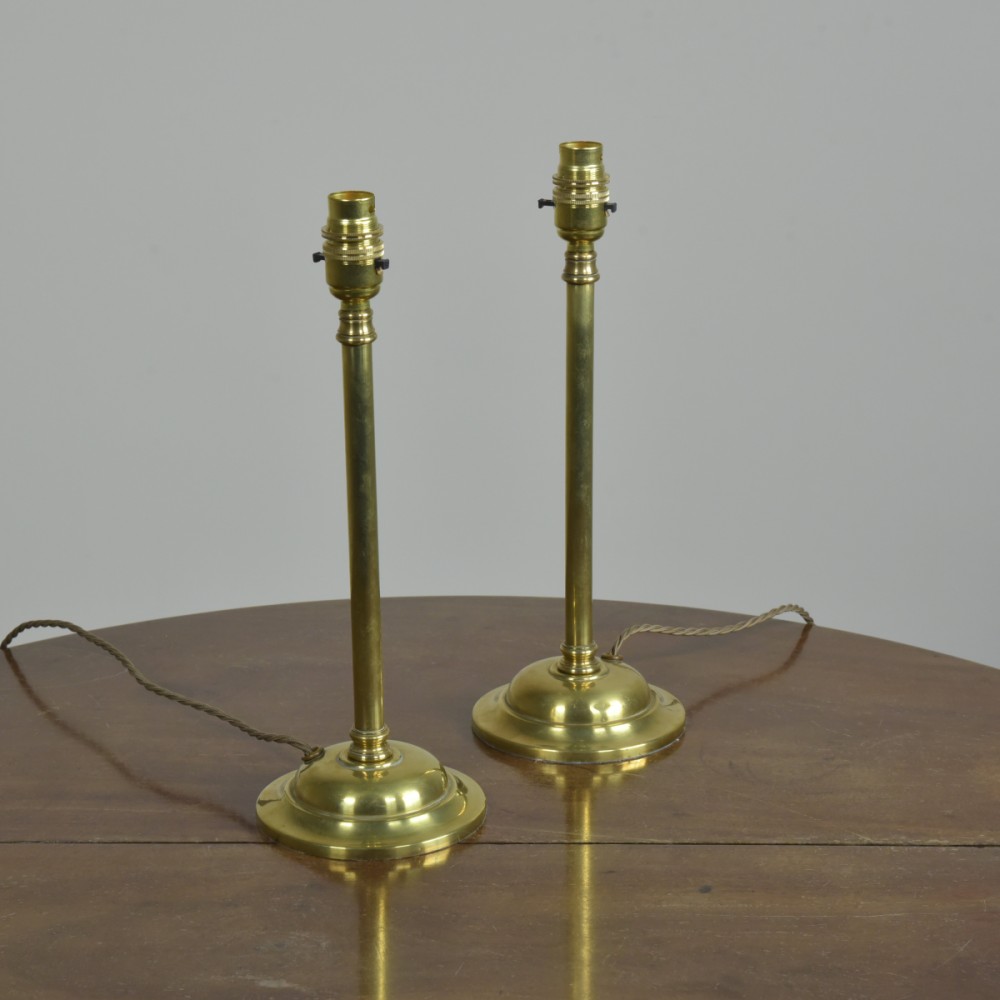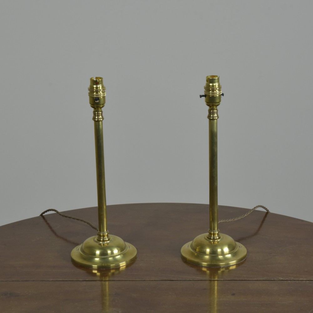 An antique pair of plain stemmed brass GEC table lamps with decorative collars and circular (cast iron weighted) bases. English pre mid century. Rewired with 2.5m fabric flex, brass safety-switched BC lampholders and traditional 3amp phenolic plugs. New fabric bases. Pat tested. Dimensions in inches/cms; 13.5"/34cm tall. Approx 5"/12.5cm base diameter. Priced for the pair. Please note i have a second pair of similar lamps with reeded stems and similar single lamps. For more / higher res images please see my blog which can be accessed through the news section.