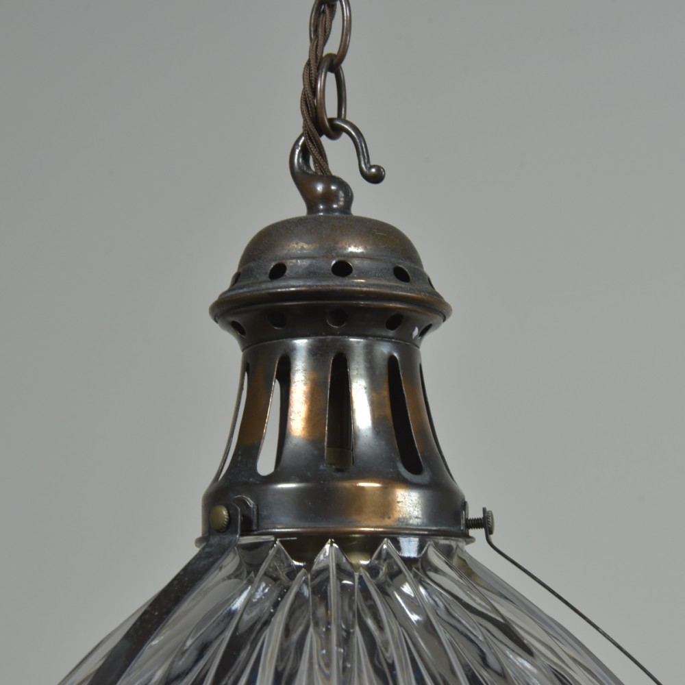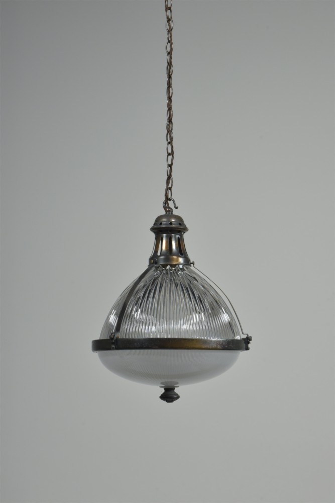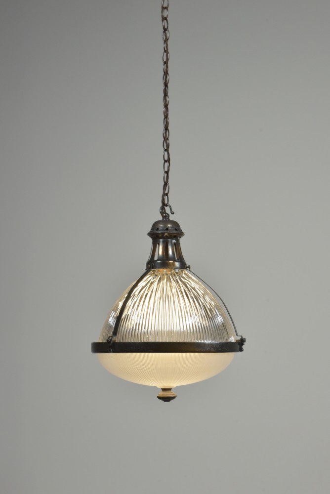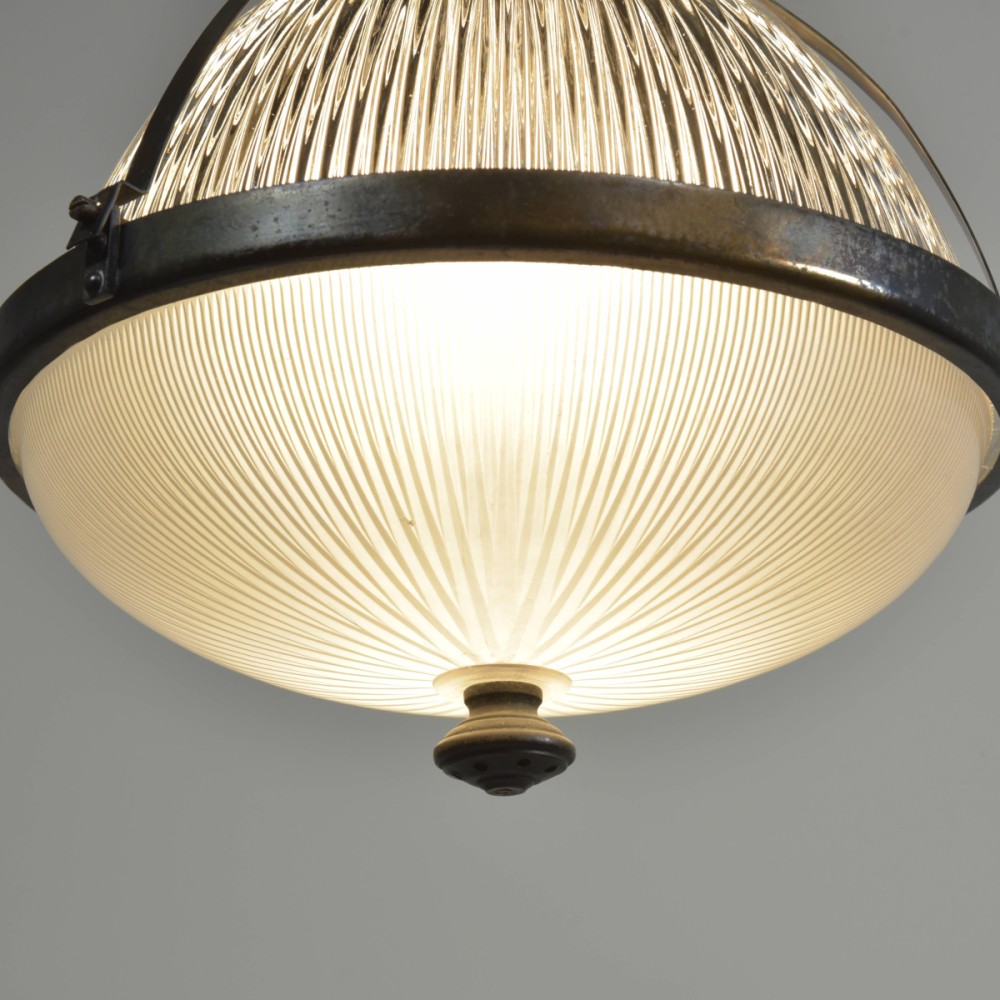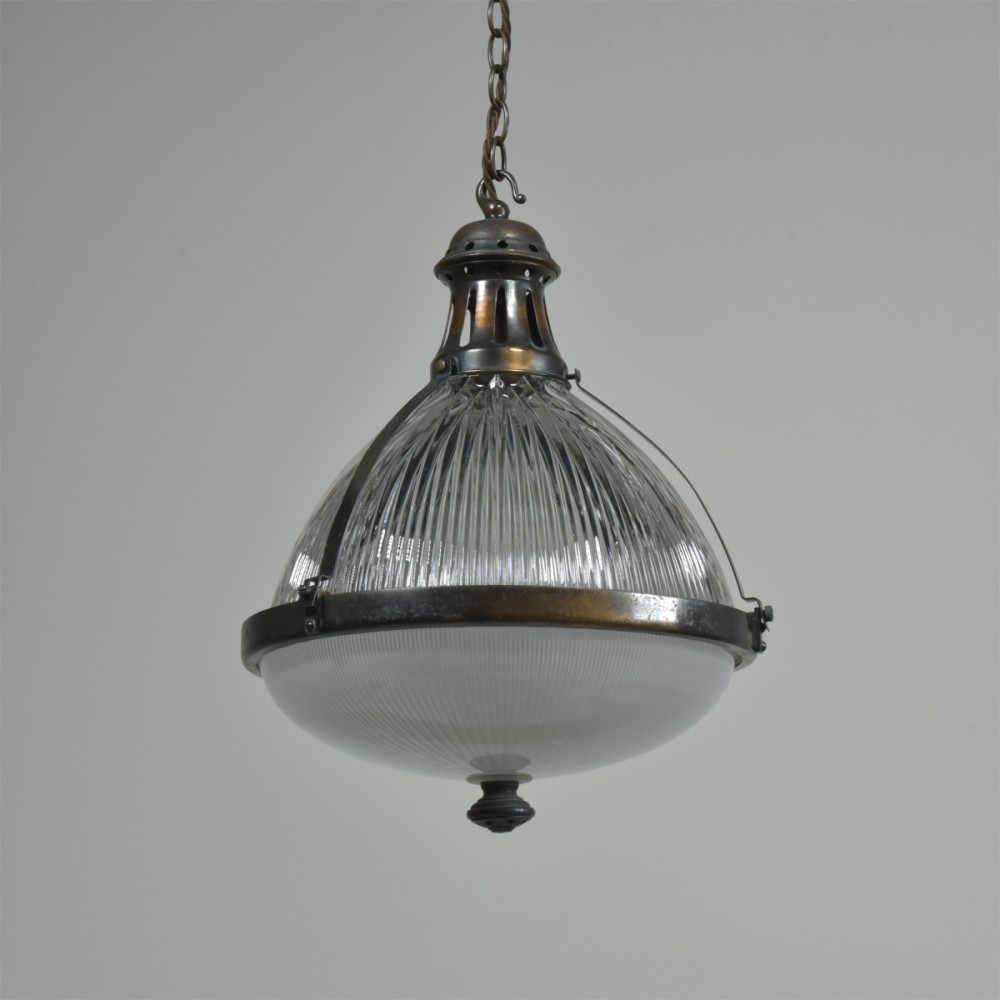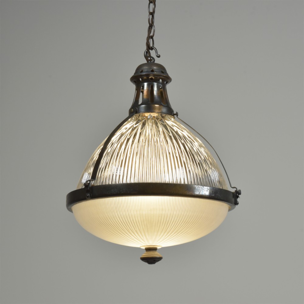 A large antique Holophane globe / lantern pendant light with 2 piece prismatic glass body, original patinated gallery / hook / mounts and finial. English, early 20th century. This one is an English version with both pieces of glass signed. The lower glass is also satin etched to the interior. Great condition, all complete, cleaned, lightly polished. Original coppered / bronzed patination to the brass fittings. Rewired with 1.5m fabric flex, old ES lampholder (positioned for optimal central bulb placement). Dimensions in inches/cms; 12.25"/31.5cm diameter. 16.5"/42cm tall inc. hook. Weight is 4.42kg. For more / higher res images please see my blog which can be accessed through the news section of this (haes) website.