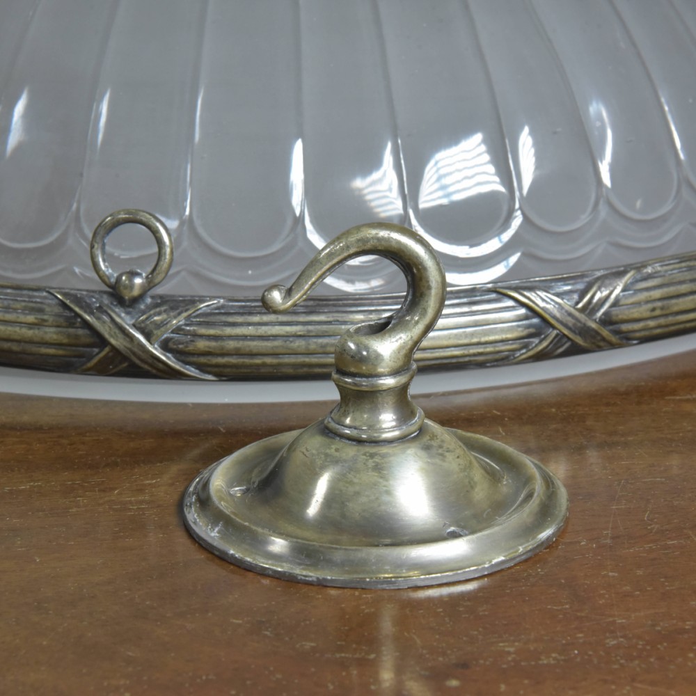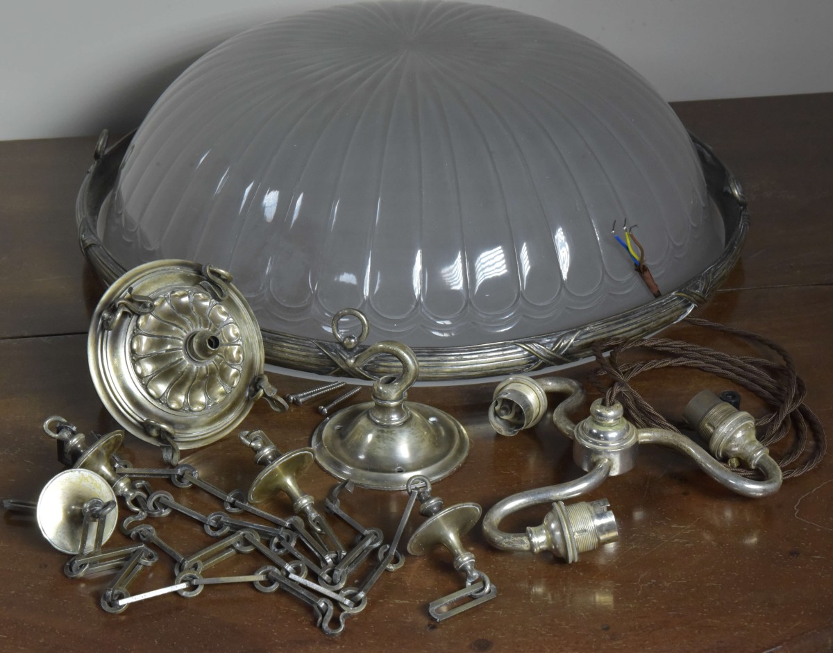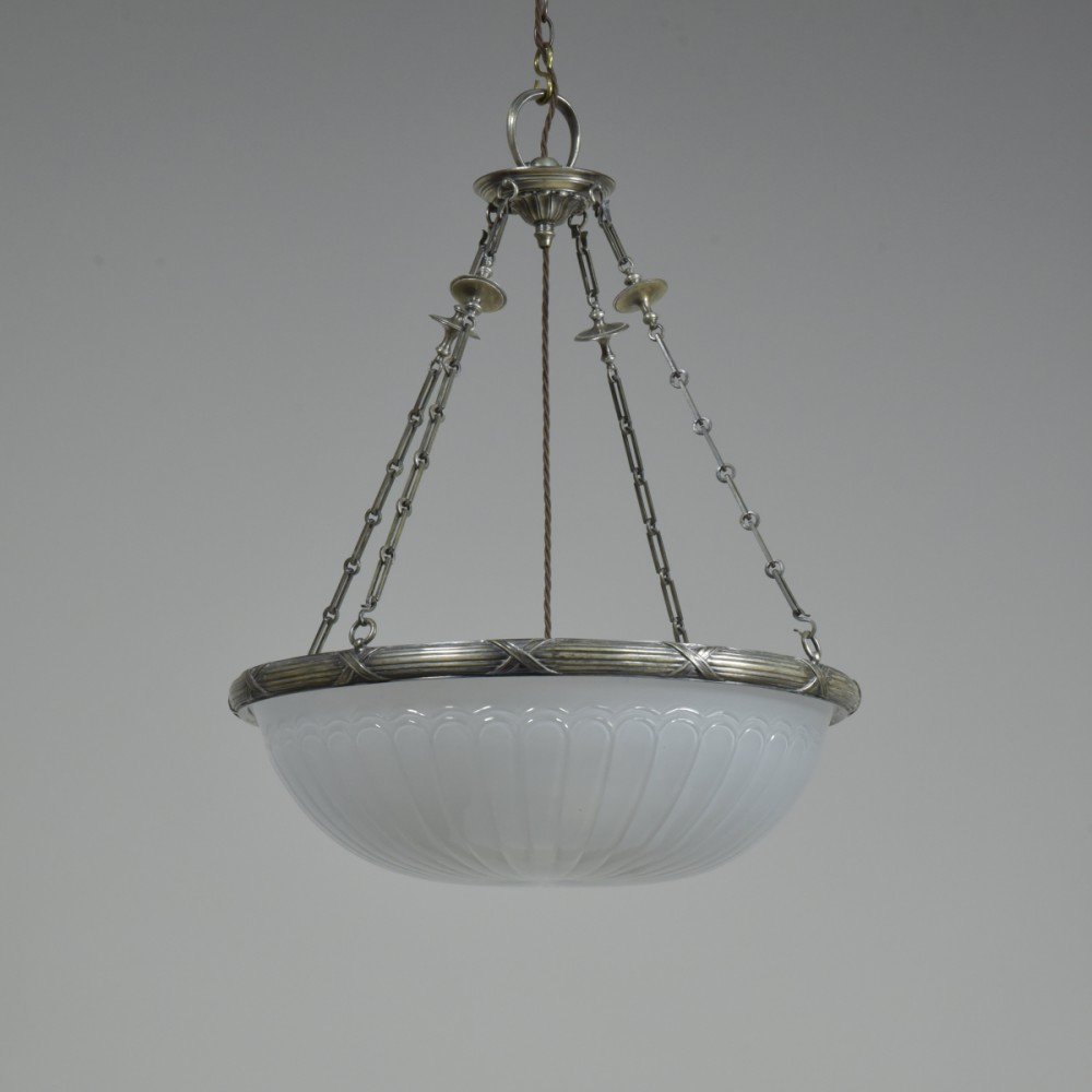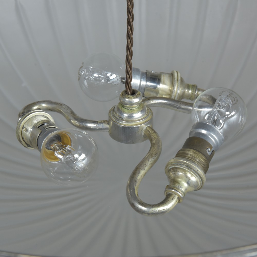 A splendid early 20th century light fitting by F & C Osler, the large satin etched and cut glass bowl with a reeded & tied silver plated cast brass mount. Complete with all the original matching parts one could hope for; chains, decorative "hanger" with large loop, hooked ceiling plate (supplied with slotted head screws) and the 3 armed lampholder mount (all original silver plated brass including the three Bc lampholders). In excellent complete condition.Some fading to silver plate but has a lovely overall colour (not brassy). Cleaned, "polished", fully rewired (2m dark brown fabric flex, earthed, pat tested), ready to be installed. Dimensions in inches/cms; 19.50"/50cm diameter. Approx 25"/64cm drop from the top of the hanging loop to the base of the shade. The hooked ceiling plate adds 3"/7.5cm in drop and any further drop required can be achieved by adding chain bewteen the hooked ceiling plate and the hanging loop. Weight is 8kg (glass bowl alone weighs 4.76kg). There are several close up photos of all the parts including one showing every part that comes with the light. One of several Osler light fittings currently in stock (as of end March 2026). For more / higher res images please see my blog which can be accessed through the news section of this (haes) website.