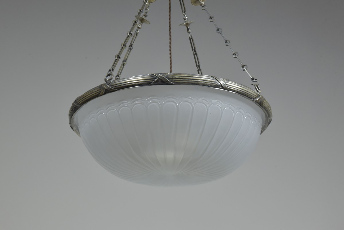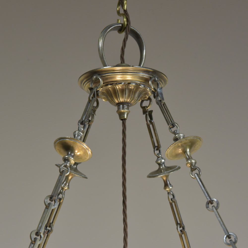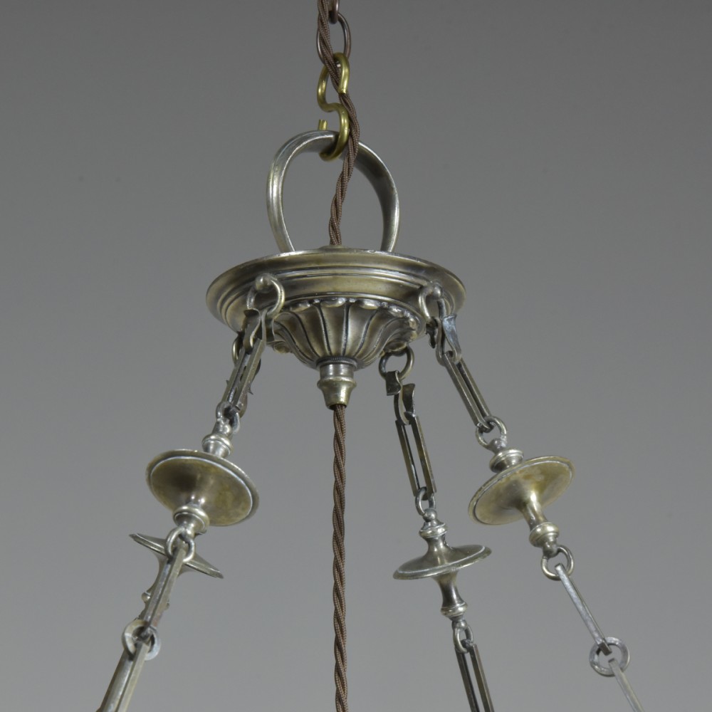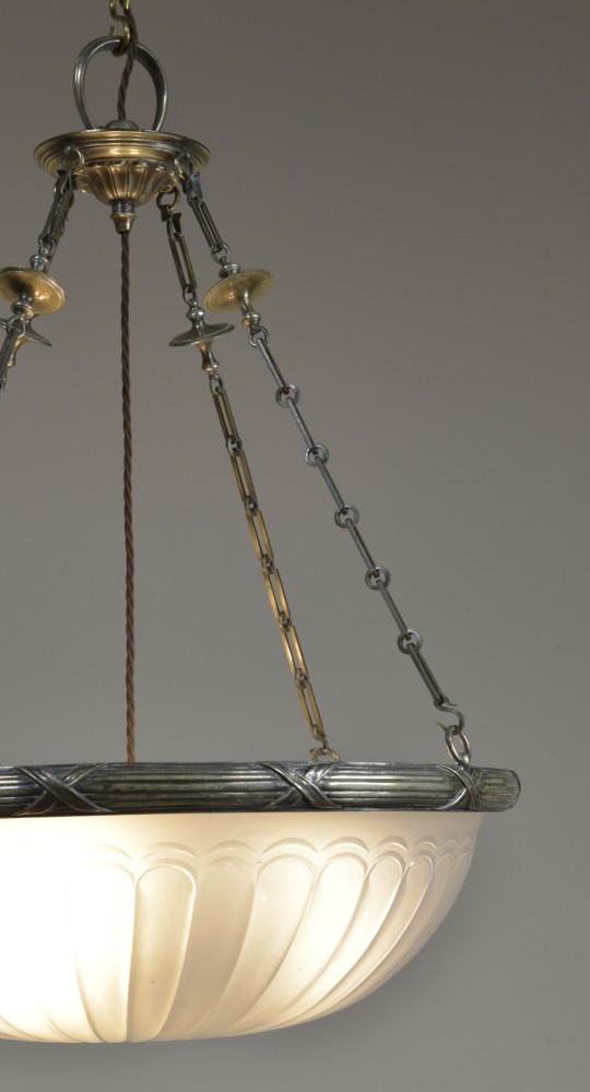 A splendid early 20th century light fitting by F & C Osler, the large satin etched and cut glass bowl with a reeded & tied silver plated cast brass mount. Complete with all the original matching parts one could hope for; chains, decorative "hanger" with large loop, hooked ceiling plate (supplied with slotted head screws) and the 3 armed lampholder mount (all original silver plated brass including the three Bc lampholders). In excellent complete condition.Some fading to silver plate but has a lovely overall colour (not brassy). Cleaned, "polished", fully rewired (2m dark brown fabric flex, earthed, pat tested), ready to be installed. Dimensions in inches/cms; 19.50"/50cm diameter. Approx 25"/64cm drop from the top of the hanging loop to the base of the shade. The hooked ceiling plate adds 3"/7.5cm in drop and any further drop required can be achieved by adding chain bewteen the hooked ceiling plate and the hanging loop. Weight is 8kg (glass bowl alone weighs 4.76kg). There are several close up photos of all the parts including one showing every part that comes with the light. One of several Osler light fittings currently in stock (as of end March 2026). For more / higher res images please see my blog which can be accessed through the news section of this (haes) website.