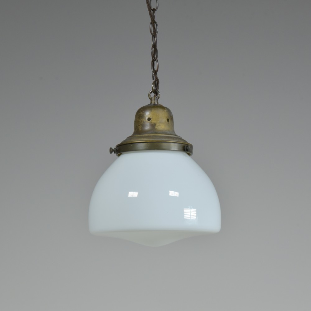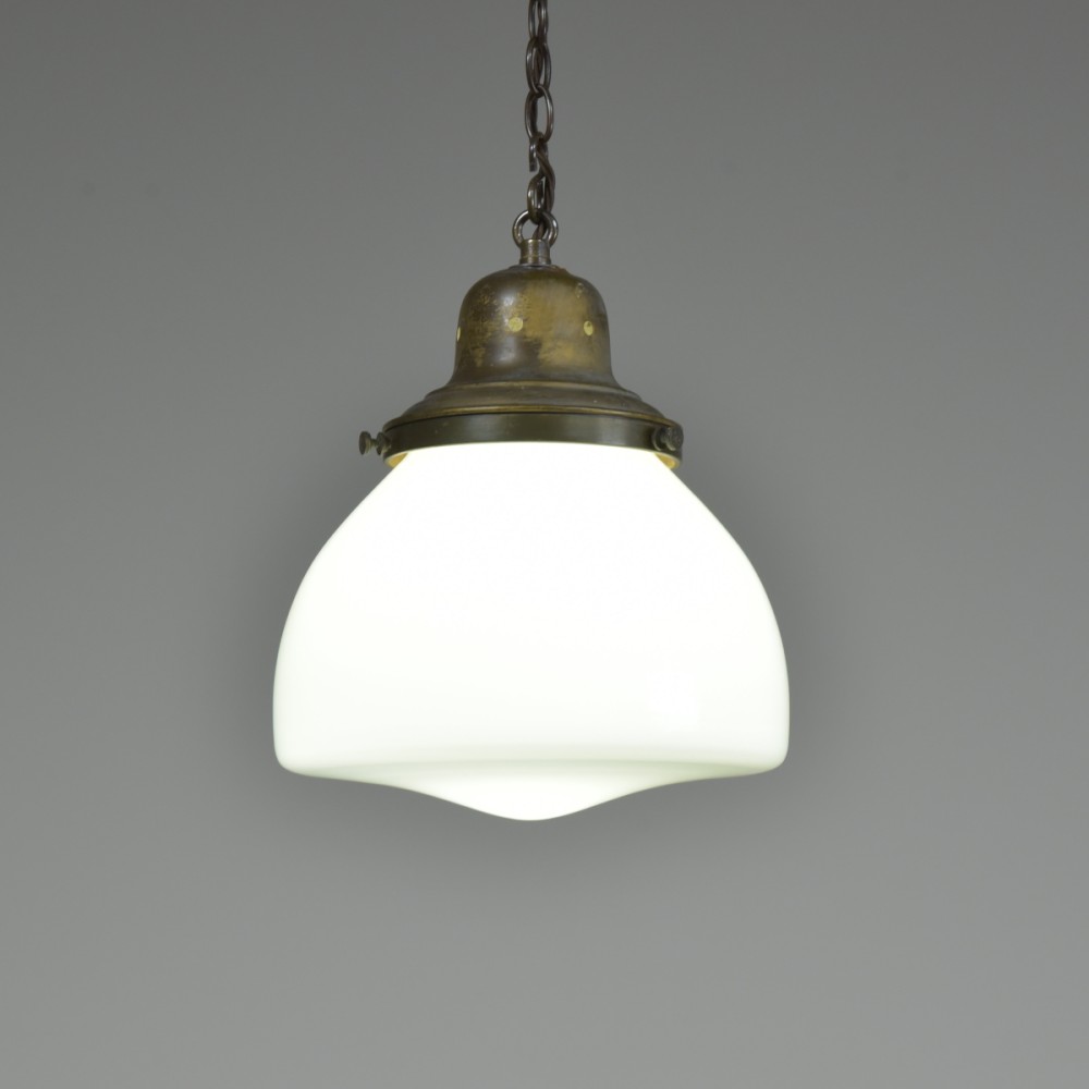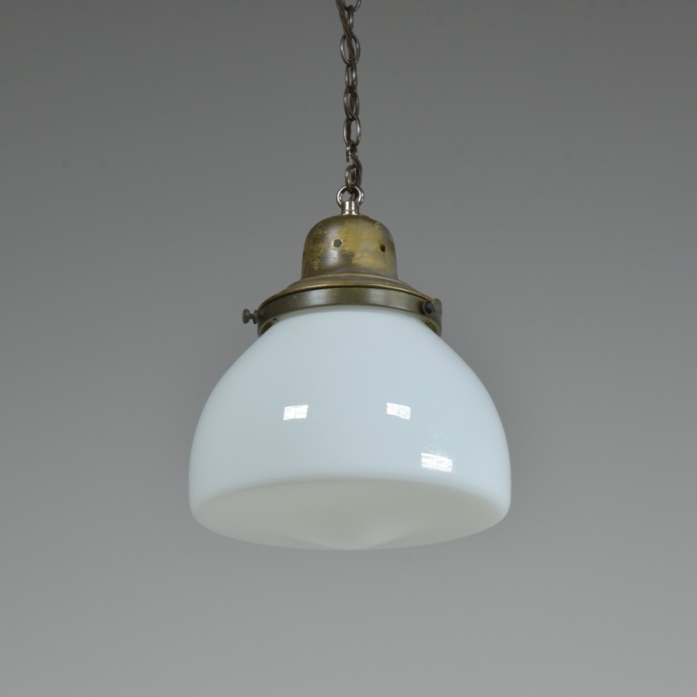 An antique "closed" opal glass pendant light with original brass gallery. With new patinated hanging loop, S-hook and washer. New brass ES lampholder positioned with brass tube for a perfect central light bulb position. Rewired with 1.5m dark brown fabric flex. Hooked ceiling plate / chain can be supplied if necessary. Dimensions in inches/cms; 10"/25cm diameter. 12"/30cm tall inc. loop. 1.6kg. For more / higher res images please see my blog which can be accessed through the news section of this (haes) website.