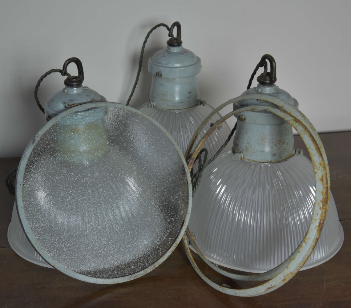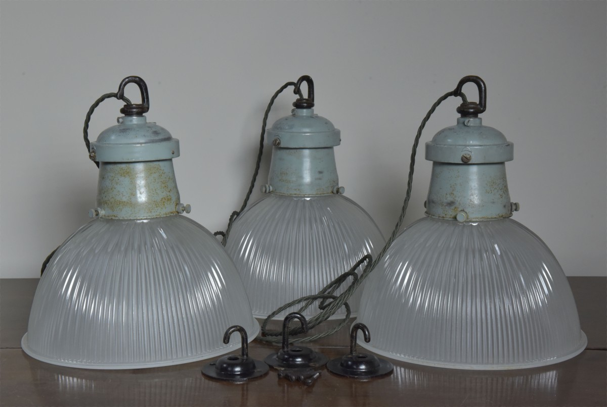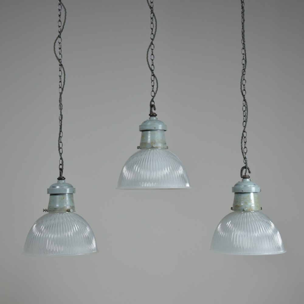 A set of three etched prismatic crisply moulded glass shades with their original cast aluminium / spun steel galleries and hook . English approx 1930s. The glass and galleries marked Holophane. The glass cleaned, galleries taken apart and rubbed up retaining the original paint and double waxed. Rewired with 1.5m fabric flex, original porcelain ES lampholders (perfect condition). Each supplied with 1meter black jack chain (galvanised if preferred), original hooked ceiling plate (including vintage slotted roundhead black japanned screws). One of the lights has it's original base lens glass and all three the original frames for the glass. They can be used with or without - please see images. Dimensions in inches/cms; 10.25"/26cm diameter. 11.25"/28.5cm tall inc. hook (shade only is 6"/15cm tall). 2.25kg each. Priced individually. Please note i have some more similar light fittings including ones with "turquoise" shades. For more / higher res images please see my blog which can be accessed through the news section of this (haes) website.