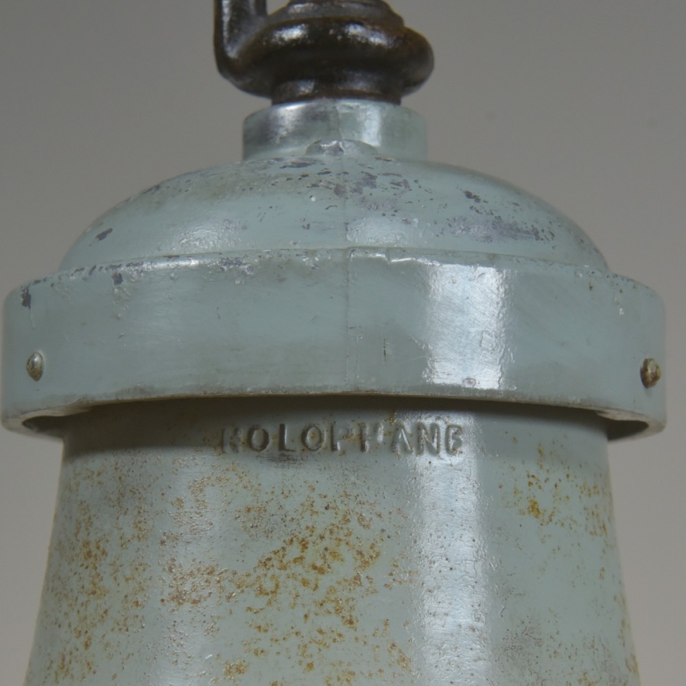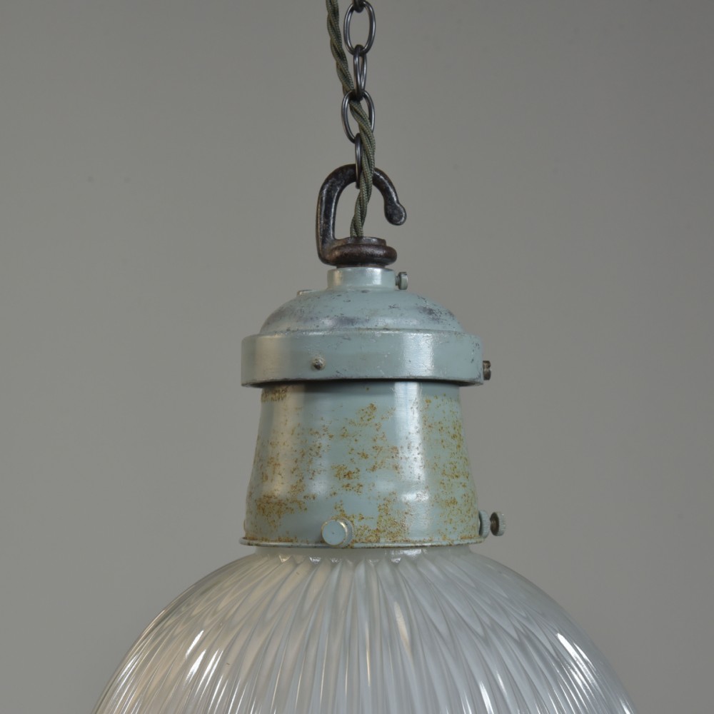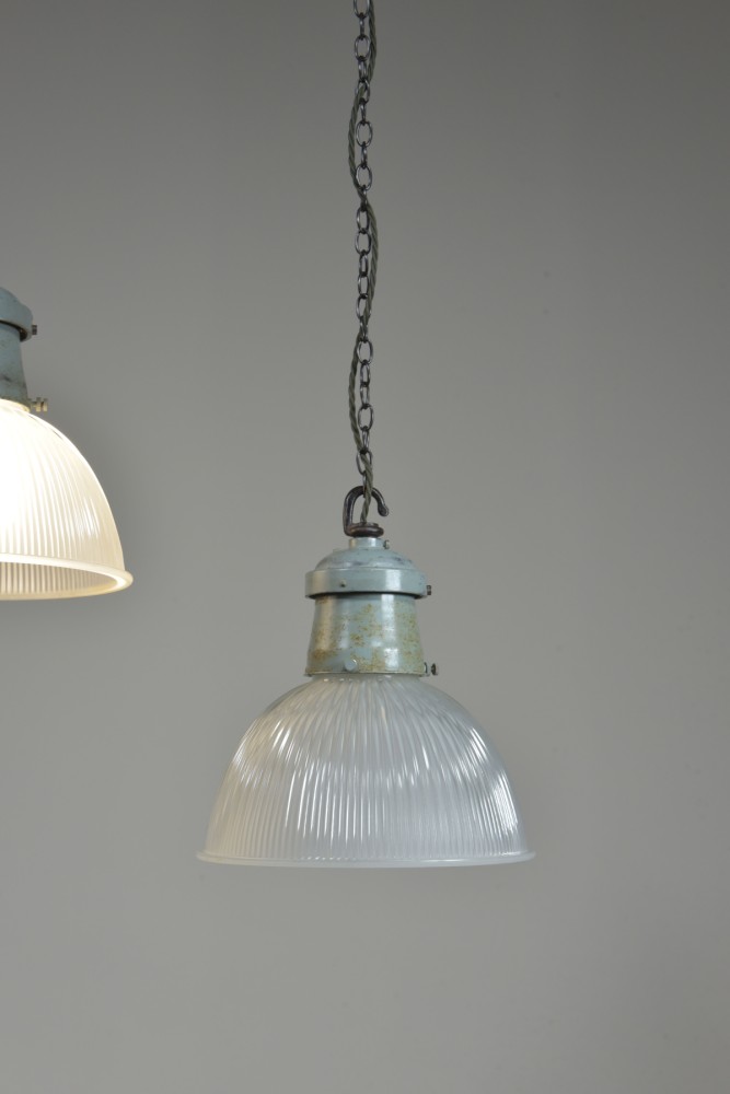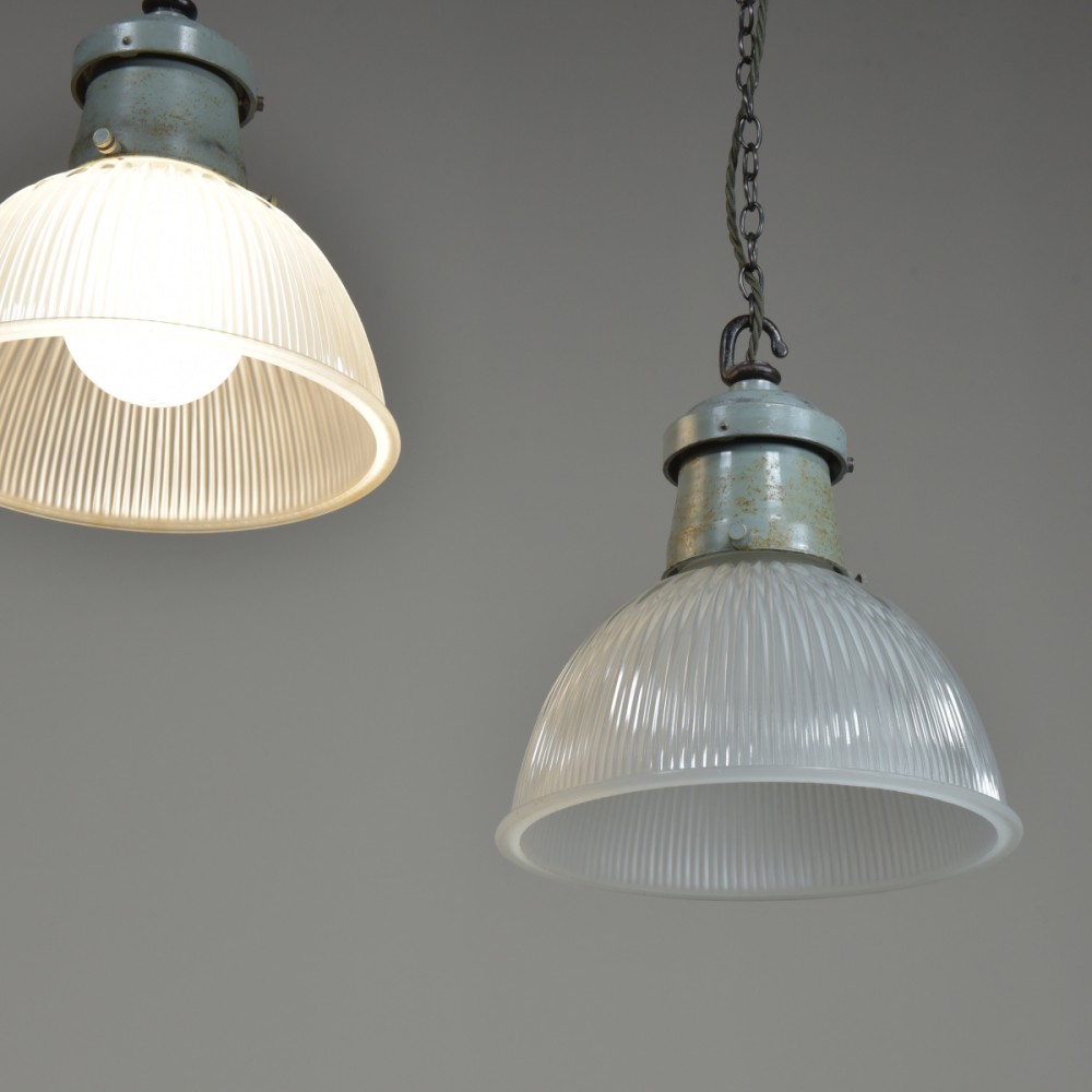 A set of three etched prismatic crisply moulded glass shades with their original cast aluminium / spun steel galleries and hook . English approx 1930s. The glass and galleries marked Holophane. The glass cleaned, galleries taken apart and rubbed up retaining the original paint and double waxed. Rewired with 1.5m fabric flex, original porcelain ES lampholders (perfect condition). Each supplied with 1meter black jack chain (galvanised if preferred), original hooked ceiling plate (including vintage slotted roundhead black japanned screws). One of the lights has it's original base lens glass and all three the original frames for the glass. They can be used with or without - please see images. Dimensions in inches/cms; 10.25"/26cm diameter. 11.25"/28.5cm tall inc. hook (shade only is 6"/15cm tall). 2.25kg each. Priced individually. Please note i have some more similar light fittings including ones with "turquoise" shades. For more / higher res images please see my blog which can be accessed through the news section of this (haes) website.