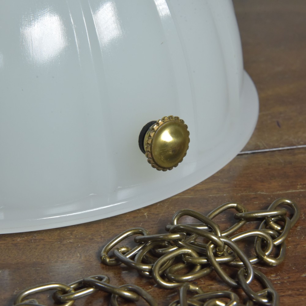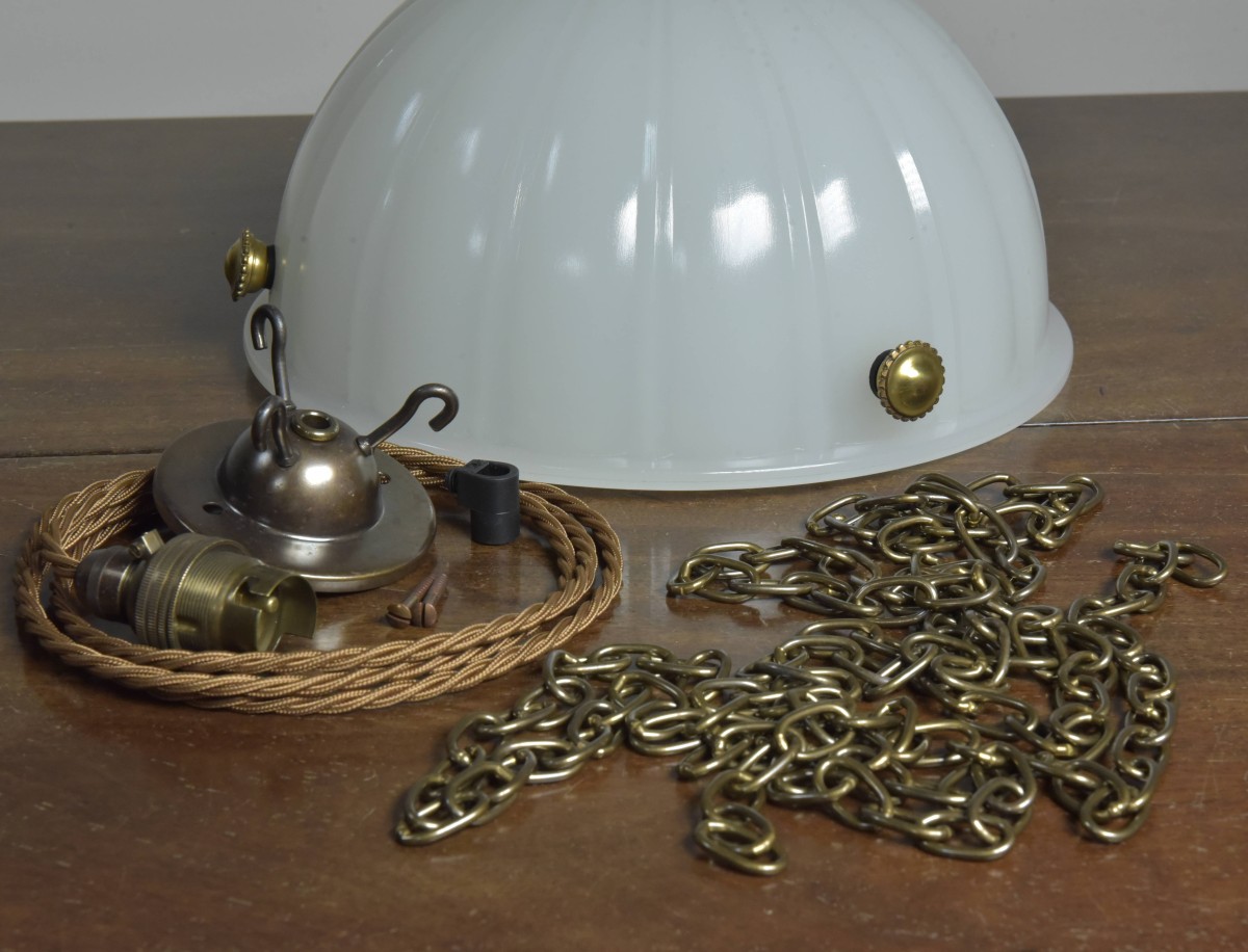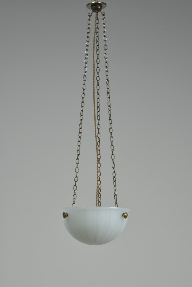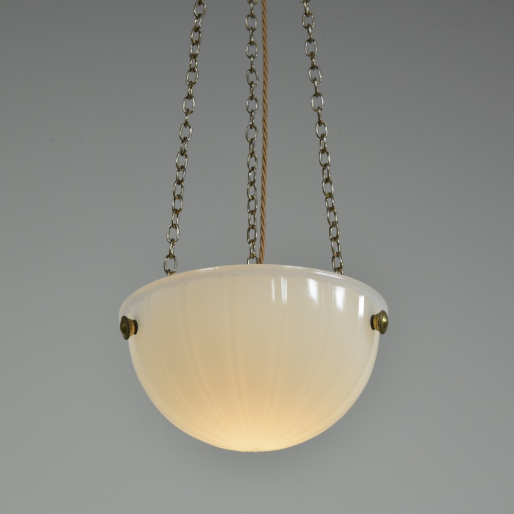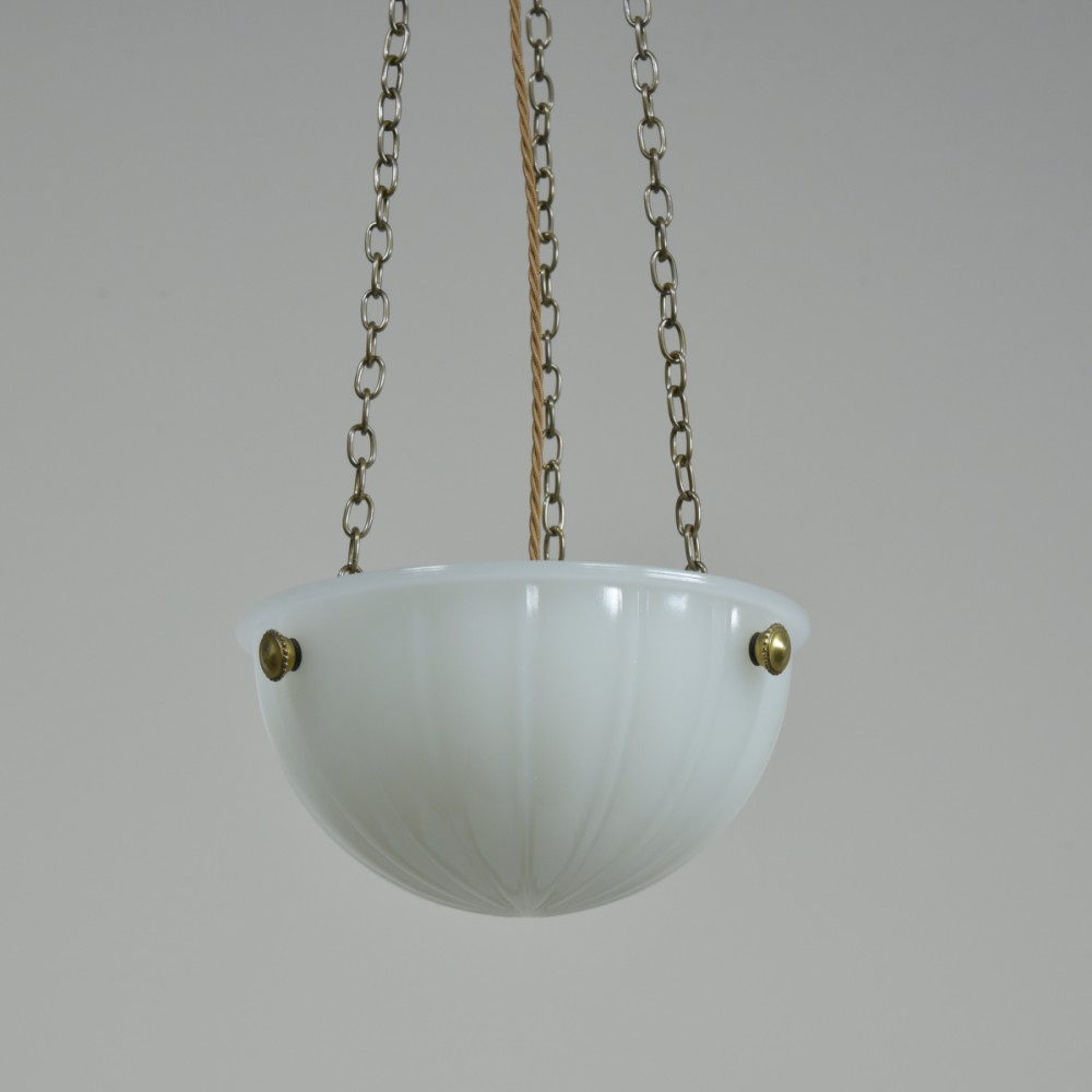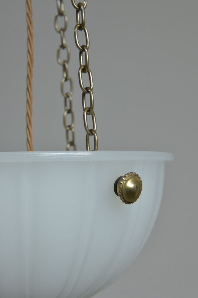 An antique moonstone bowl plafonnier / hanging light. English c1920. Excellent condition with original brass mounts. Supplied with patinated brass parts and solid brass chain (3 hooked ceiling plate with brass guide, earth, cordgrip, vintage slotted brass screws, 1.5m fabric flex with cordgrip/ BC lampholder, 3 x 38inch lengths chain). See detail photos. Dimensions in inches/cms; 10"/25cm diameter. 33.25"/85cm drop (easily adjustable- by us if you know the drop you need or by the installer) 2.66kg. For more / higher res images please see my blog which can be accessed through the news section of this (haes) website.
