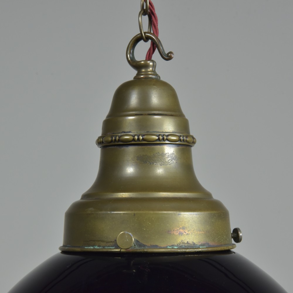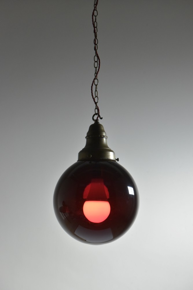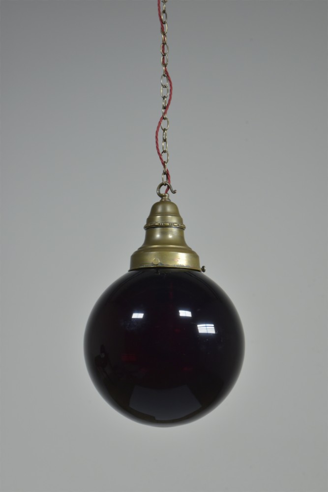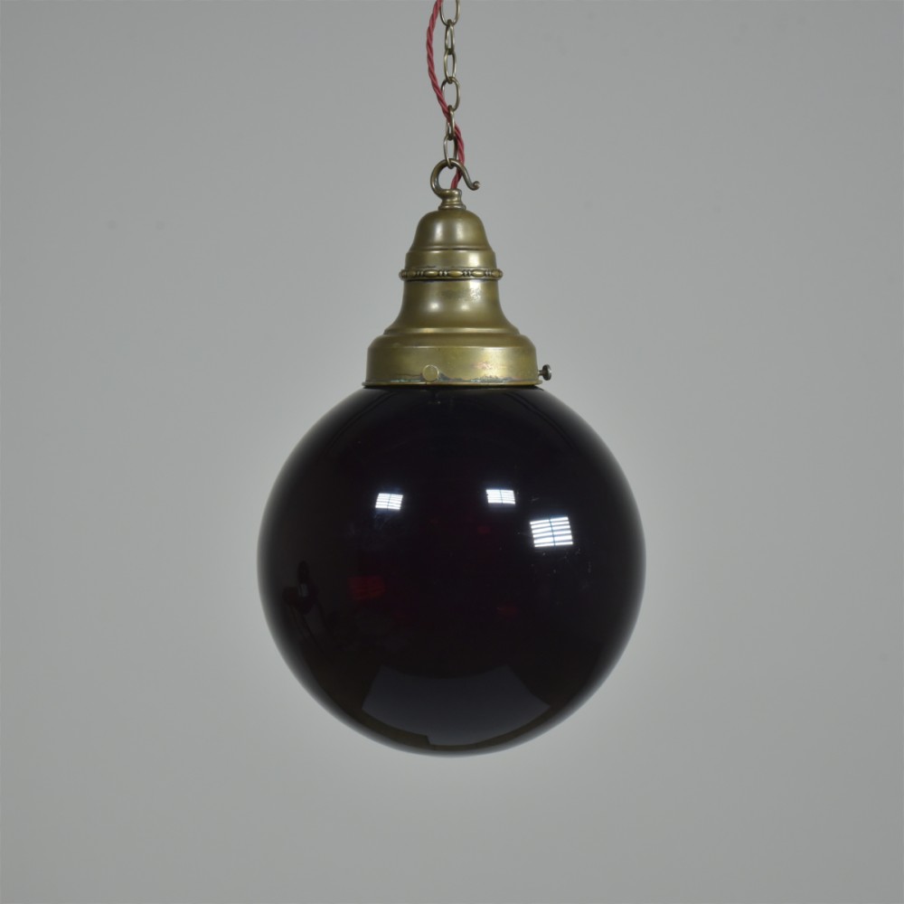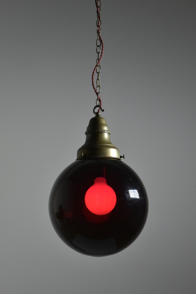 A rare pair of antique very dark red claret glass handblown globes with their original decorative brass hooked galleries. English, early 20th century. Excellent quality heavy glass globes and galleries. Rewired with 1.5m bergundy fabric flex and patinated brass ES lampholders positioned using old brass tube to place a medium / large globe bulb approxiamately in the centre of the shade. They will not give a very high light output - a red glow -obviously of varying intesity depending on the wattage of the bulb.....ATMOSPHERIC! Dimensions in inches/cms; 12"/31cm diameter. 18.5"/47cm tall inc hook. 2.34kg and 2.25kg. For more / higher res images please see my blog which can be accessed through the news section of this (haes) website.