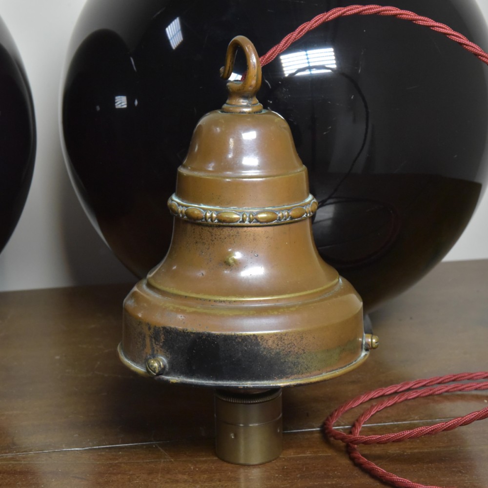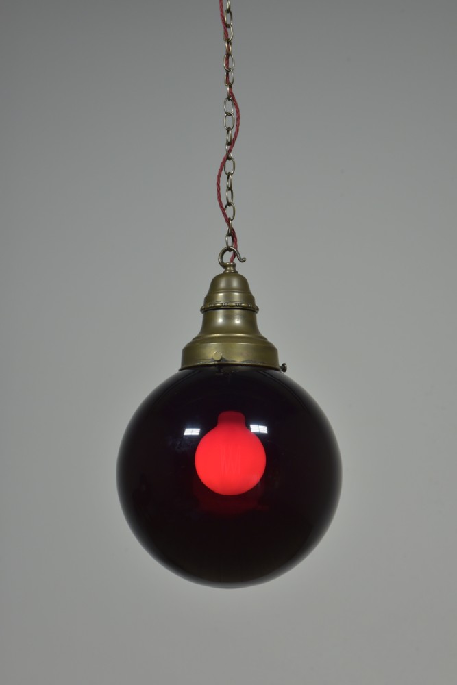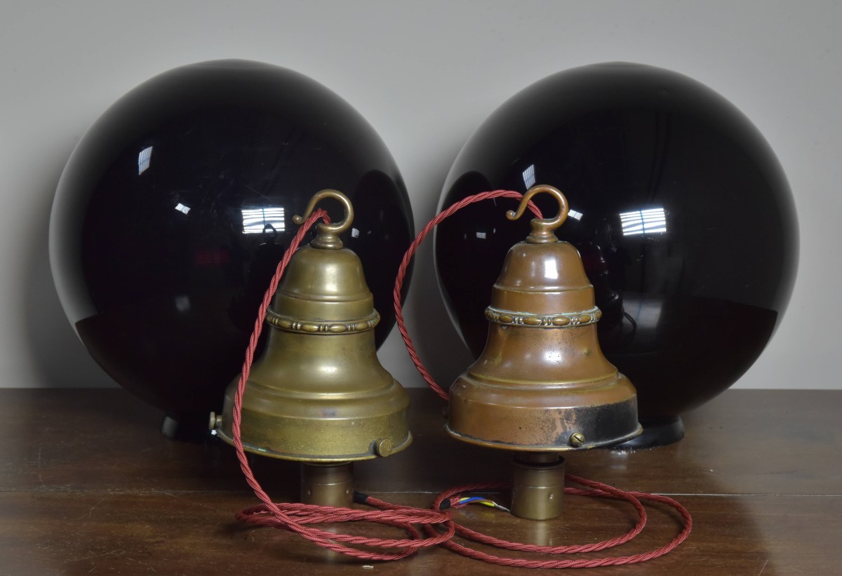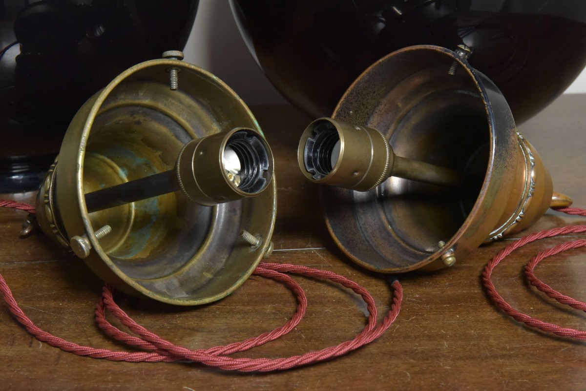 A rare pair of antique very dark red claret glass handblown globes with their original decorative brass hooked galleries. English, early 20th century. Excellent quality heavy glass globes and galleries. Rewired with 1.5m bergundy fabric flex and patinated brass ES lampholders positioned using old brass tube to place a medium / large globe bulb approxiamately in the centre of the shade. They will not give a very high light output - a red glow -obviously of varying intesity depending on the wattage of the bulb.....ATMOSPHERIC! Dimensions in inches/cms; 12"/31cm diameter. 18.5"/47cm tall inc hook. 2.34kg and 2.25kg. For more / higher res images please see my blog which can be accessed through the news section of this (haes) website.