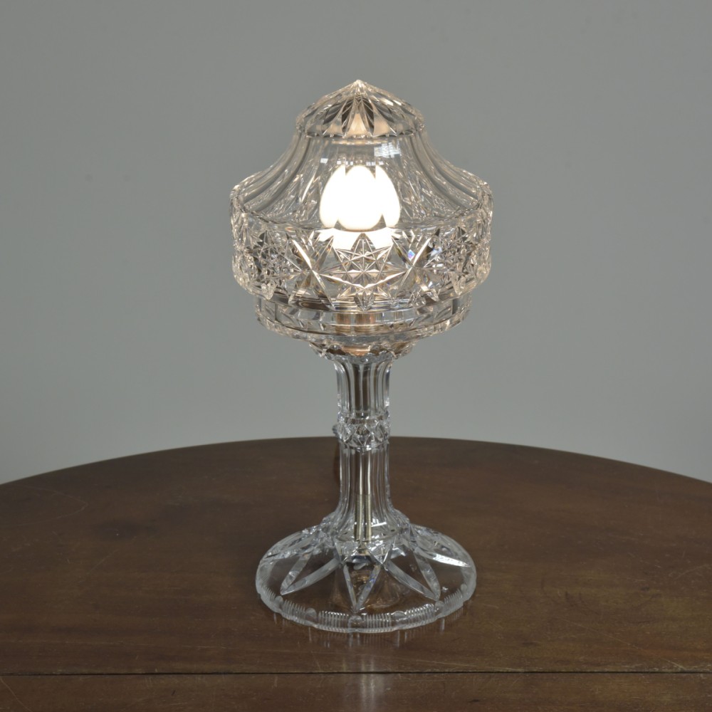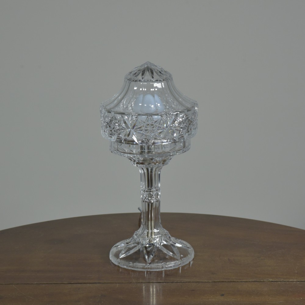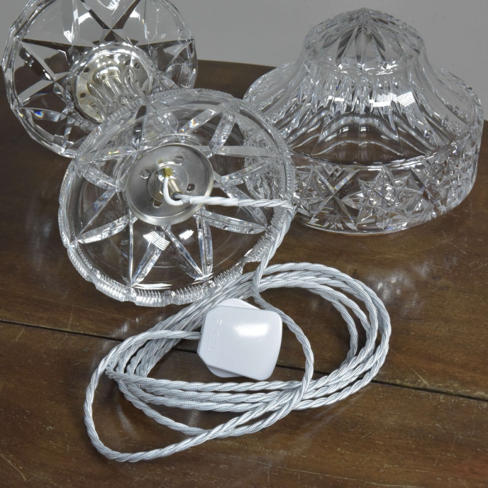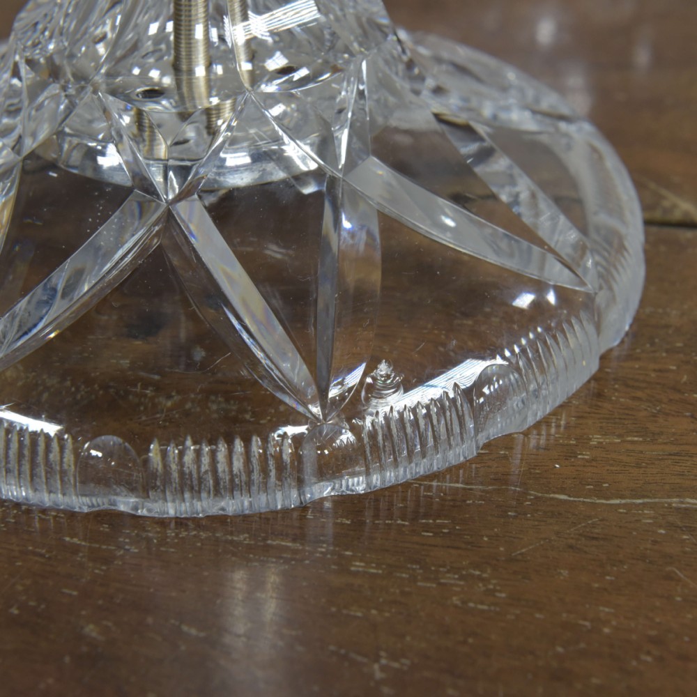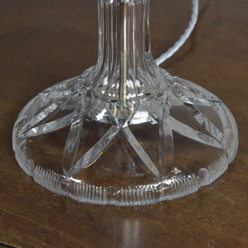 An antique cut glass lamp with "goblet" base. Cleaned, silver plated fittings polished. Wired with 3m fabric flex, original silver plated lampholder, 3amp plug. Pat tested. Small chip to inside base and small sliver to base (see closeup images). Dimensions in inches/cms; 14.5/37cm cm tall. 7"/18cm diameter - shade. 3kg weight. For more / higher res images please see my blog which can be accessed through the news section of this (haes) website.