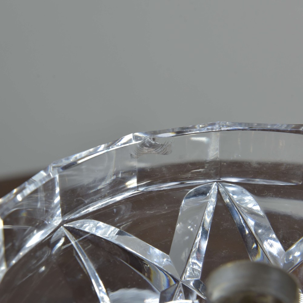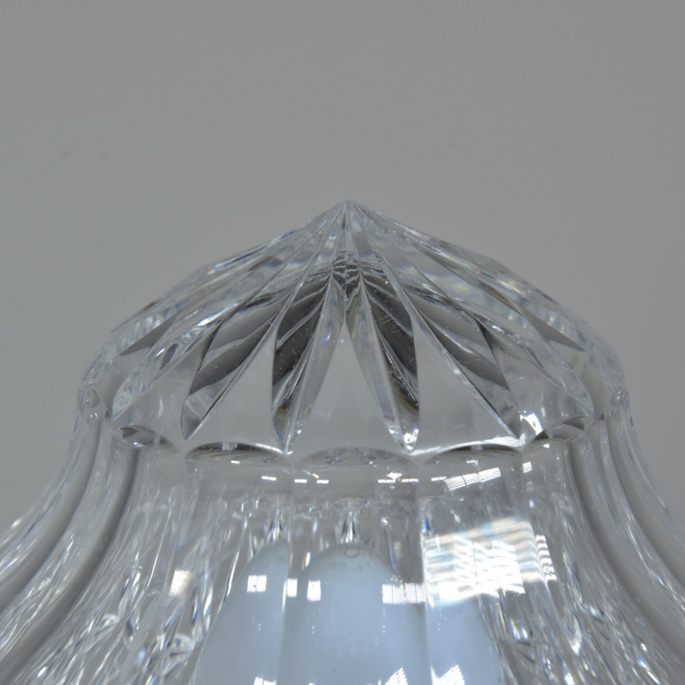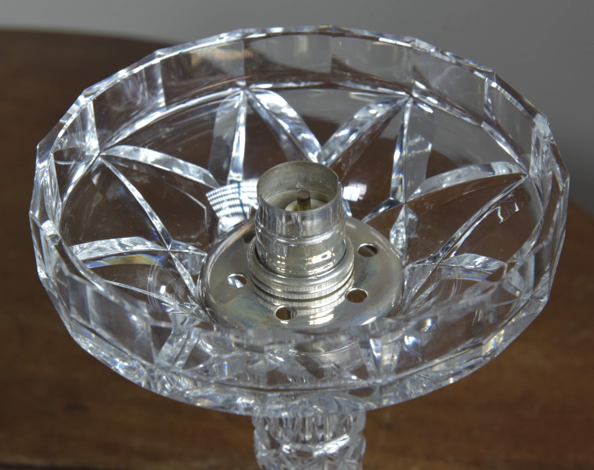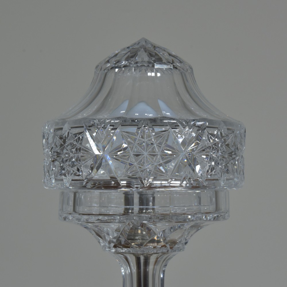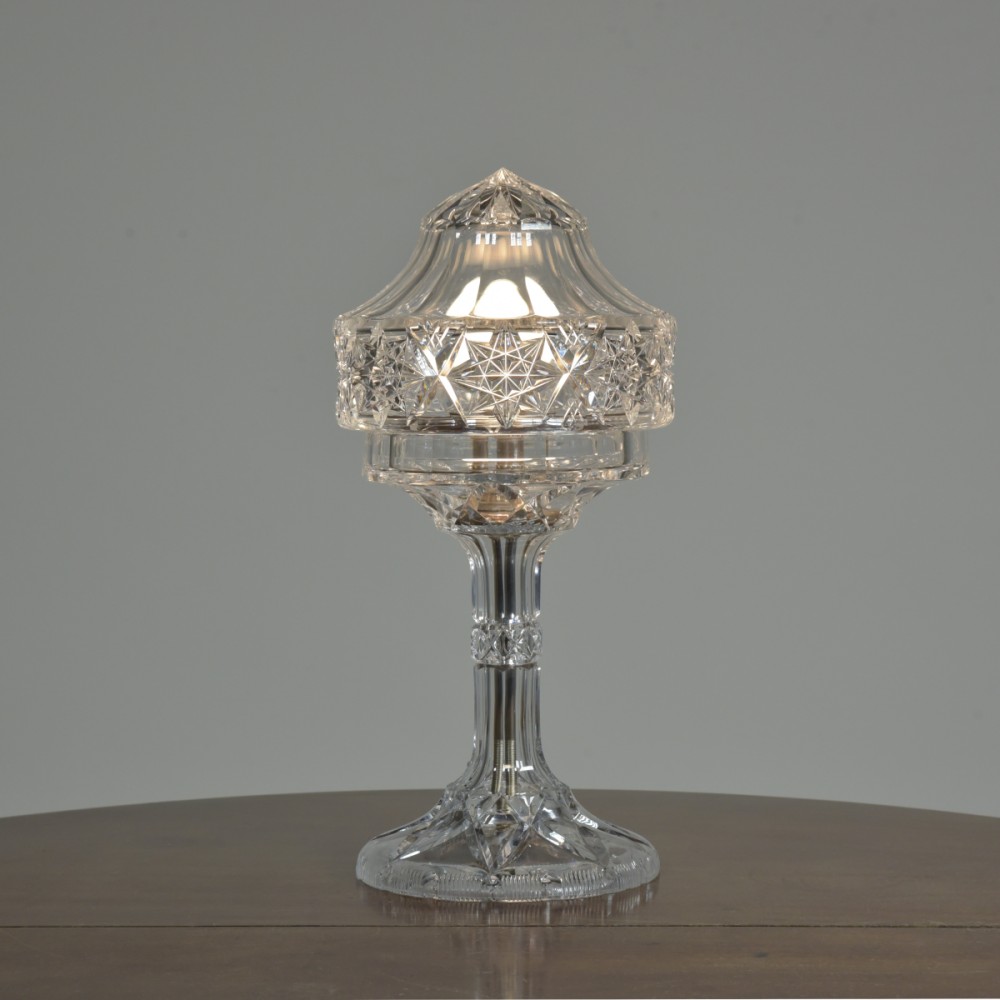 An antique cut glass lamp with "goblet" base. Cleaned, silver plated fittings polished. Wired with 3m fabric flex, original silver plated lampholder, 3amp plug. Pat tested. Small chip to inside base and small sliver to base (see closeup images). Dimensions in inches/cms; 14.5/37cm cm tall. 7"/18cm diameter - shade. 3kg weight. For more / higher res images please see my blog which can be accessed through the news section of this (haes) website.