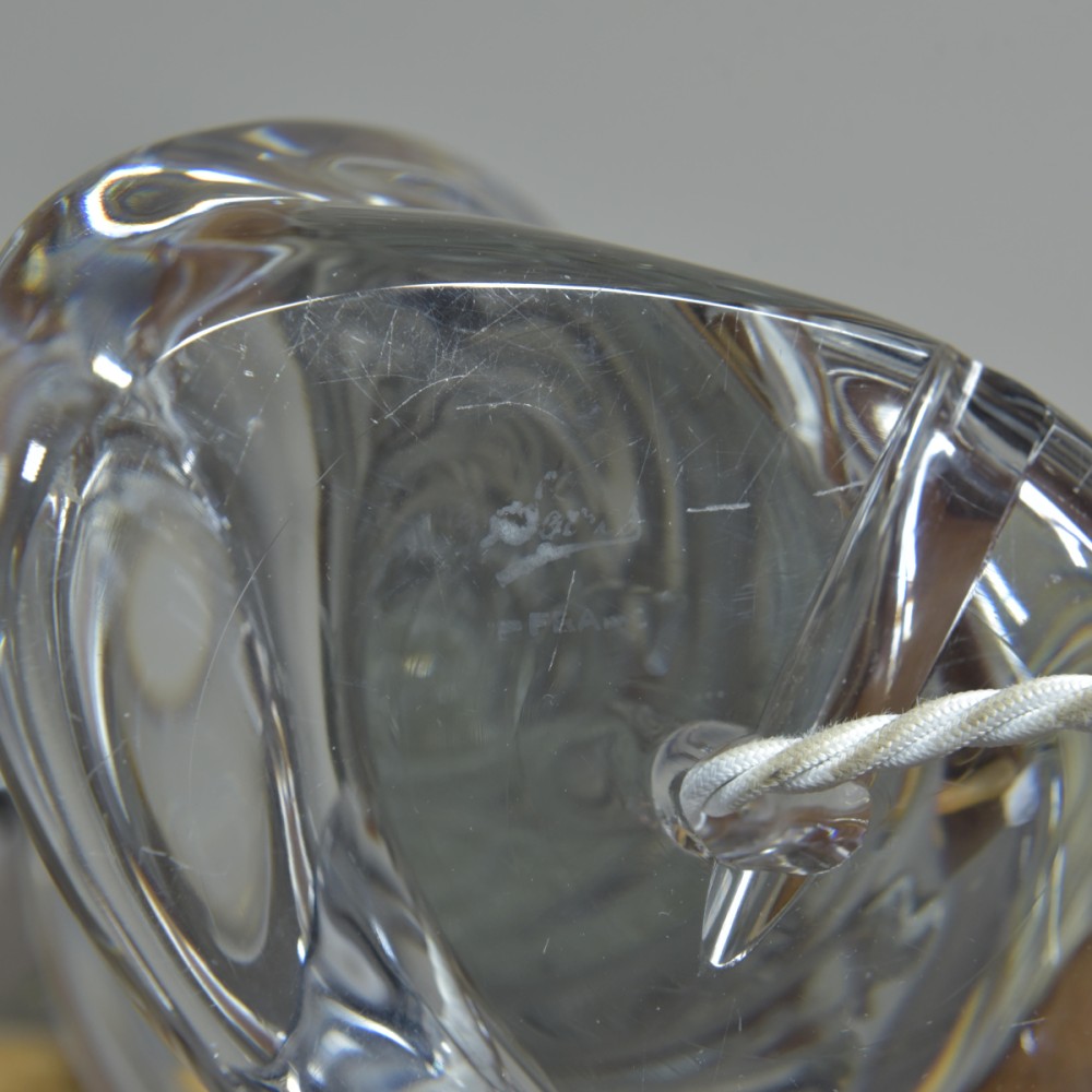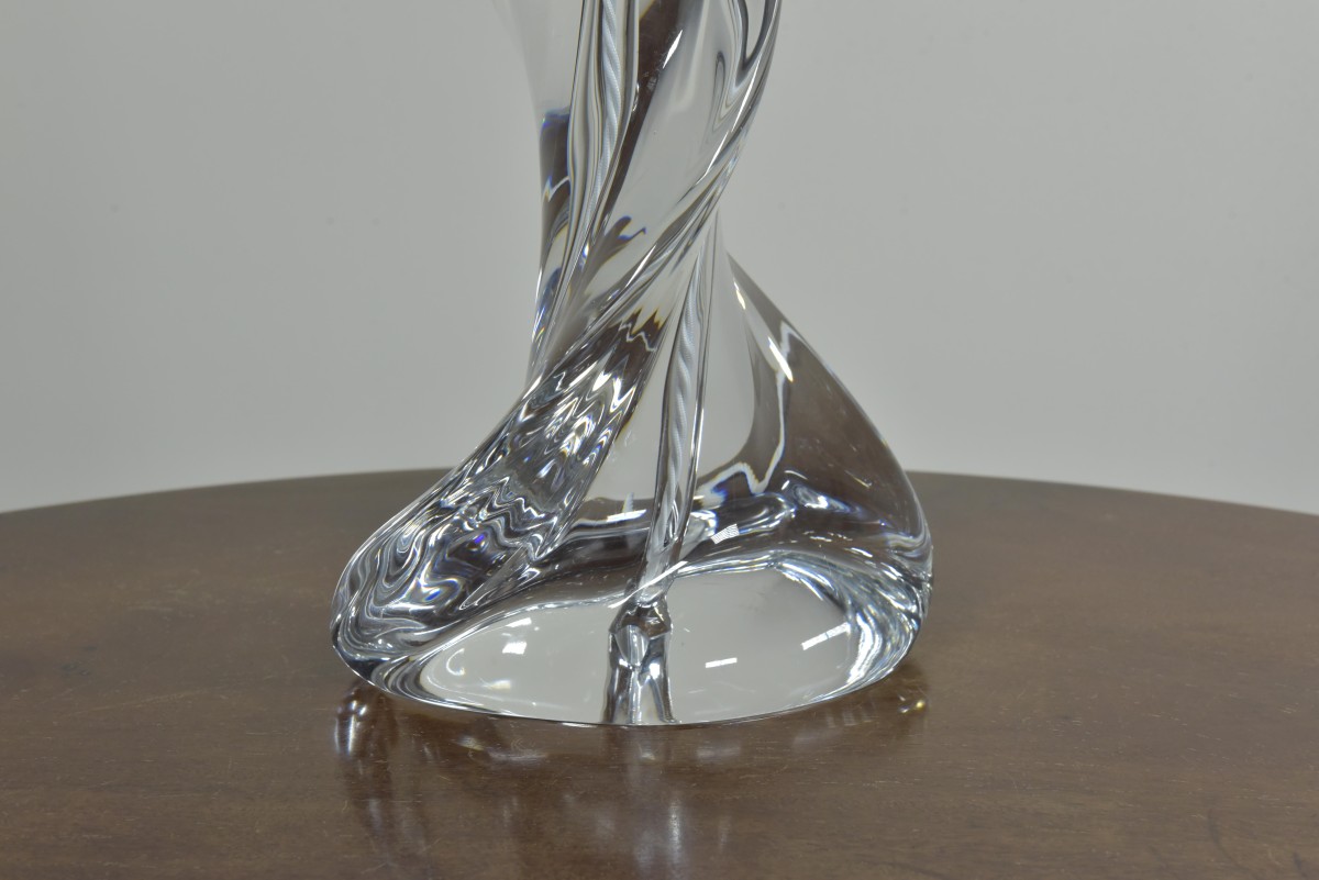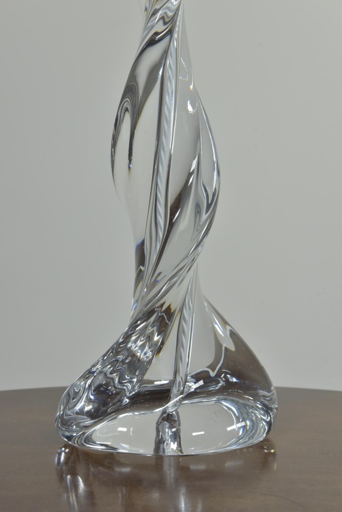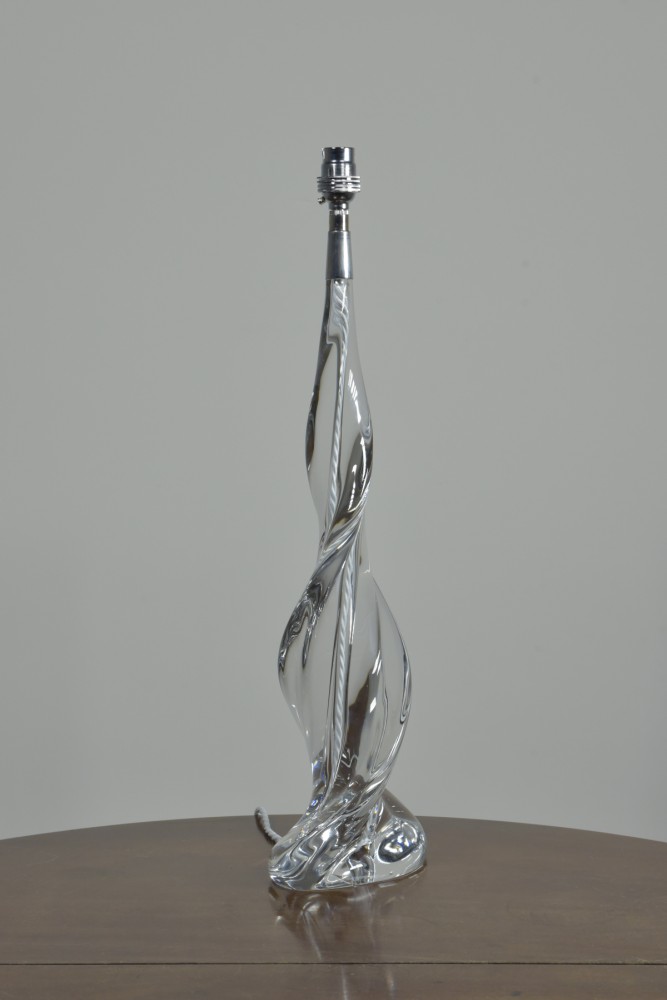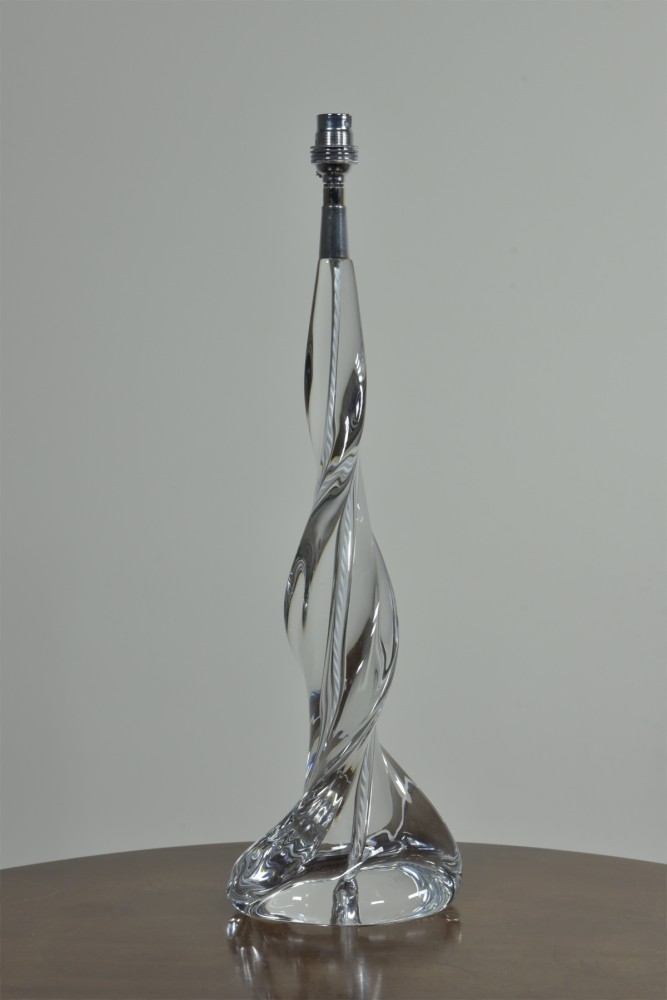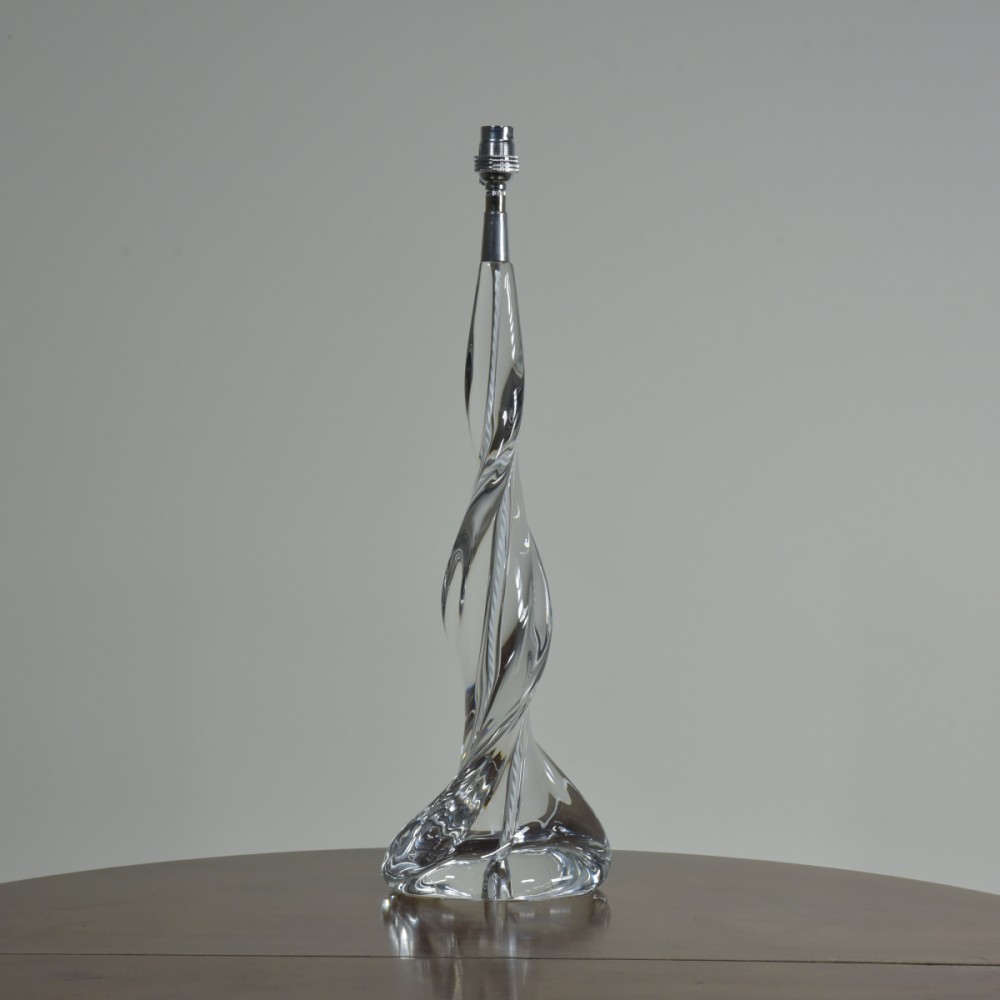 A large crystal glass lamp of spiral form by Sevres. Etched Sevres signature to base. Approx mid century. Dimensions in inches/cms; 21.5"/55cm tall. 6.75"/17cm x 4"/10cm base 4.38kg weight. For more / higher res images please see my blog which can be accessed through the news section of this (haes) website.