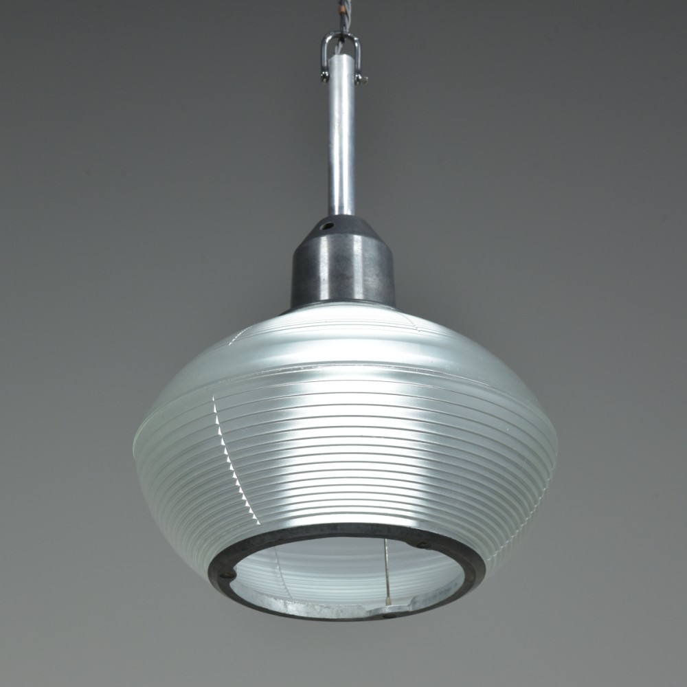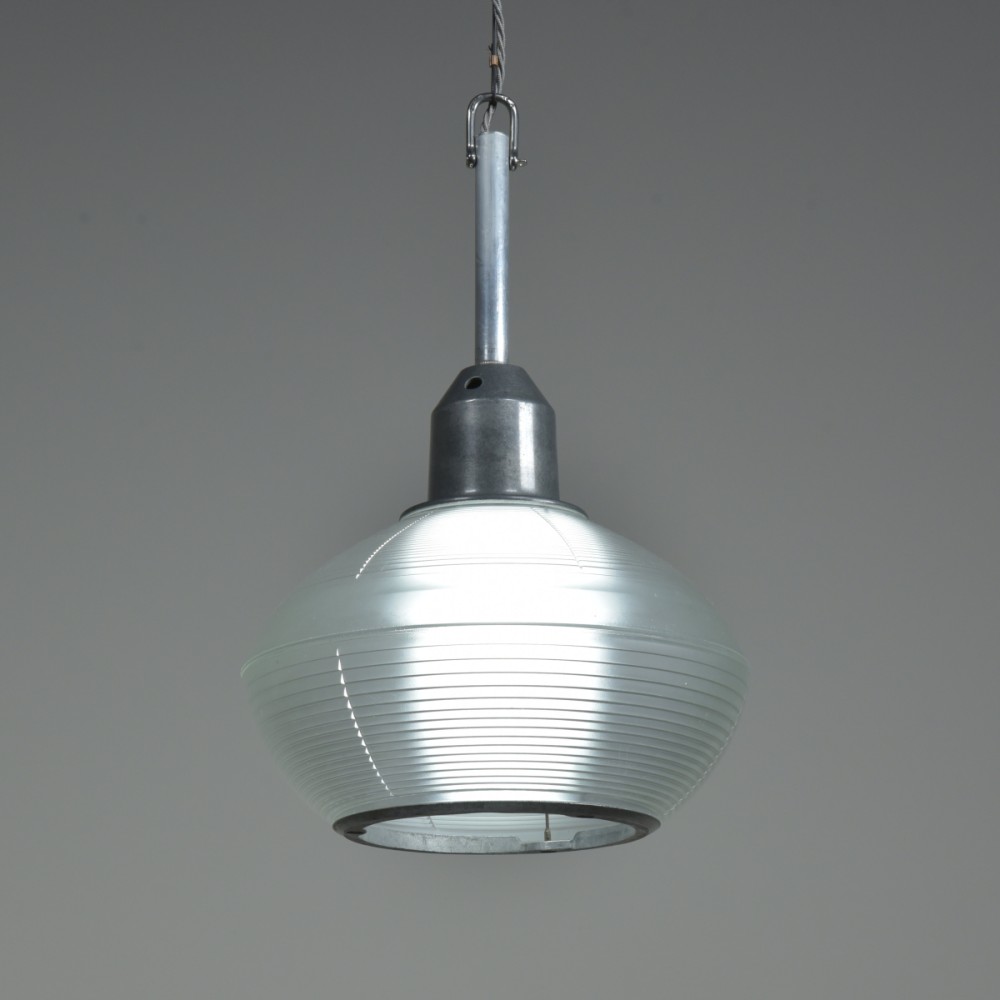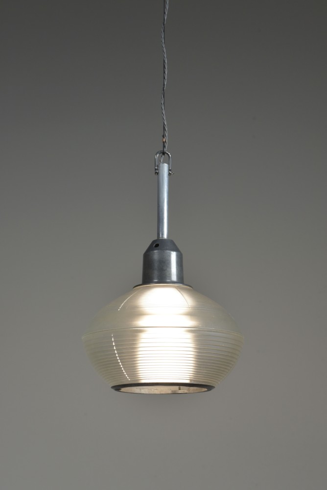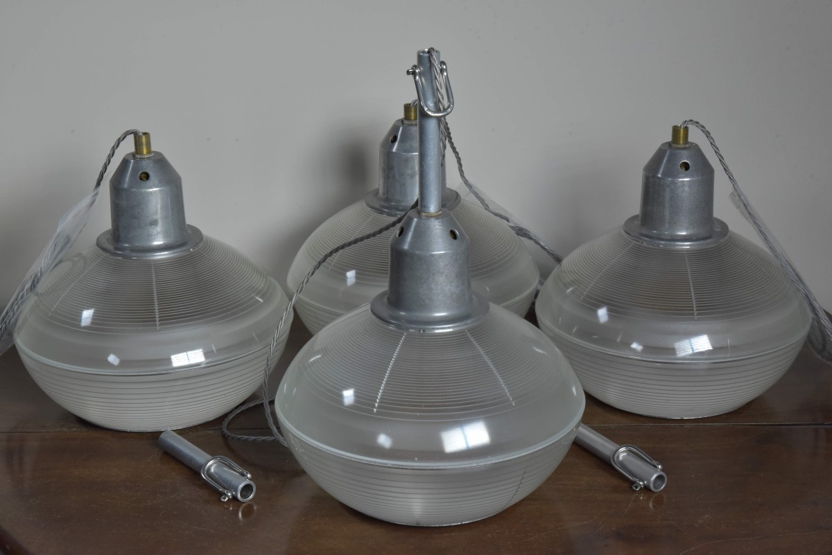 A set of four Holophane prismatic globe hanging lights. Approx 1940s. Great quality crisply cast glass satin etched to the inside. Good colour and quality aluminium gallery mounts. The original aluminium stems have been cut down and Wichard self locking stainless steel shackles fitted for hanging; in this case with wire to give a very sleek look. They can be hung this way or with chain. Rewired with 1.5m fabric flex. They retain their original GES porcelain lampholders and are supplied with ceramic adaptors for use with standard ES bulbs. The lit photos are mainly with a cooler (4200K) bulb but their is also an image with a regular/warmer (2700K) bulb. Dimensions in inches/cms; 11.5"/30cm diameter. 17.5"/45cm tall to the top of the shackle. 3.5kg. Priced individually. For more / higher res images please see my blog which can be accessed through the news section of this (haes) website.