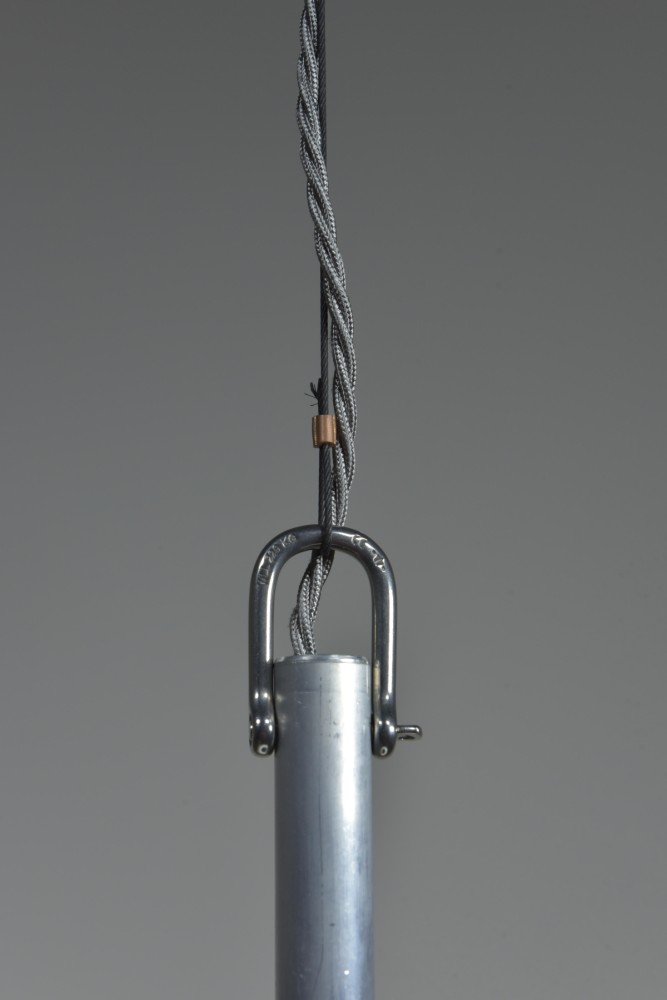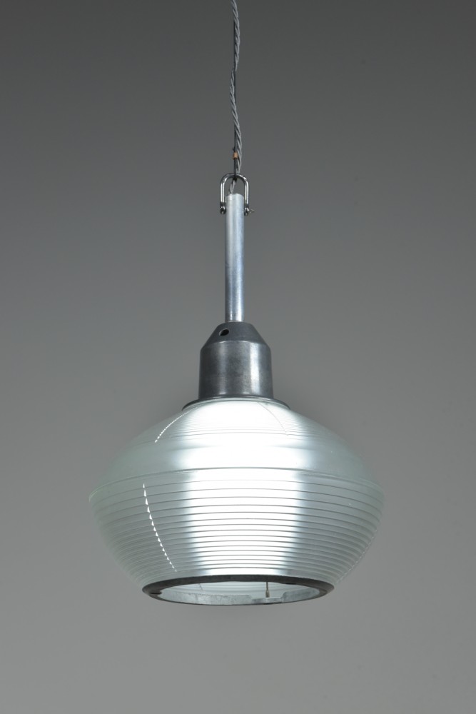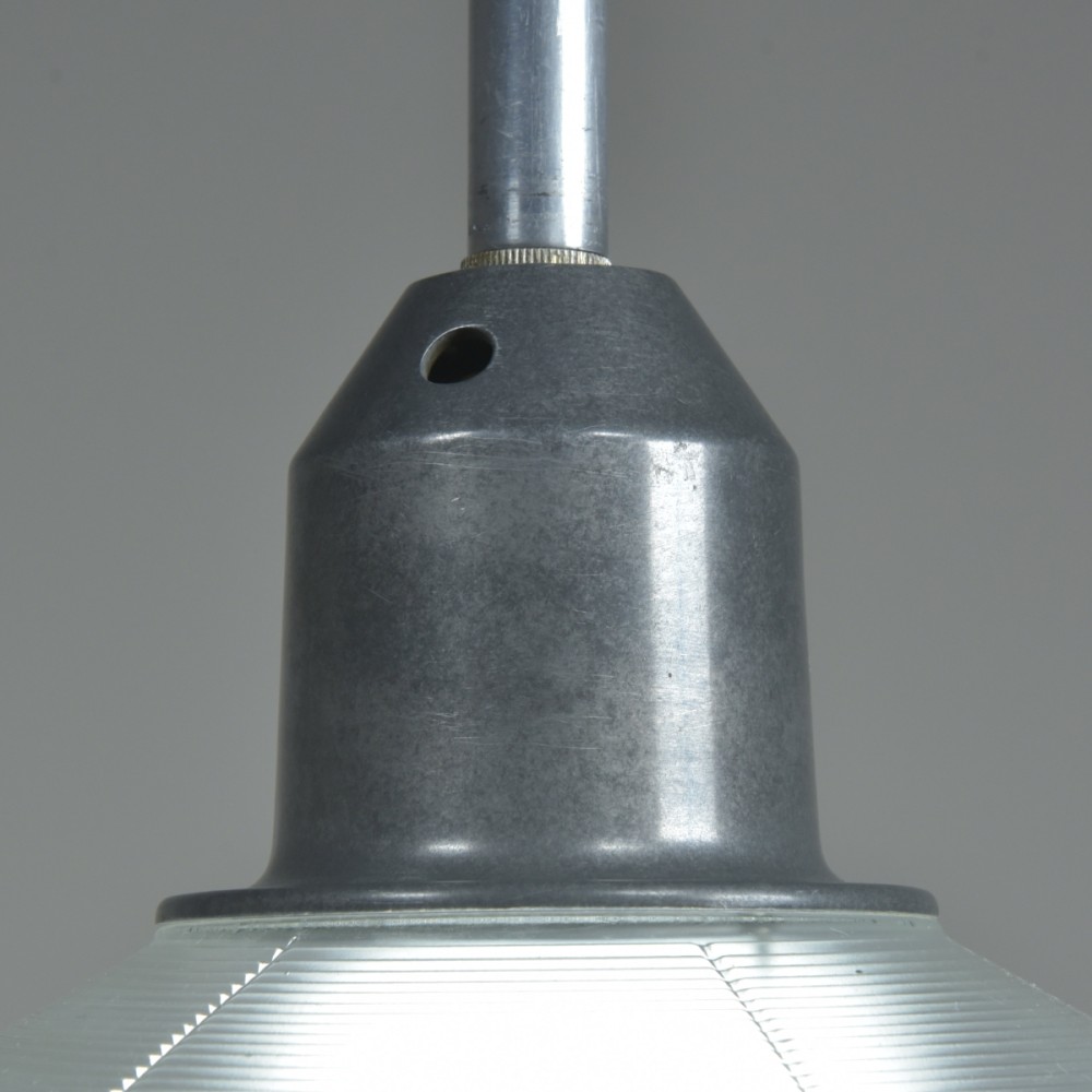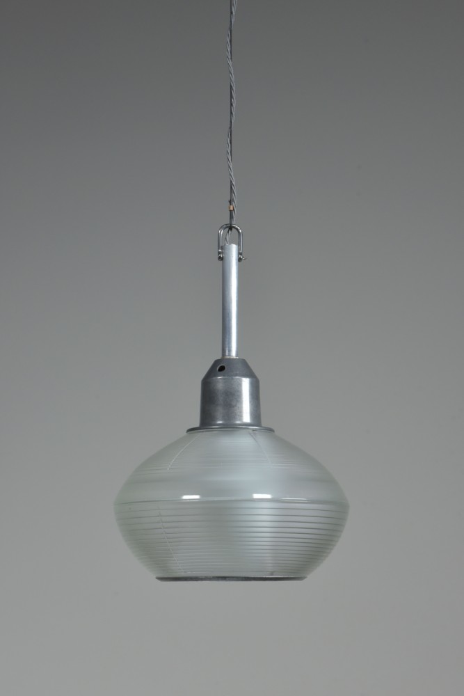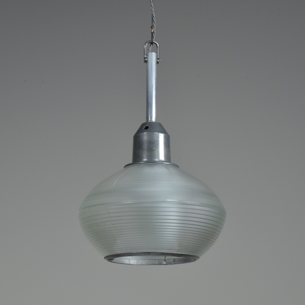 A set of four Holophane prismatic globe hanging lights. Approx 1940s. Great quality crisply cast glass satin etched to the inside. Good colour and quality aluminium gallery mounts. The original aluminium stems have been cut down and Wichard self locking stainless steel shackles fitted for hanging; in this case with wire to give a very sleek look. They can be hung this way or with chain. Rewired with 1.5m fabric flex. They retain their original GES porcelain lampholders and are supplied with ceramic adaptors for use with standard ES bulbs. The lit photos are mainly with a cooler (4200K) bulb but their is also an image with a regular/warmer (2700K) bulb. Dimensions in inches/cms; 11.5"/30cm diameter. 17.5"/45cm tall to the top of the shackle. 3.5kg. Priced individually. For more / higher res images please see my blog which can be accessed through the news section of this (haes) website.