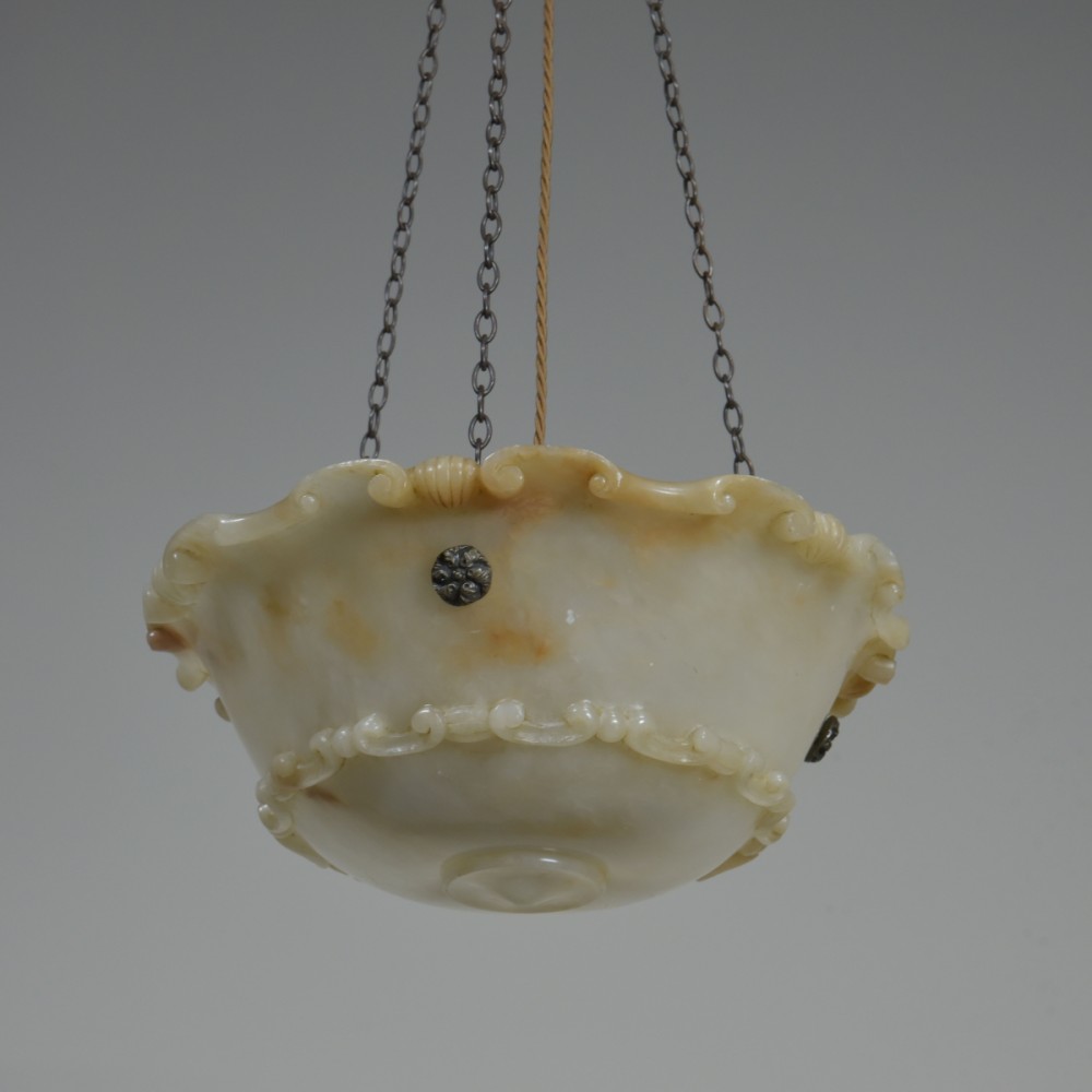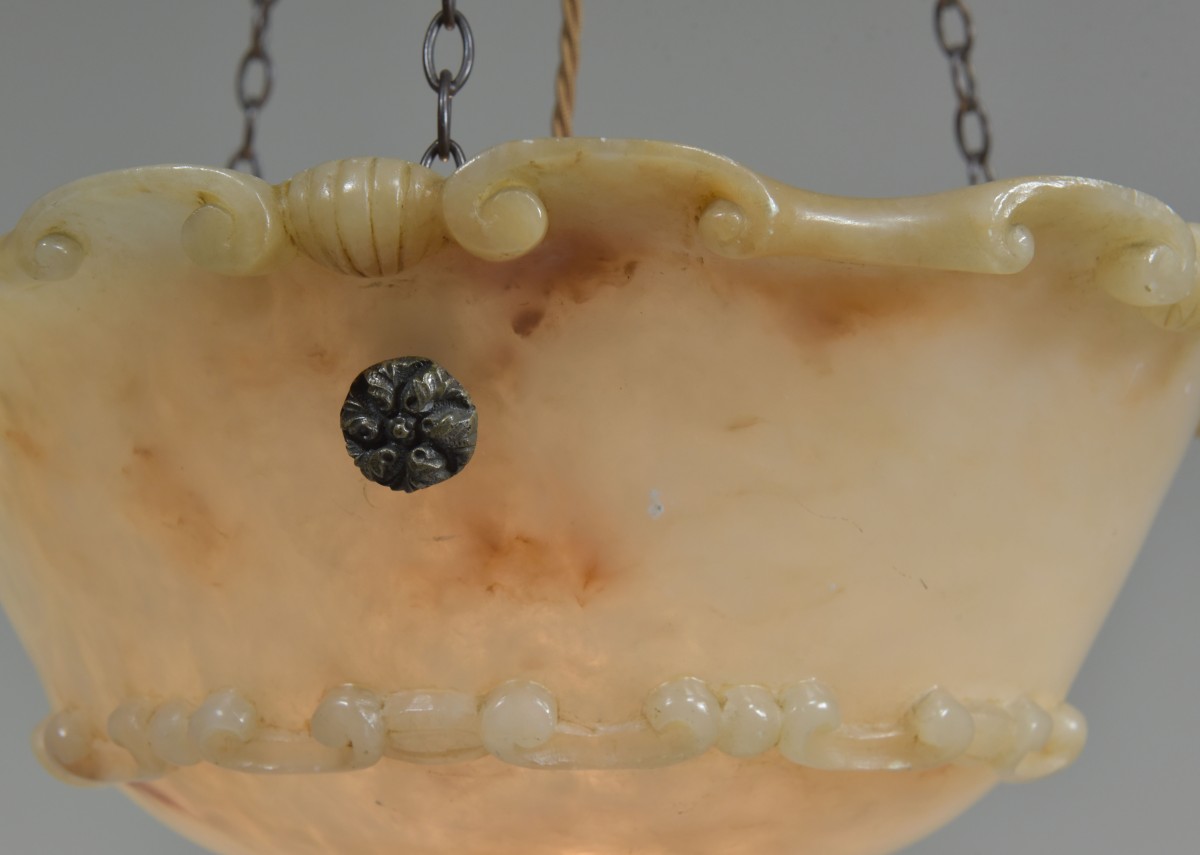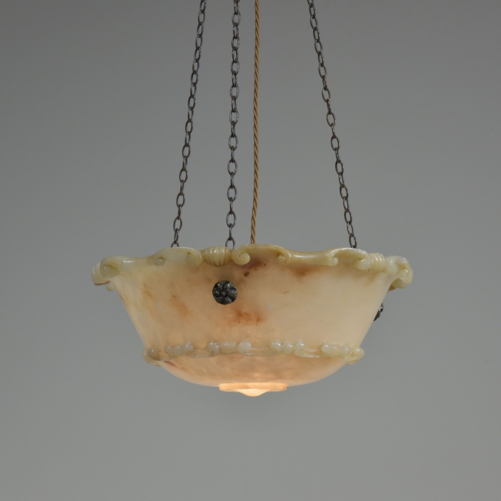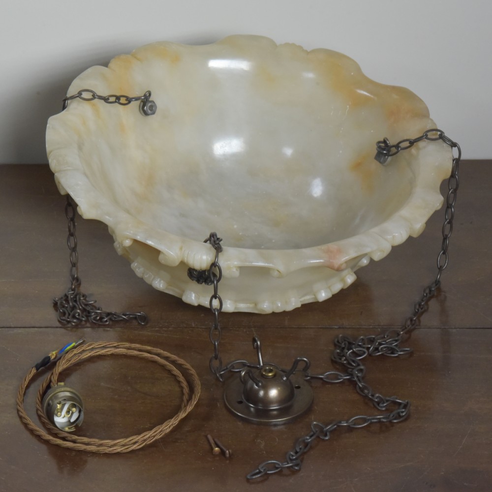 An antique alabaster bowl plafonnier with c scroll and shell decorative rim and band, floral rosette mounts and original quality brass chain. Excellent condition, lovely colour. English, early 20th century to 1920. Cleaned and waxed. Wired with 1.25m fabric flex, patinated brass cordgrip/BC lampholder. Supplied with patinated 3 hook ceiling plate (inc brass cable guide, earth, screws, cordgrip) and solid brass hanging chains (original). Dimensions in inches/cms; 14"/36cm diameter. 32"/80cm total drop (easily altered). Weight is 3.72kg. For more / higher res images please see my blog which can be accessed through the news section of this (haes) website.