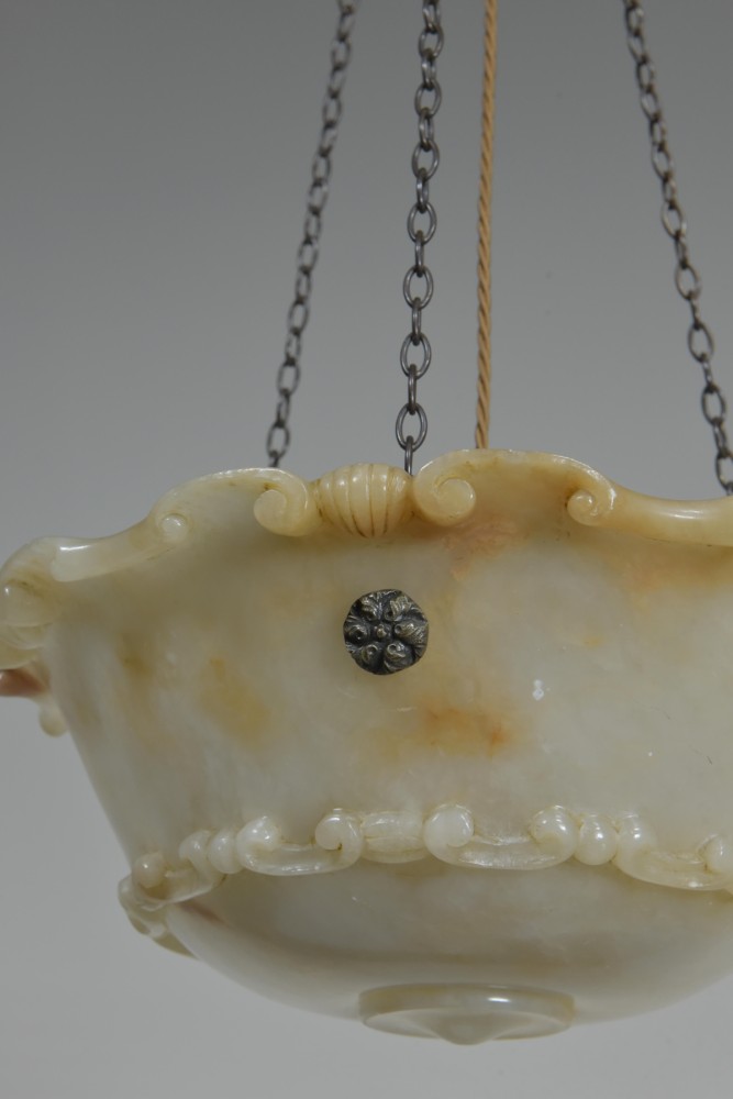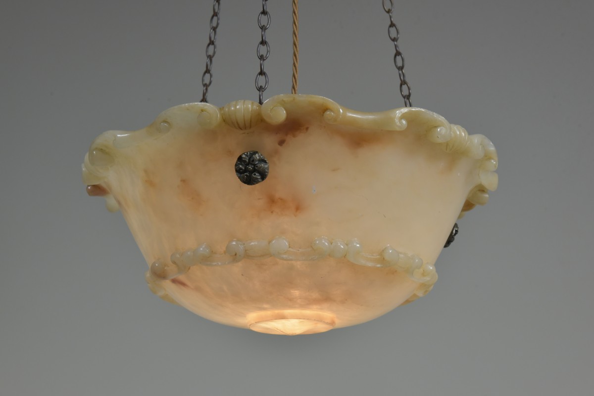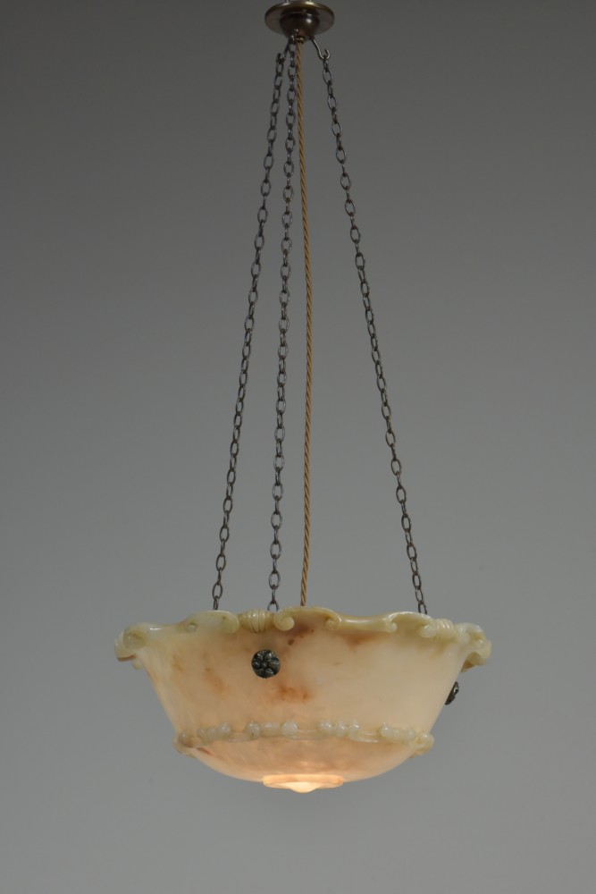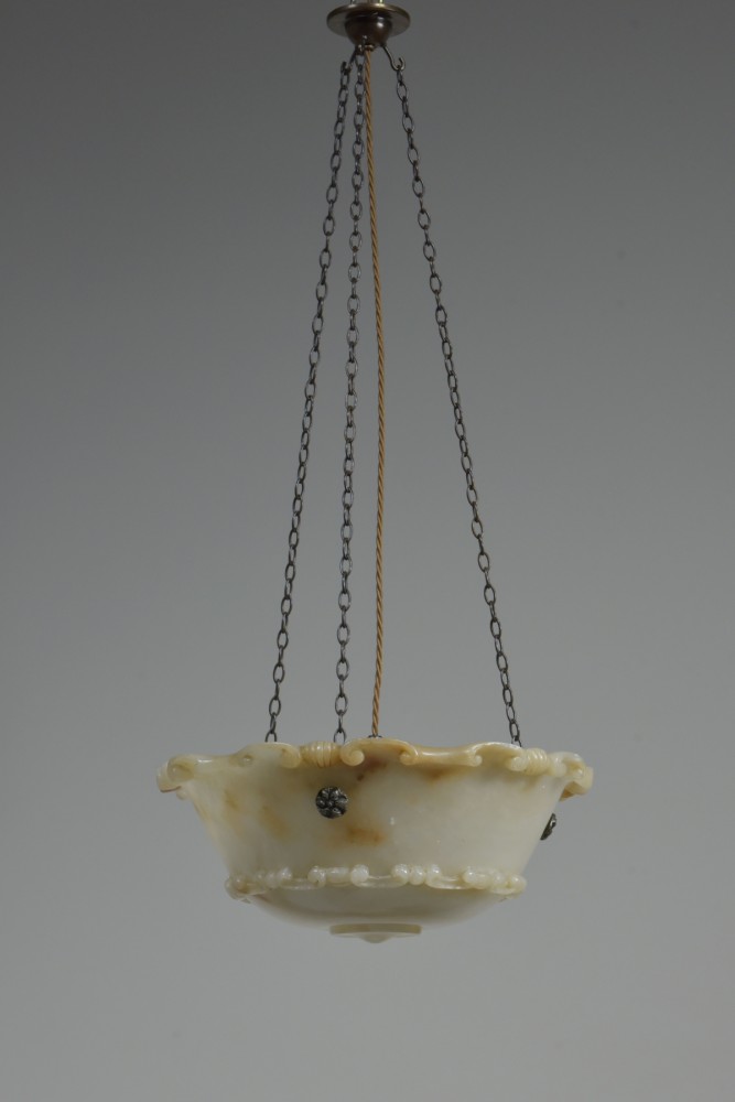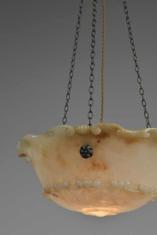 An antique alabaster bowl plafonnier with c scroll and shell decorative rim and band, floral rosette mounts and original quality brass chain. Excellent condition, lovely colour. English, early 20th century to 1920. Cleaned and waxed. Wired with 1.25m fabric flex, patinated brass cordgrip/BC lampholder. Supplied with patinated 3 hook ceiling plate (inc brass cable guide, earth, screws, cordgrip) and solid brass hanging chains (original). Dimensions in inches/cms; 14"/36cm diameter. 32"/80cm total drop (easily altered). Weight is 3.72kg. For more / higher res images please see my blog which can be accessed through the news section of this (haes) website.