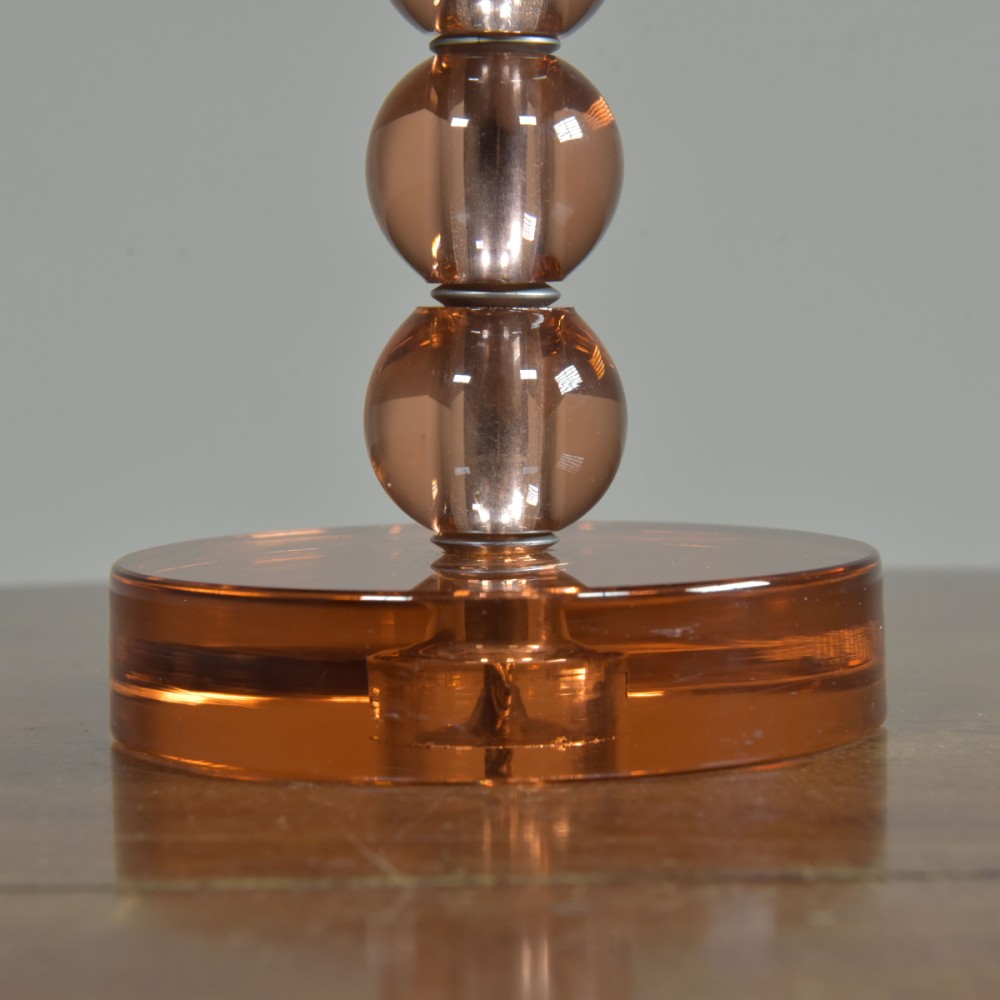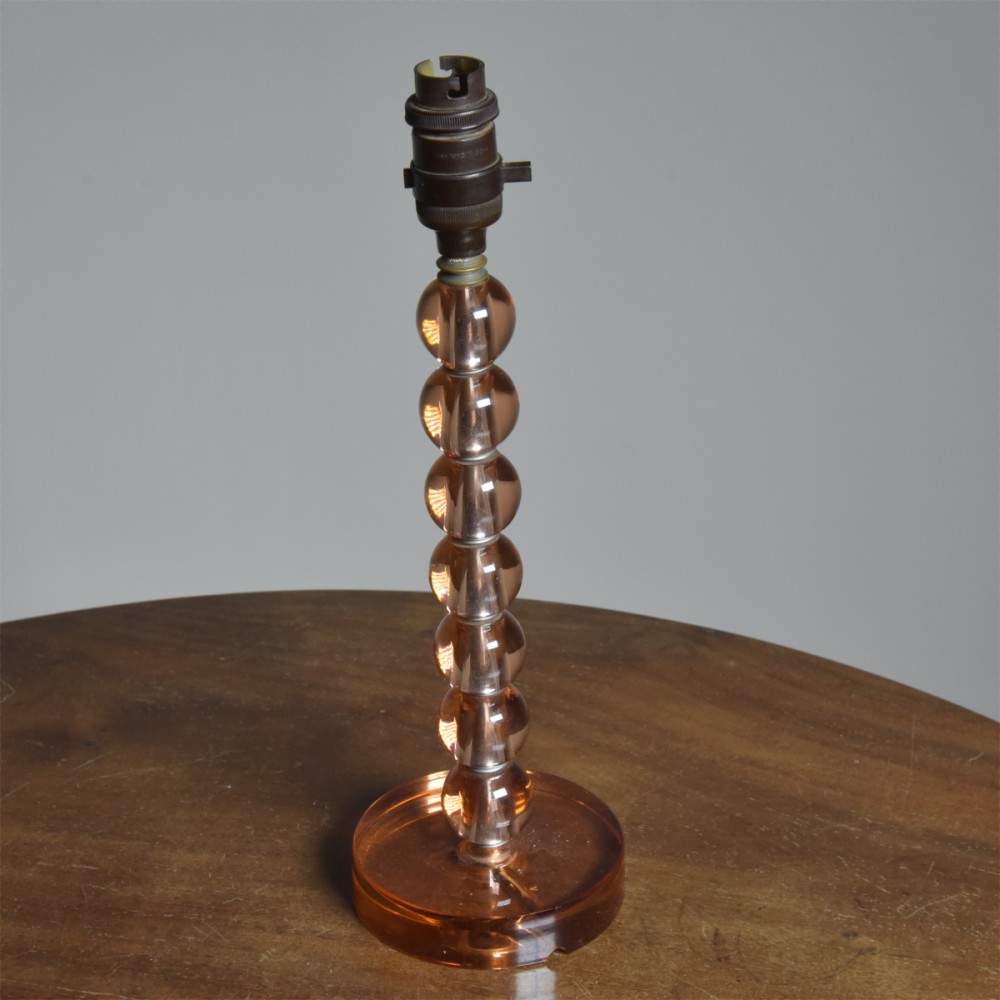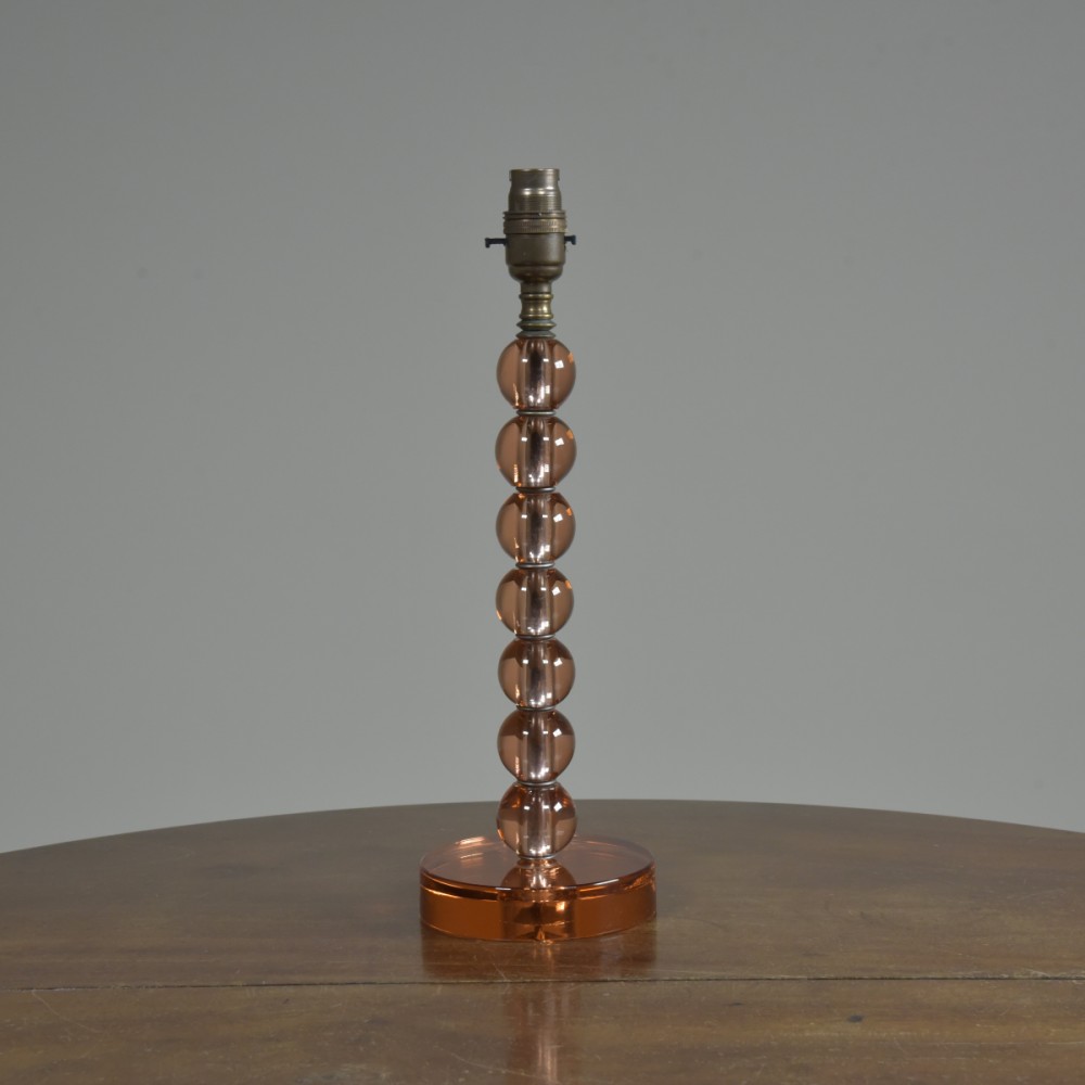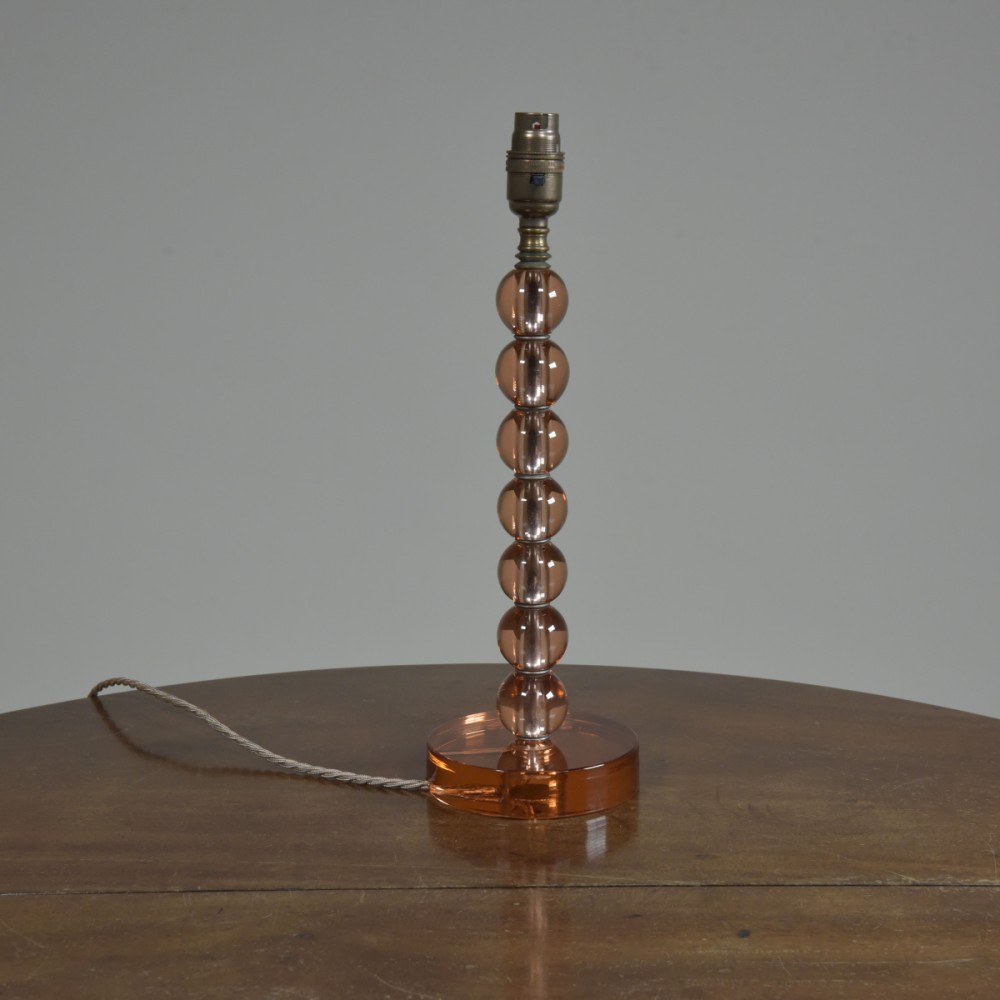 An antique stacked glass ball table lamp with circular glass disc base and faded nickel plated brass fittings. c1920/30s. In a champagne / peach colour..? I have one or two more similar (same model) lamps. Very good quality and excellent conditon . Two images show original lampholder and wiring. Rewired with 2.5 meters of fabric flex, a new patinated brass switched lampholder and a traditional style hard plastic plug. Pat tested. Dimensions in inches/cms; 14.5"/37cm tall inc lampholder. 4.625"/12cm base diameter. Weight is 1.44kg. For more / higher res images please see my blog which can be accessed through the news section of this (haes) website.
