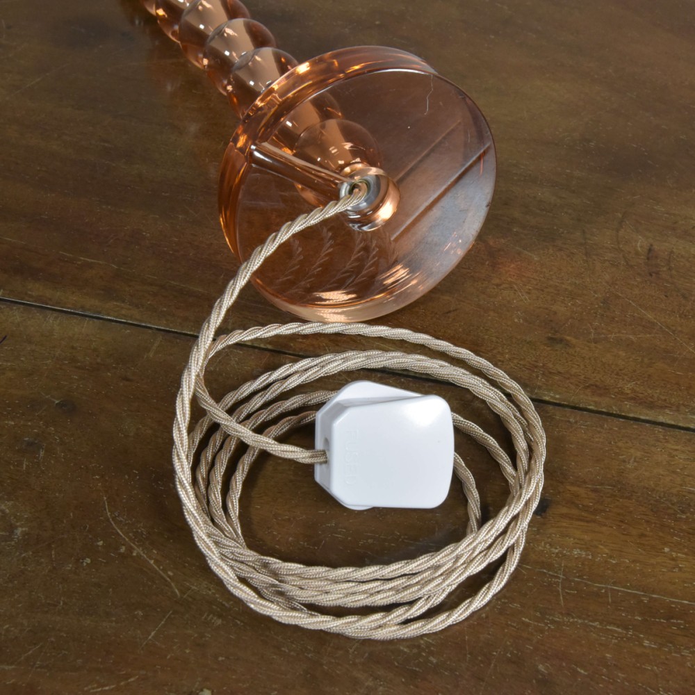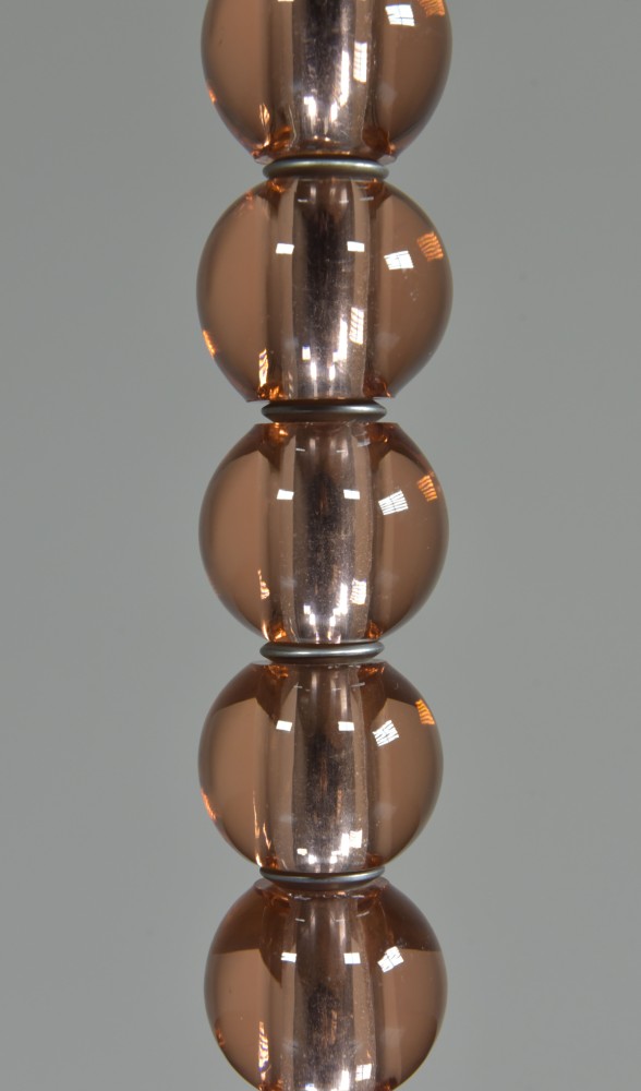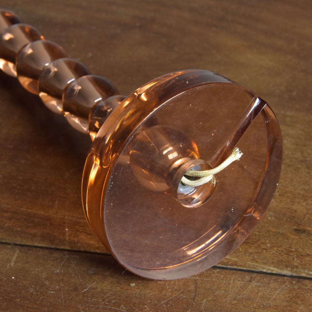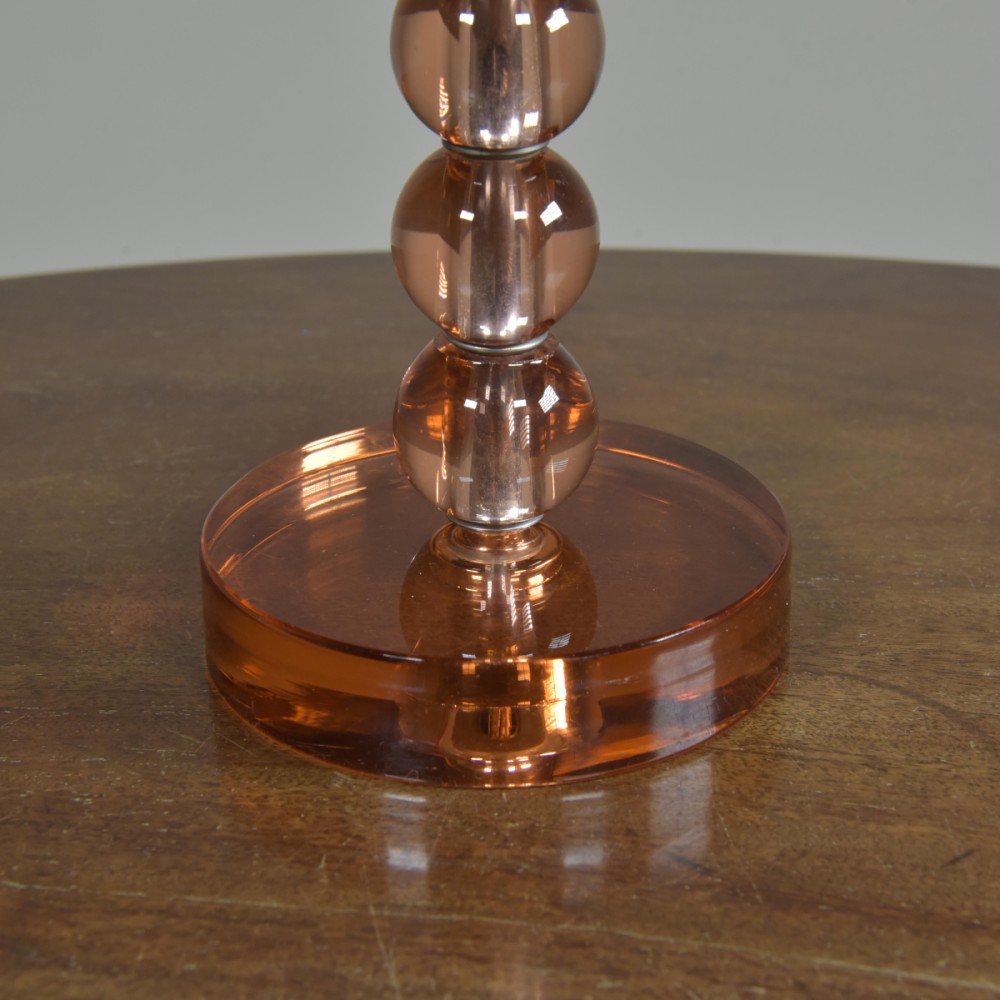 An antique stacked glass ball table lamp with circular glass disc base and faded nickel plated brass fittings. c1920/30s. In a champagne / peach colour..? I have one or two more similar (same model) lamps. Very good quality and excellent conditon . Two images show original lampholder and wiring. Rewired with 2.5 meters of fabric flex, a new patinated brass switched lampholder and a traditional style hard plastic plug. Pat tested. Dimensions in inches/cms; 14.5"/37cm tall inc lampholder. 4.625"/12cm base diameter. Weight is 1.44kg. For more / higher res images please see my blog which can be accessed through the news section of this (haes) website.