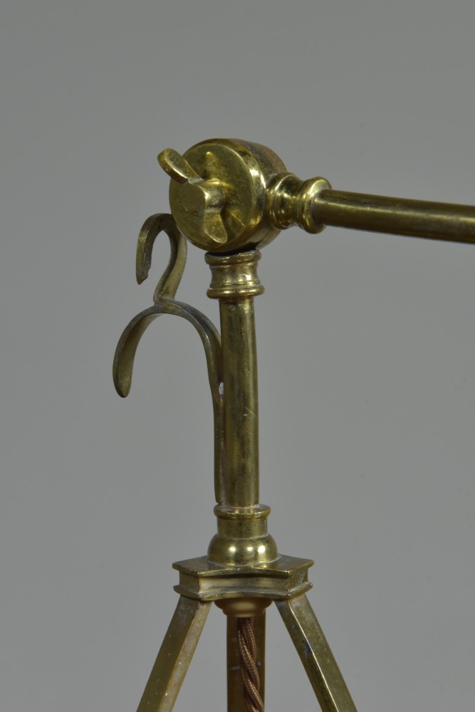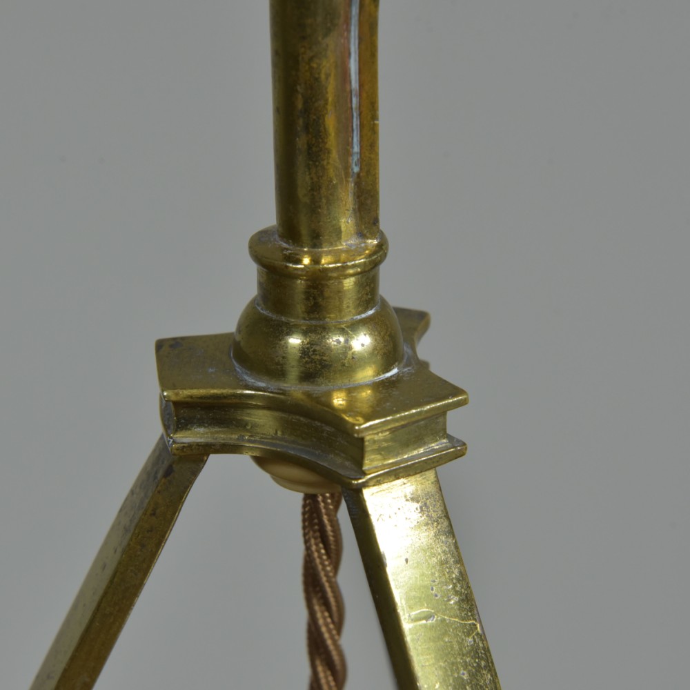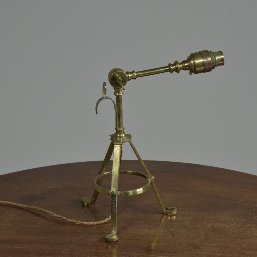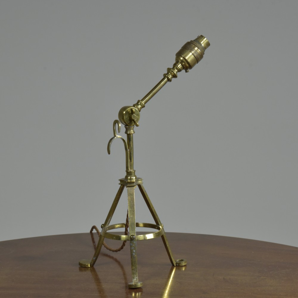 An antique gilt brass tripod / pullman table / wall lamp with articulated lampholder arm. English, early 20th century. Cleaned, light polish. Rewired using original switched BC lampholder, 2.5m fabric flex, 3amp plug. Earthed. Pat tested. Approx 16"/41cm tall. 0.8kg. For more / higher res images please see my blog which can be accessed through the news section of this (haes) website.