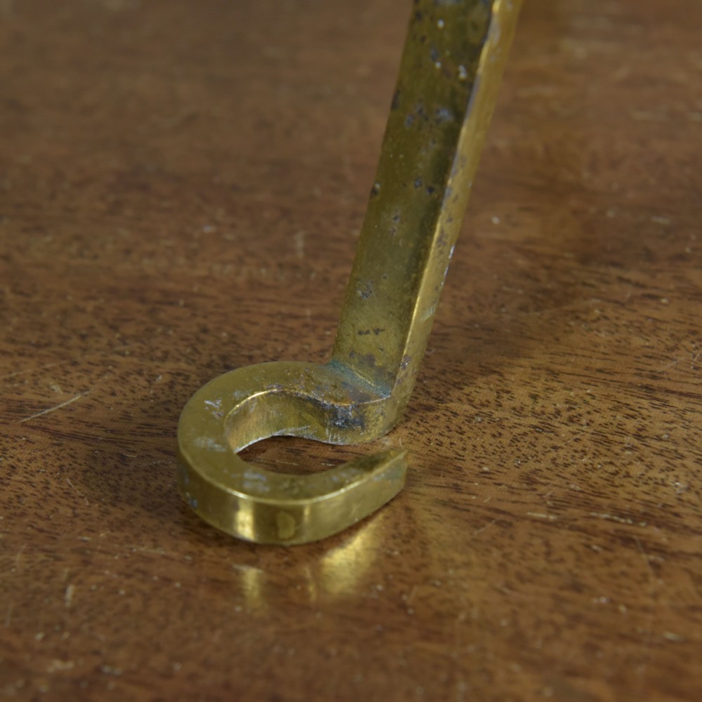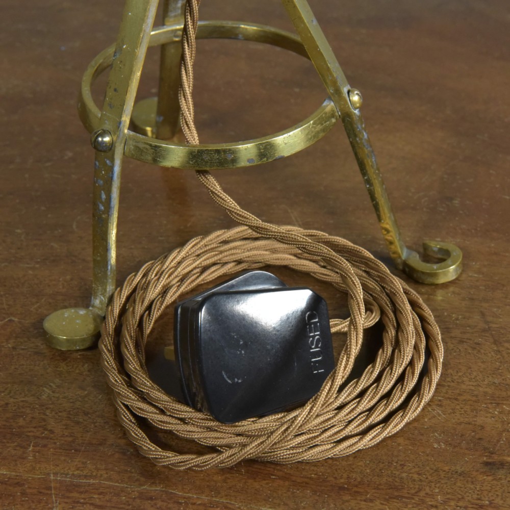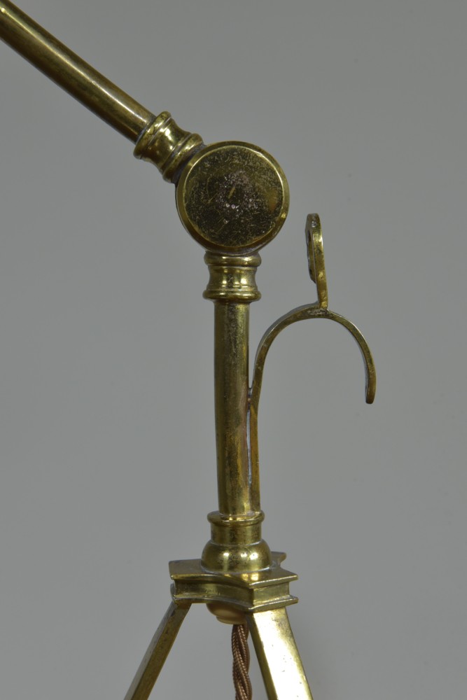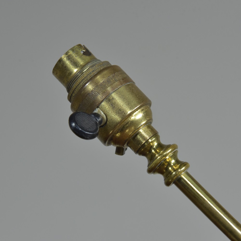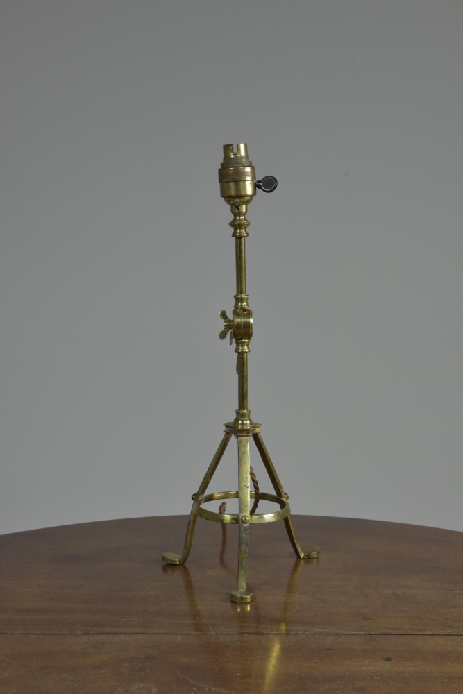 An antique gilt brass tripod / pullman table / wall lamp with articulated lampholder arm. English, early 20th century. Cleaned, light polish. Rewired using original switched BC lampholder, 2.5m fabric flex, 3amp plug. Earthed. Pat tested. Approx 16"/41cm tall. 0.8kg. For more / higher res images please see my blog which can be accessed through the news section of this (haes) website.
