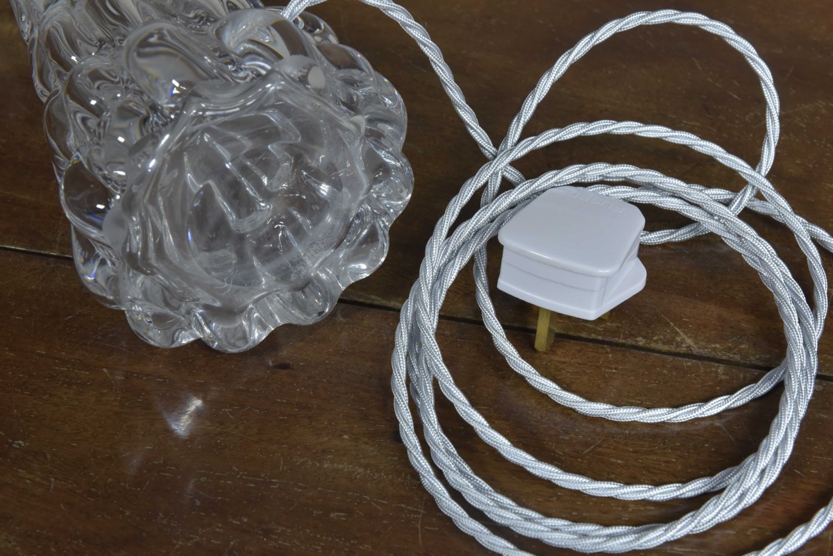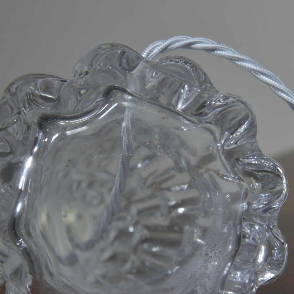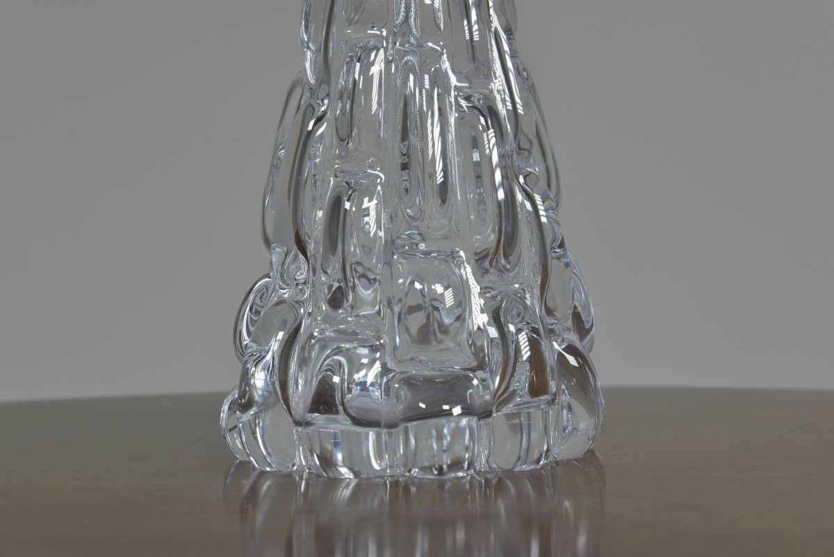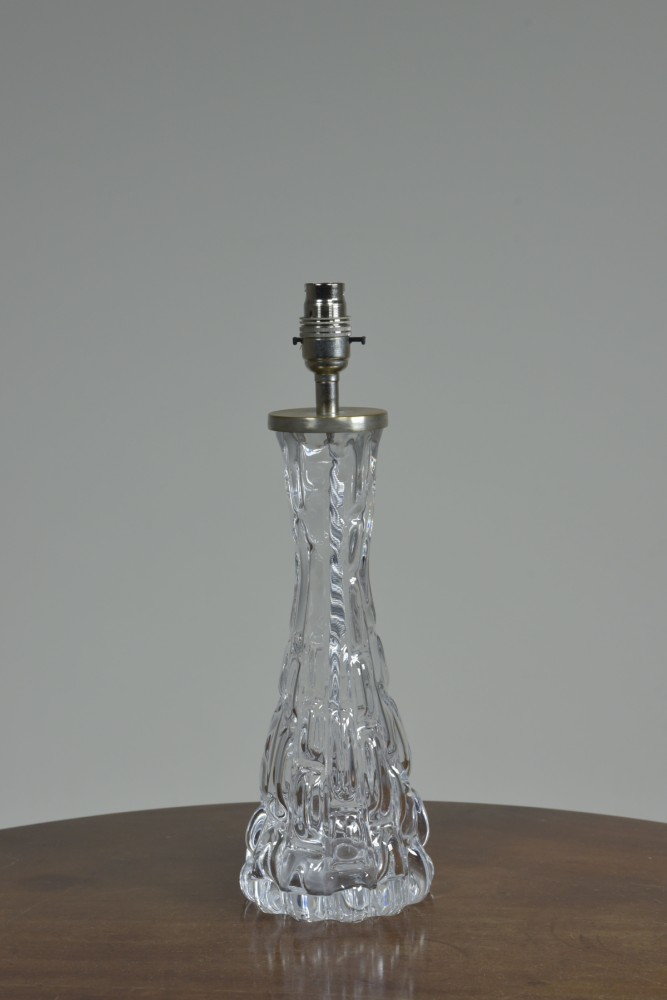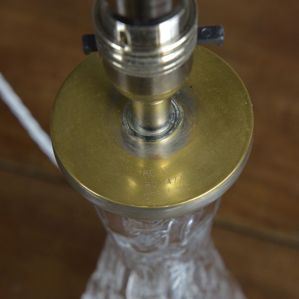 A 1970s crystal glass table lamp by Carl Fagerlund for Orrefors. Swedish. Signed ORREFORS RD 1477 to base and to the nickel plated brass top cap (faded). Cleaned and rewired with 3m fabric flex, nickel plated brass safety-switched lampholder, 3amp traditional white phenolic plug. Pat tested. Dimensions in inches/cms; 15"/38cm tall inc. lampholder (12"/31cm glass base only). 5"/12.5cm base diameter. Weight is 2.12kg. ** Please note i have a further similar lamp in stock (ID: 40417) - the same model and size which would make a very close pair . I also have a much larger pair in this model **. For more / higher res images please see my blog which can be accessed through the news section of this (haes) website.