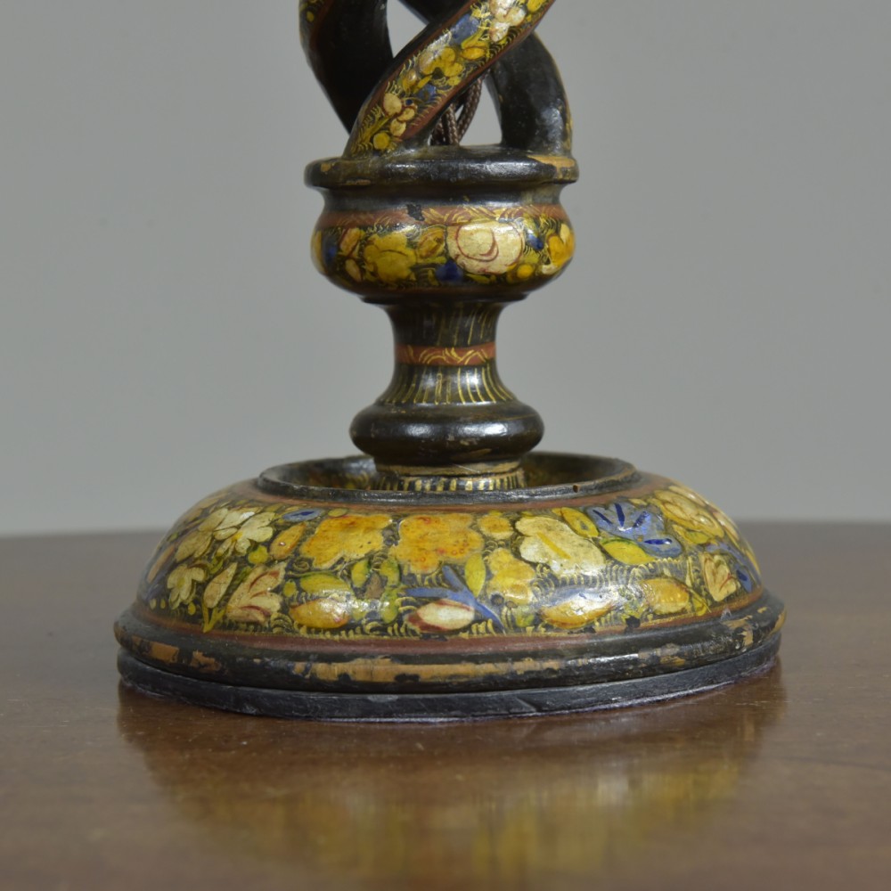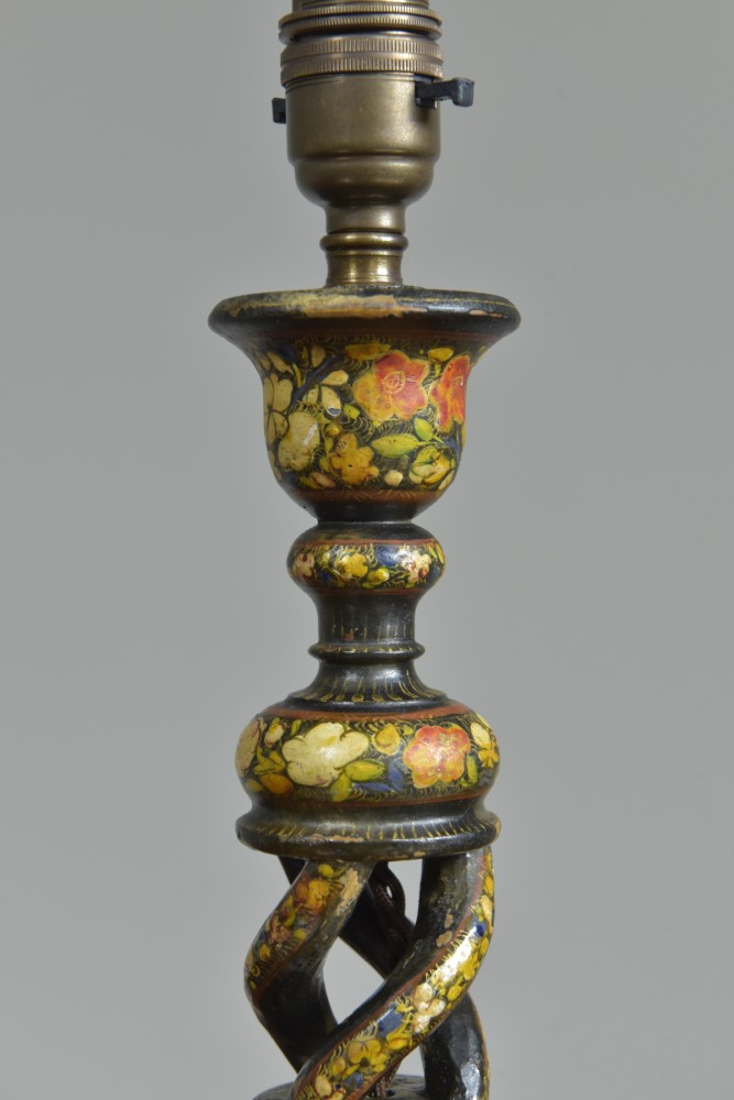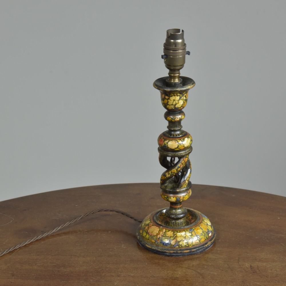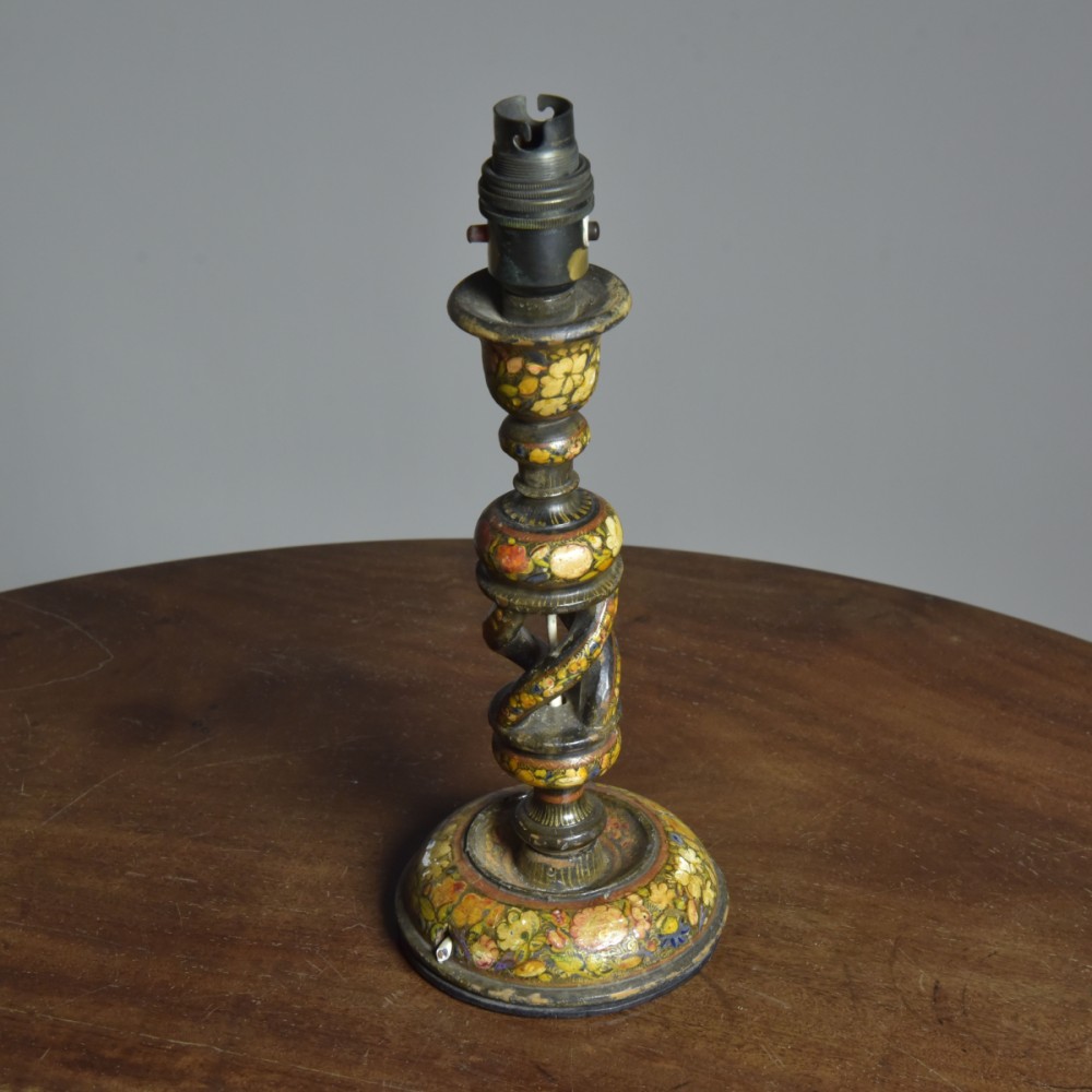 A small antique Kashmiri spiral turned lamp in very good condition. c1920. Fully restored; cleaned, lead disc to base rescrewed, new fabric base. Rewired with 2.5 meters of fabric flex, a new patinated brass switched lampholder and a traditional style hard plastic plug. Pat tested. Two images show lamp before restoration. Dimensions in inches/cms; 12.5"/32cm tall inc lampholder. 4.75"/12cm base diameter. Weight is 0.86kg. For more / higher res images please see my blog which can be accessed through the news section of this (haes) website.
