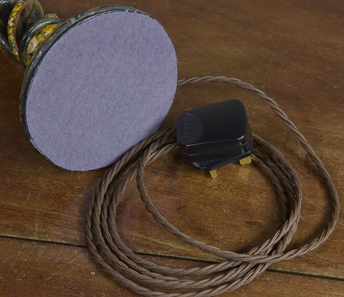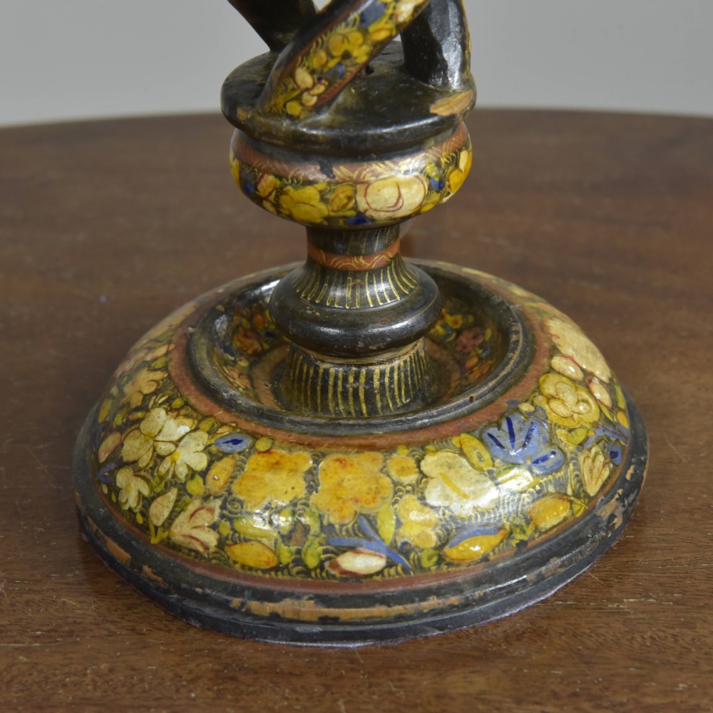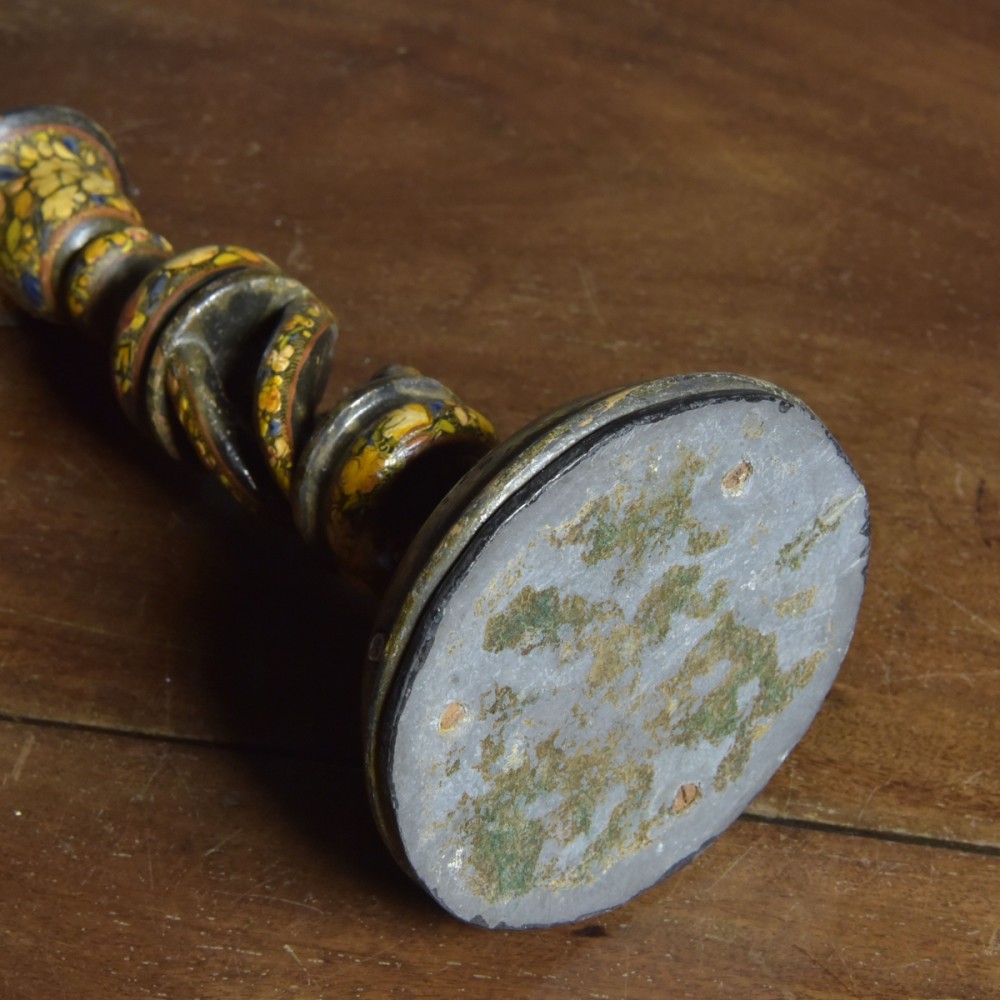 A small antique Kashmiri spiral turned lamp in very good condition. c1920. Fully restored; cleaned, lead disc to base rescrewed, new fabric base. Rewired with 2.5 meters of fabric flex, a new patinated brass switched lampholder and a traditional style hard plastic plug. Pat tested. Two images show lamp before restoration. Dimensions in inches/cms; 12.5"/32cm tall inc lampholder. 4.75"/12cm base diameter. Weight is 0.86kg. For more / higher res images please see my blog which can be accessed through the news section of this (haes) website.