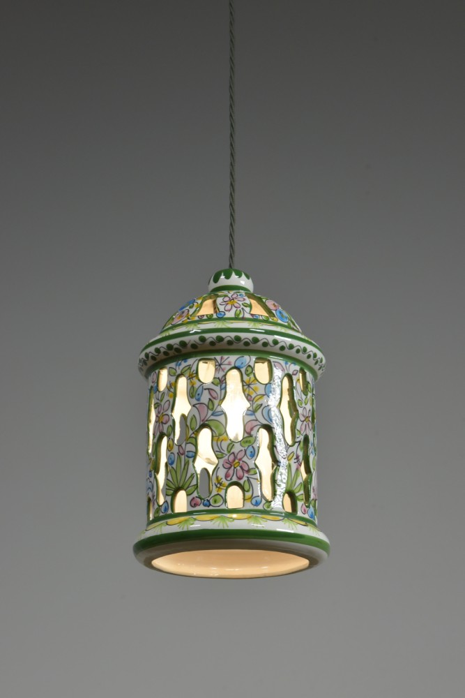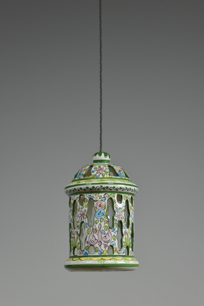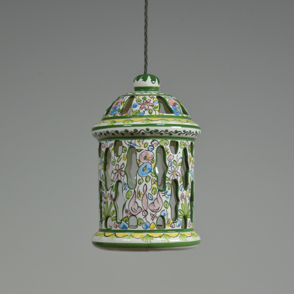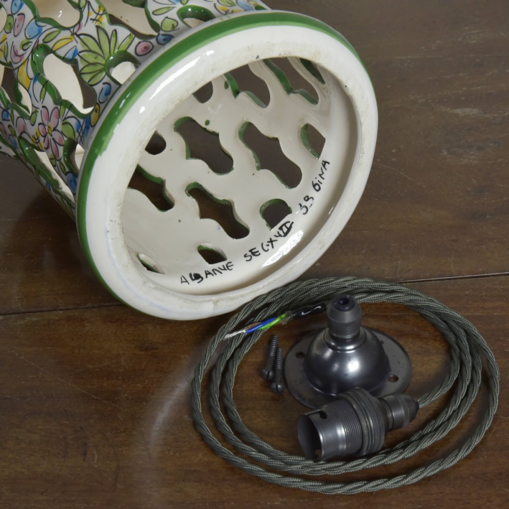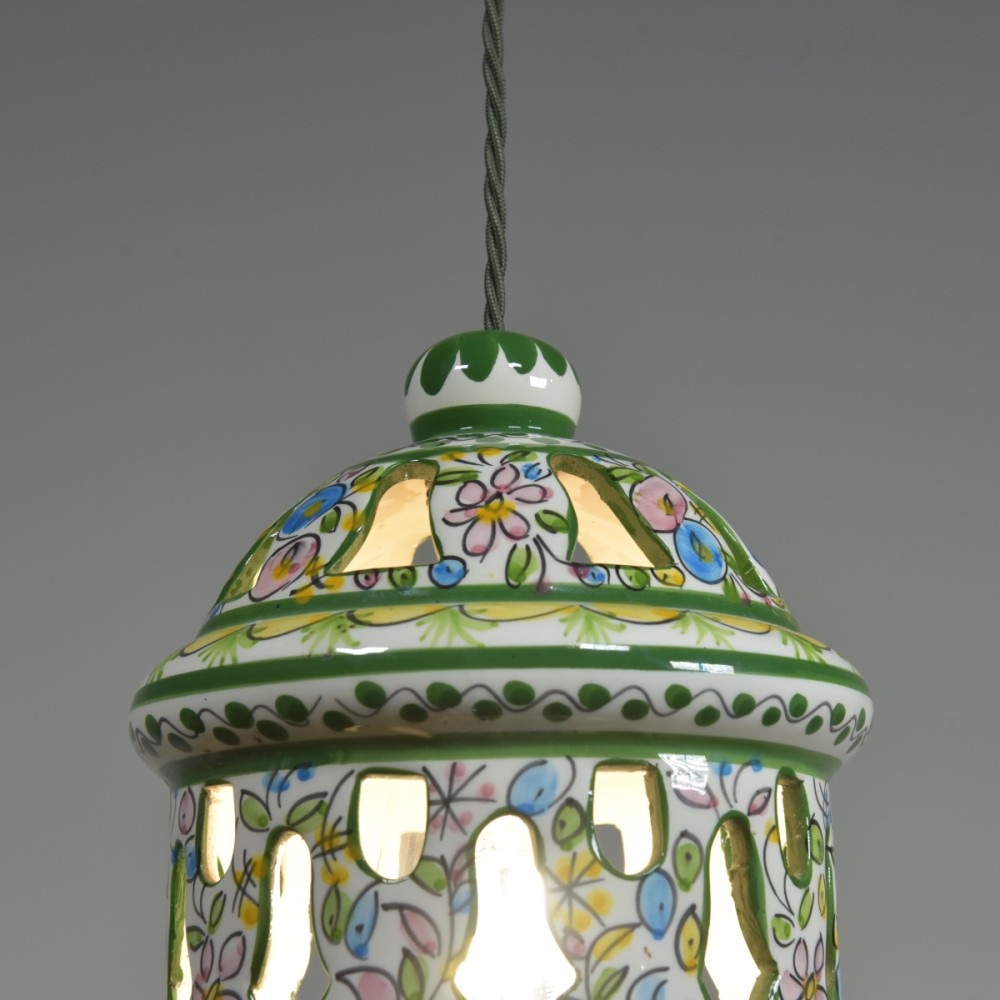 A jolly vintage Portuguese pottery pendant light / lantern. Approx. mid century. Painted floral decoration on white ground. Perfect condition. Wired with 1.5m fabric flex, bronzed cordgrip /BC lampholder. Supplied with bronzed brass ceiling plate / cordgrip (inc. earth and vintage slotted black round head screws). Dimensions in inches/cms; 11"/28cm tall inc lampholders. 7"/18cm base diameter. Weight is 1.04kg. For more / higher res images please see my blog which can be accessed through the news section of this (haes) website.