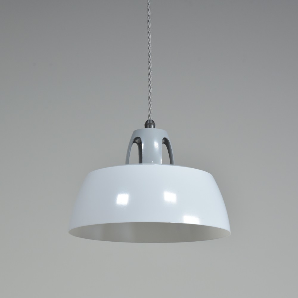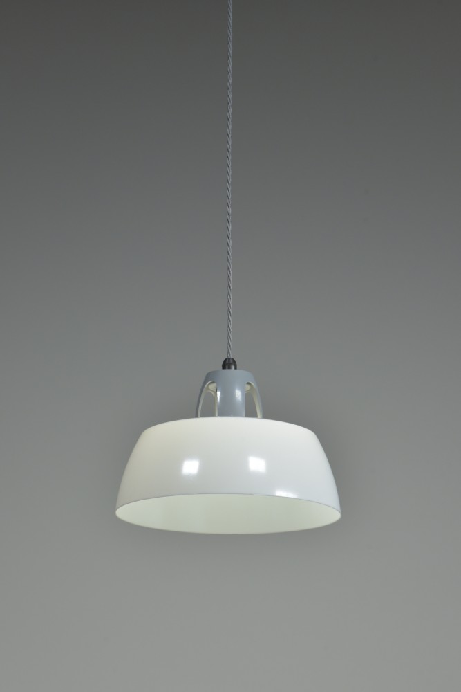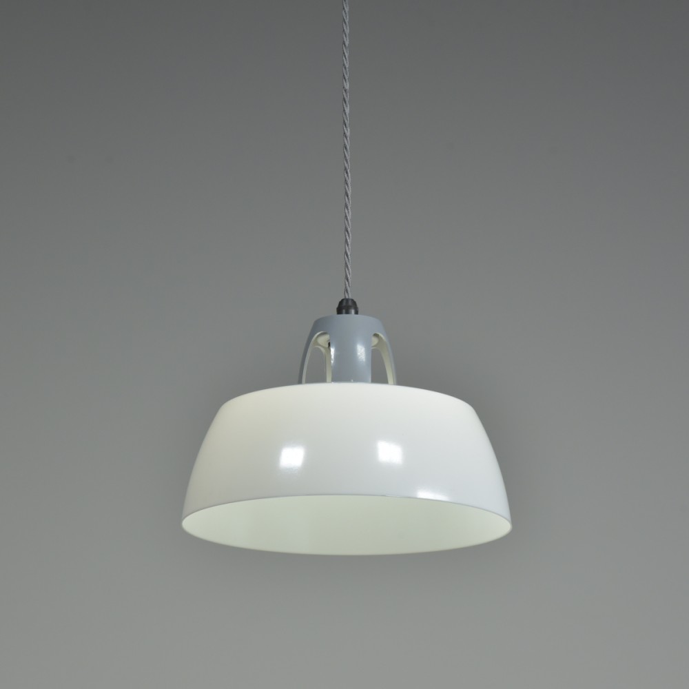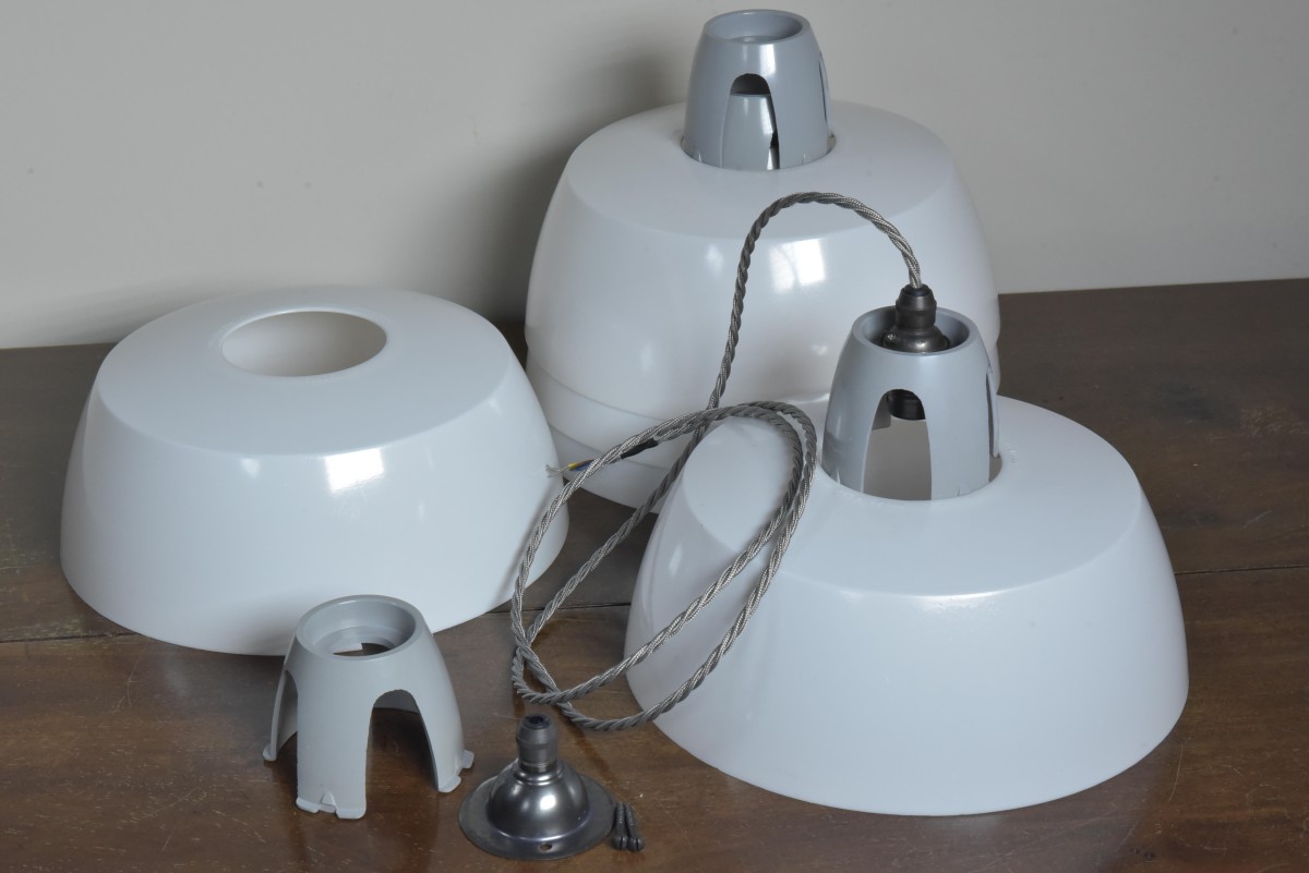 Rarely seen (only ones i have ever had) vintage plastic coolicon pendant shade lights. Only 5 of. Excellent condition. Mid century ish. White shades, grey snap in galleries. Plastic is not brittle or misshapen or discoloured. Marked to shades; BRITISH MADE 100W BS161 REGD. DES. PEND. COOLICON. Supplied wired with 1m fabric flex, patinated brass cordgrip /BC lampholder, patinated brass cordgrip / ceiling plate with earth and vintage slotted brass screws (see image). Photograhed with grey fabric flex but could be supplied with different colours. Dimensions in inches/cms; 10"/25.5cm diameter. 7"/18cm tall inc. cordgrip. For more / higher res images please see my blog which can be accessed through the news section of this (haes) website.