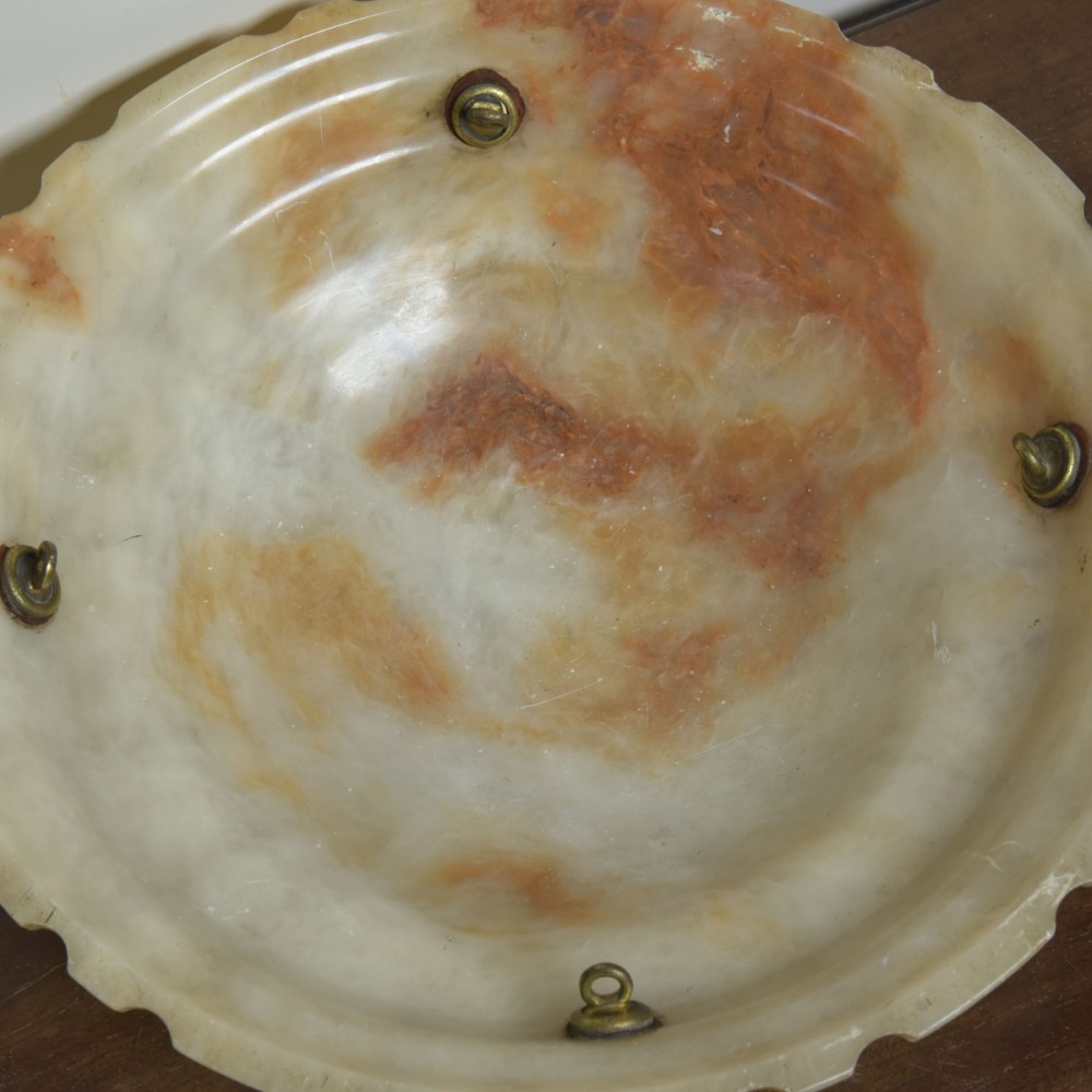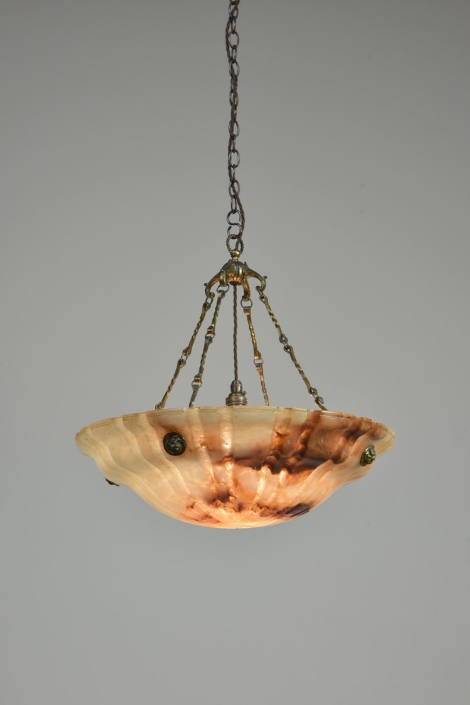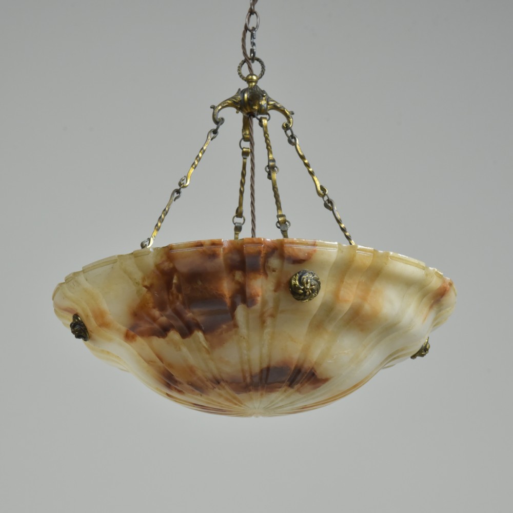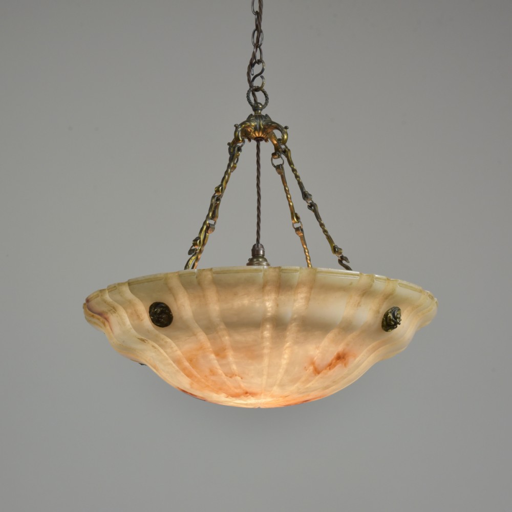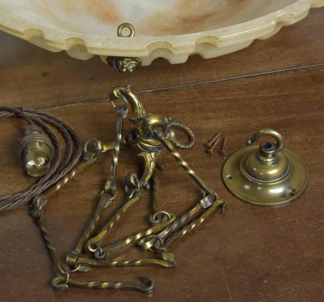 An antique fluted bowl alabaster plafonnier with original gilt brass parts; four arm "hanger", twisted linked arm chains and rosette mounts. English, early 20th century. Excellent condition, bowl intact. Ready to go, cleaned and waxed. Wired with 1.5m fabric flex, patinated brass cordgrip / BC lampholder. Supplied with a good antique hooked ceiling plate and vintage patinated brass slotted screws. See image to show all parts supplied. Dimensions in inches/cms; 18"/46cm diameter. 17"/44cm drop (top of hanger loop to base of bowl). The hooked ceiling plate will add another couple of inches and any more drop required achieved by adding chain between the ceiling hook and hanger loop. Weight is 6.1kg. For more / higher res images please see my blog which can be accessed through the news section of this (haes) website.