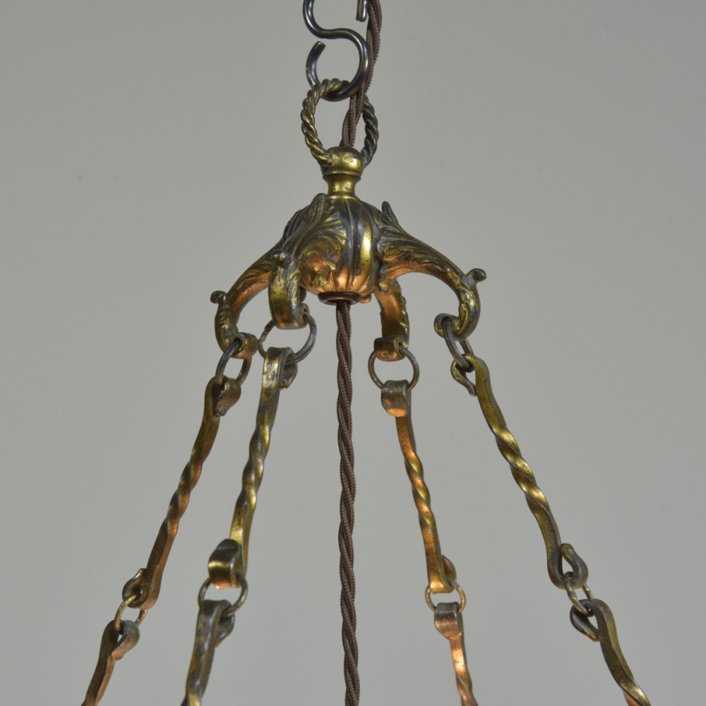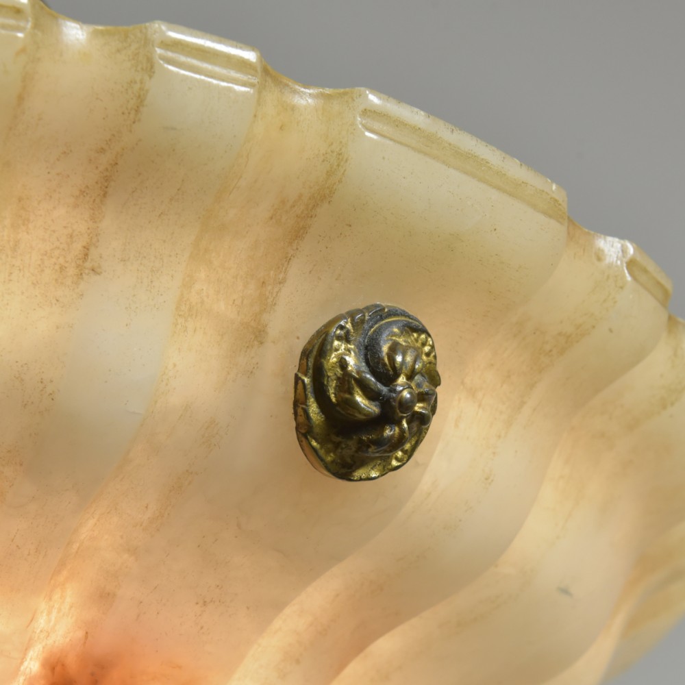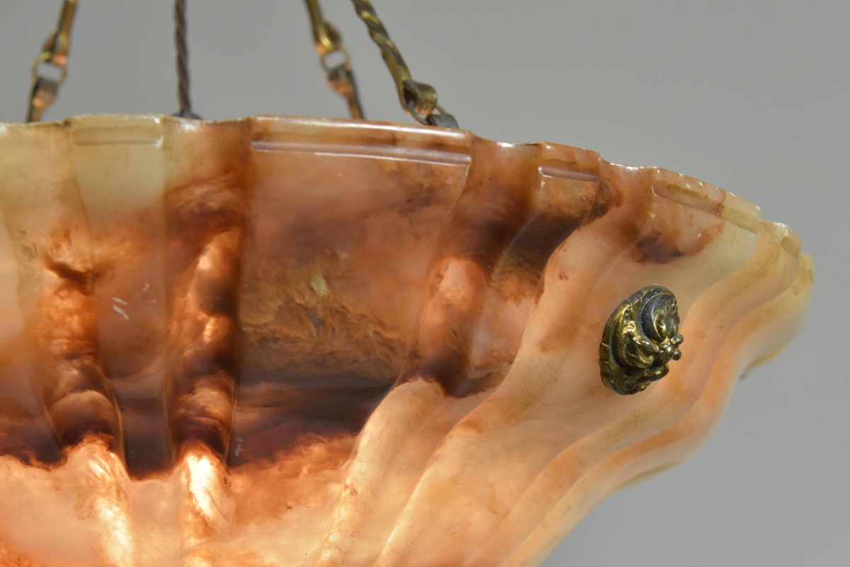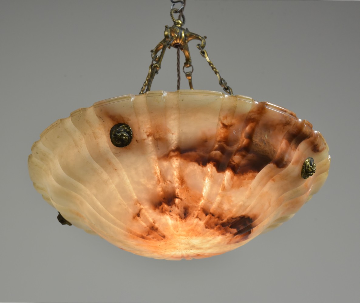An antique fluted bowl alabaster plafonnier with original gilt brass parts; four arm "hanger", twisted linked arm chains and rosette mounts. English, early 20th century. Excellent condition, bowl intact. Ready to go, cleaned and waxed. Wired with 1.5m fabric flex, patinated brass cordgrip / BC lampholder. Supplied with a good antique hooked ceiling plate and vintage patinated brass slotted screws. See image to show all parts supplied. Dimensions in inches/cms; 18"/46cm diameter. 17"/44cm drop (top of hanger loop to base of bowl). The hooked ceiling plate will add another couple of inches and any more drop required achieved by adding chain between the ceiling hook and hanger loop. Weight is 6.1kg. For more / higher res images please see my blog which can be accessed through the news section of this (haes) website.