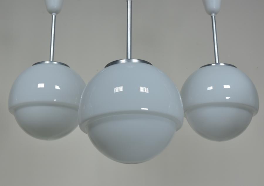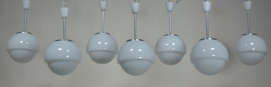A run of vintage stepped opaline / white glass globes with galvanised galleries and stems with plastic collars and ceiling caps.Please note plastic is robust and not brittle.Original porcelain lampholders. They have been rewired and can fit to the ceiling or hung as shown but could be supplied with the stem cut down and a new hook or loop fitted(extra cost) Originate from Russia. 35 remaining.Plus one with a different shaped globe. Dimensions in inches/cms; 9.25 inches/23.5cms max diameter 19inches/48cms max height or drop. The price is per light fitting. For more / higher res images please see my blog which can be accessed through the news section of this (haes) website.